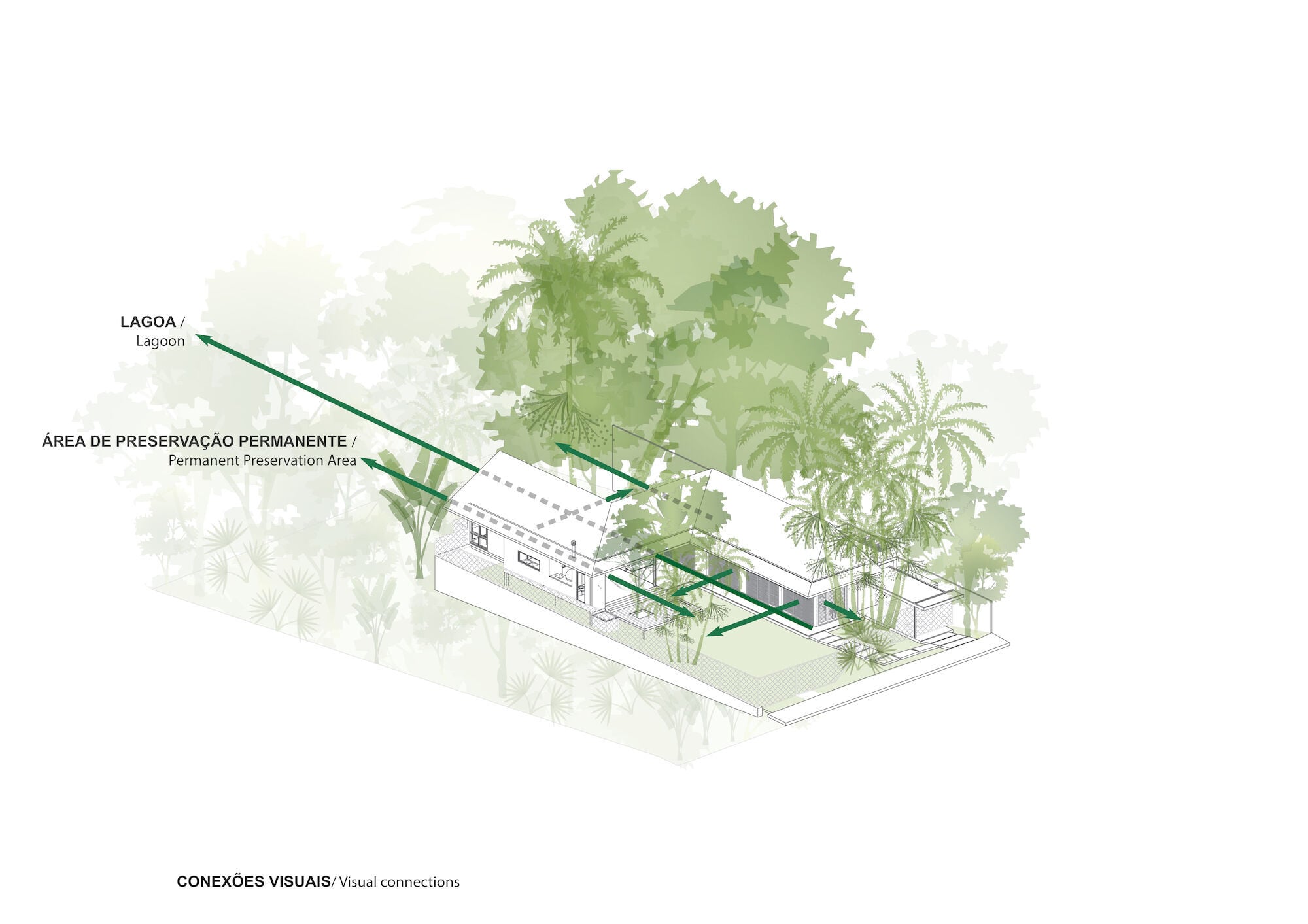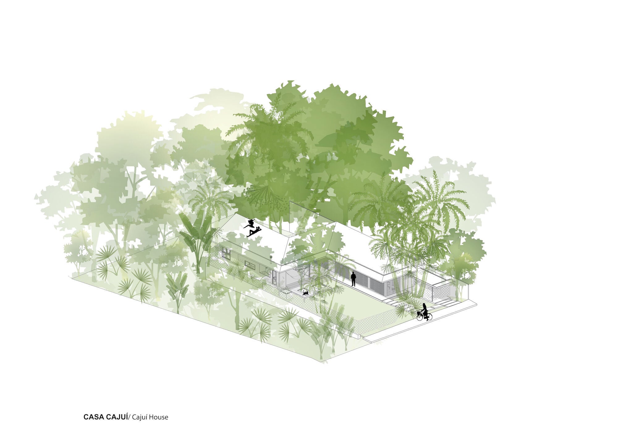 Casa Cajuí được xây dựng trên một khu đất tiếp giáp khu bảo tồn môi trường, nơi có nhiều cây lớn, thảm thực vật rậm rạp và cảnh quan rừng đặc trưng. Với bối cảnh này, kiến trúc sư không xem khu đất là “mặt bằng trống” để xây dựng, mà coi đây là một hệ sinh thái sống cần được tôn trọng.