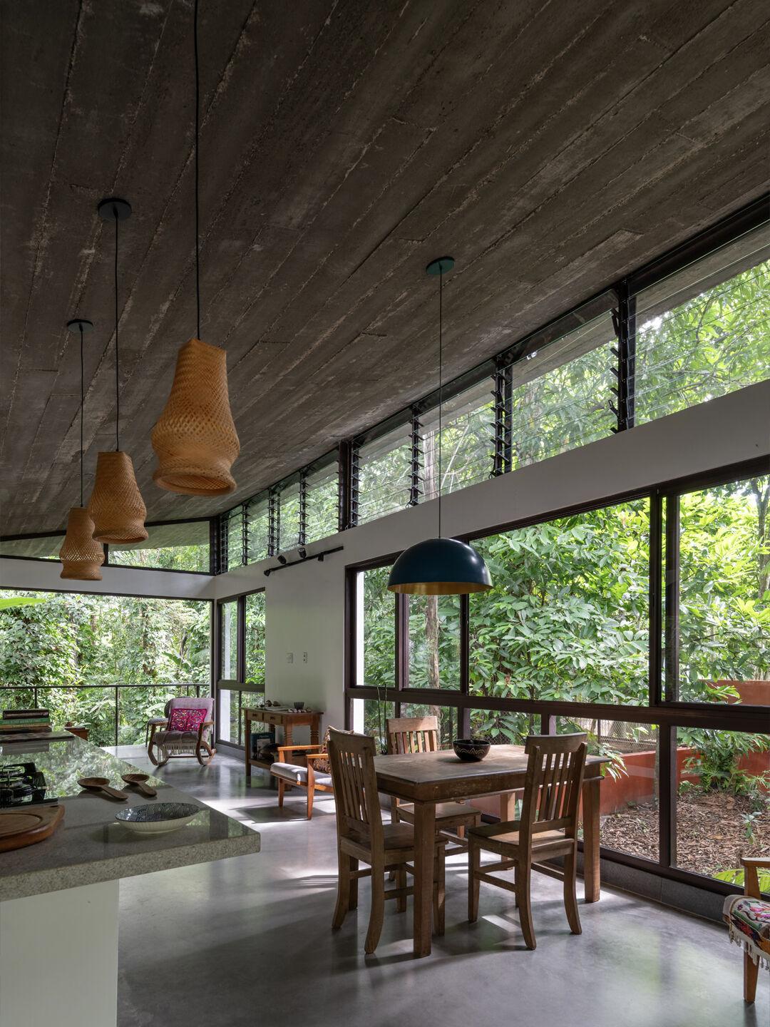 Ngược lại, toàn bộ không gian sinh hoạt chung như phòng khách, bếp và khu ăn uống được đưa lùi sâu về phía cuối khu đất và nâng cao nhẹ so với mặt đất. Việc nâng cốt nền (raised floor - sàn được nâng cao hơn mặt đất tự nhiên) giúp không gian này có tầm nhìn thoáng đãng hơn ra khu rừng phía sau, đồng thời hạn chế ẩm thấp trong điều kiện khí hậu nhiệt đới.