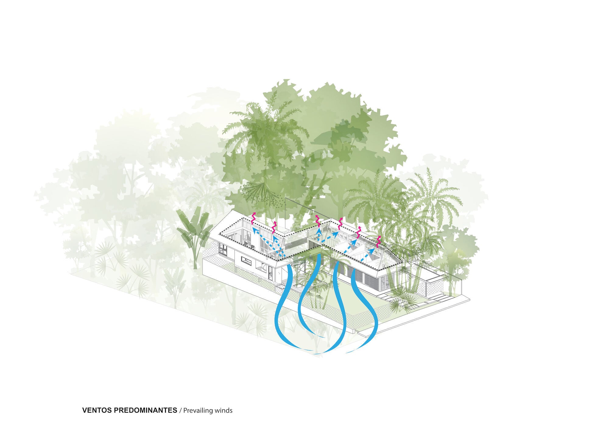 Luồng gió chủ đạo được dẫn xuyên qua các khoảng mở và hiên nhà. Thiết kế này giúp không gian luôn thông thoáng, giảm phụ thuộc vào điều hòa cơ học