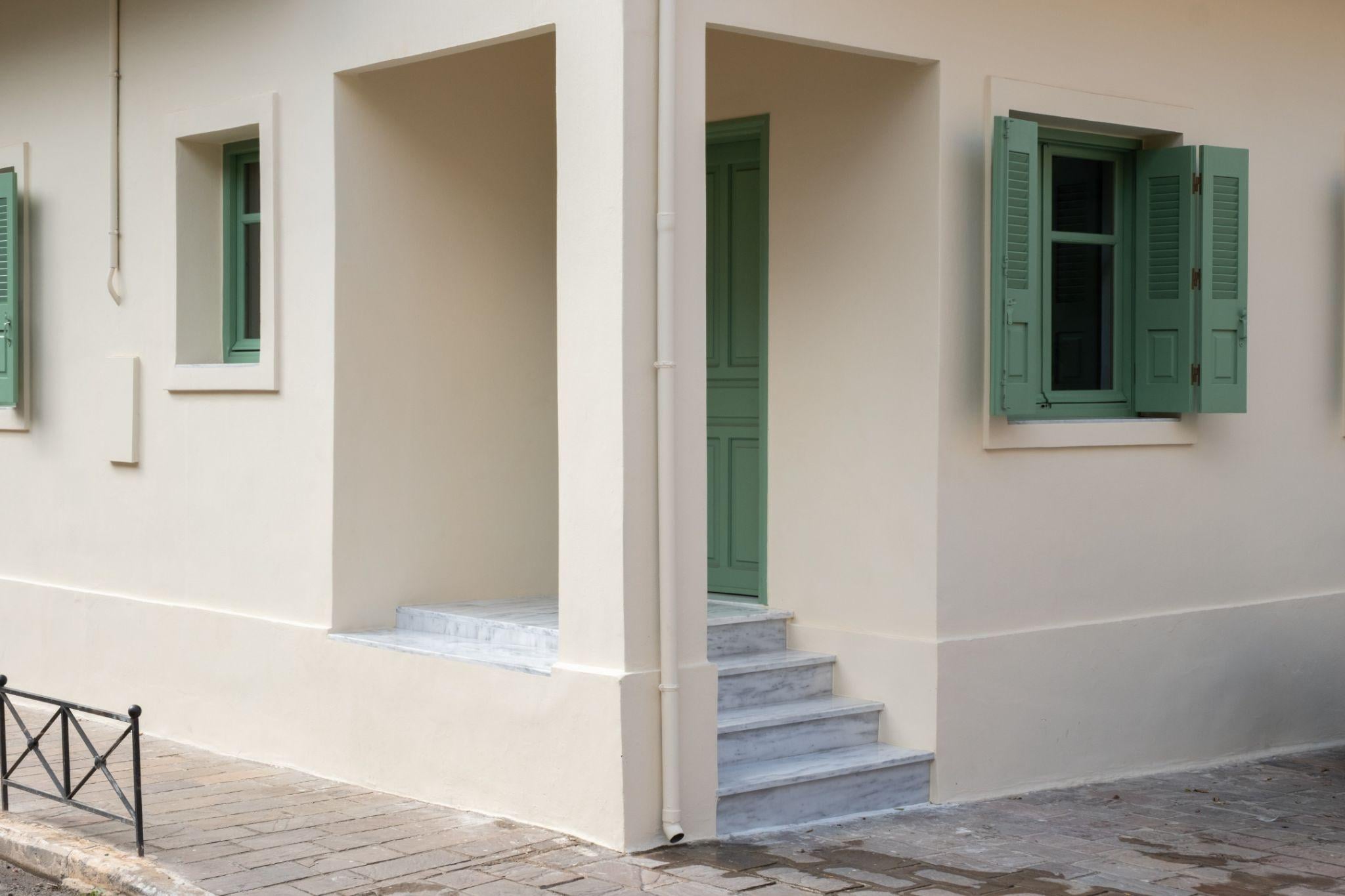 Ở bên ngoài, mặt tiền được làm mới với tông be nhạt, trong khi các khung cửa sổ cũ được giữ lại và sơn xanh nhạt, tạo nên sự tương phản nhẹ nhàng với bảng vật liệu gỗ ấm áp bên trong. Không gian lối vào và cầu thang chung được xem như phần mở rộng của căn hộ, khi các bậc thang ốp đá cẩm thạch Hy Lạp từ Kavala và lan can được loại bỏ, biến khu vực này thành không gian bán công cộng.
