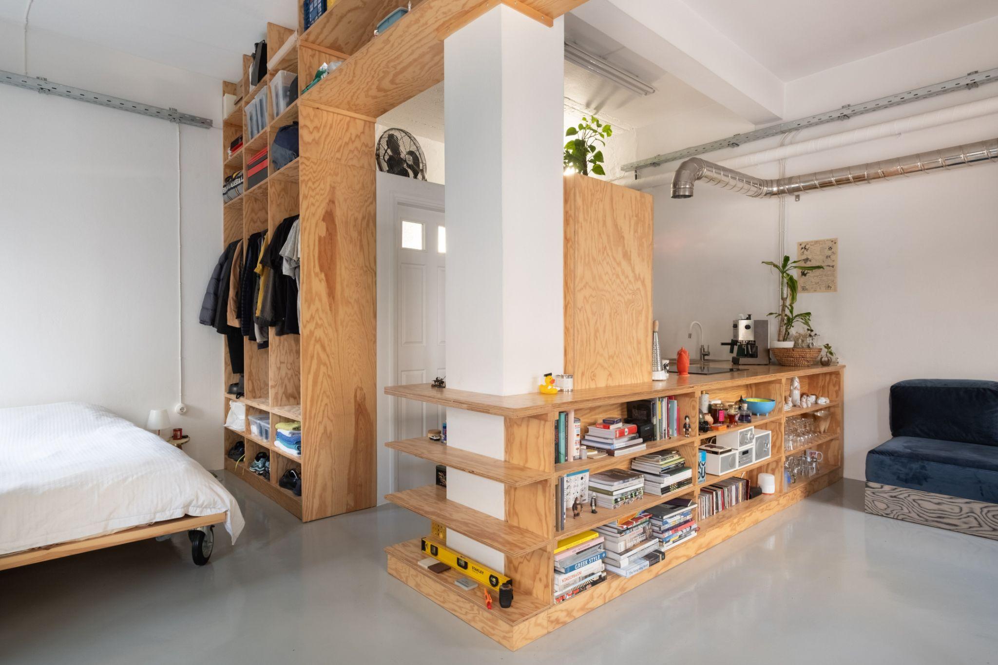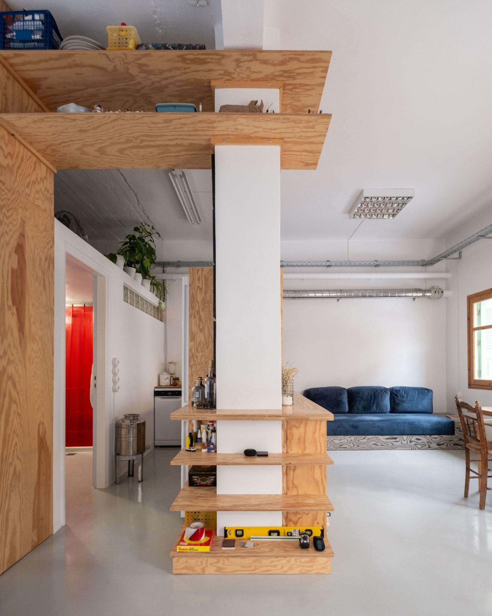 Khối vách trung tâm bằng ván ép thông tích hợp kệ sách, lưu trữ và bề mặt làm việc. Cấu trúc này đóng vai trò trục tổ chức chính cho toàn bộ căn hộ 43m2 Apartment Studio in Chania