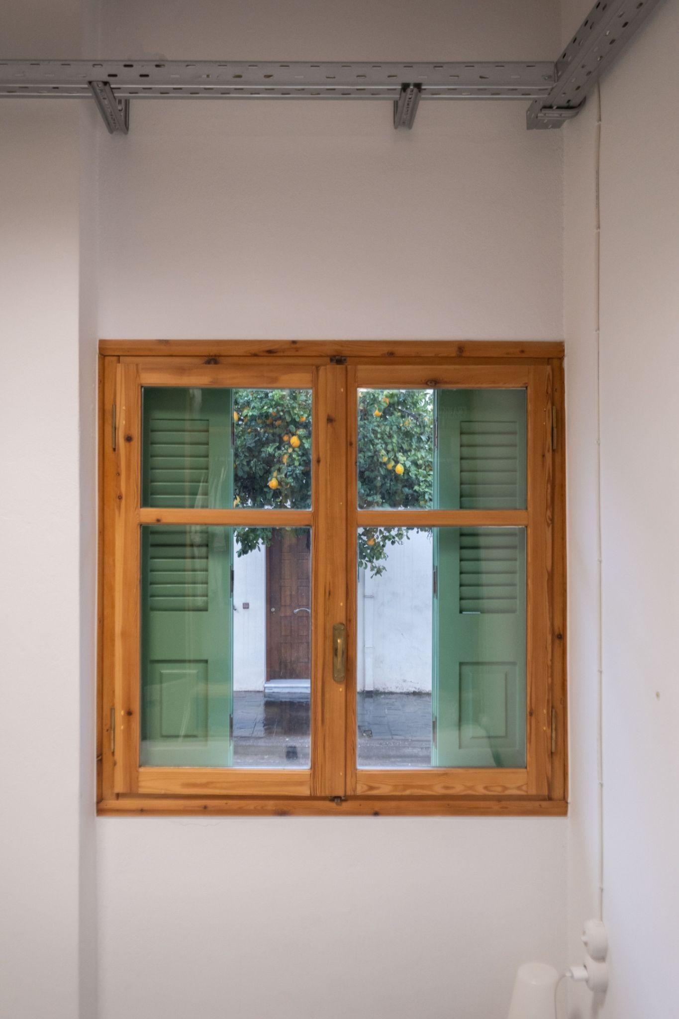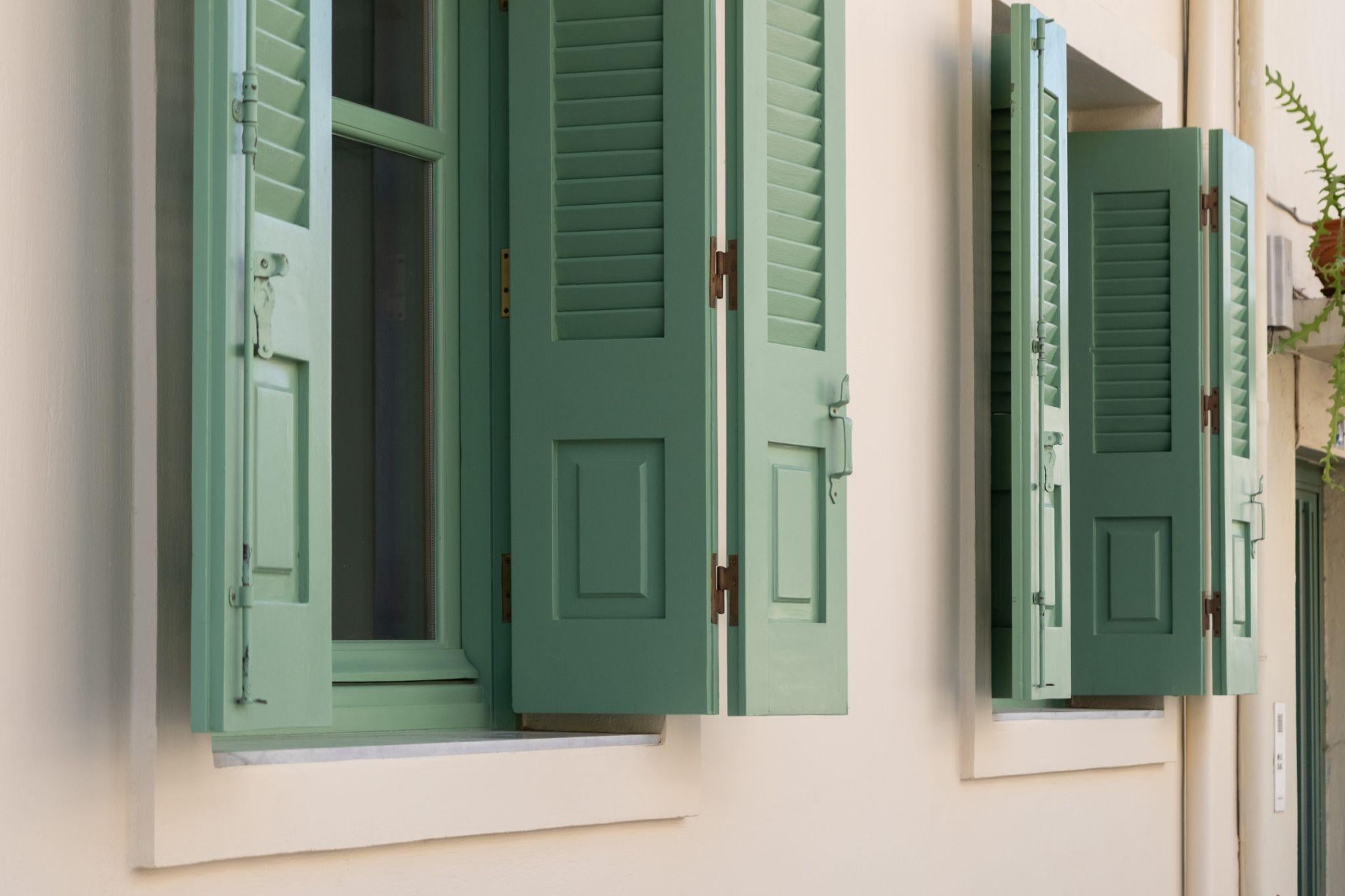 Hệ cửa cũ được giữ lại, trở thành dấu vết ký ức của ngôi nhà gần 60 năm tuổi. Màu xanh nhạt gợi liên tưởng đến bối cảnh Địa Trung Hải của Chania