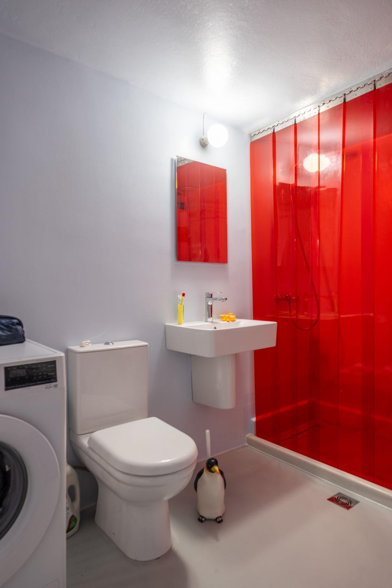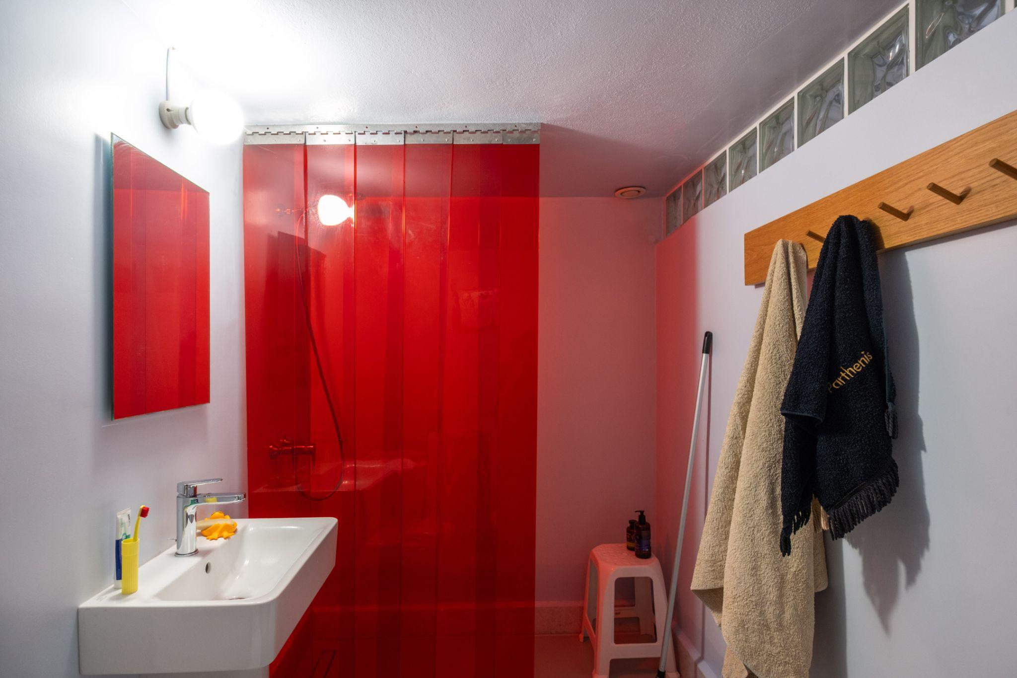 Phòng tắm sử dụng rèm nhựa đỏ bán trong suốt thay cho vách kín. Giải pháp này vừa tạo điểm nhấn thị giác, vừa giúp ánh sáng xuyên qua không gian nhỏ