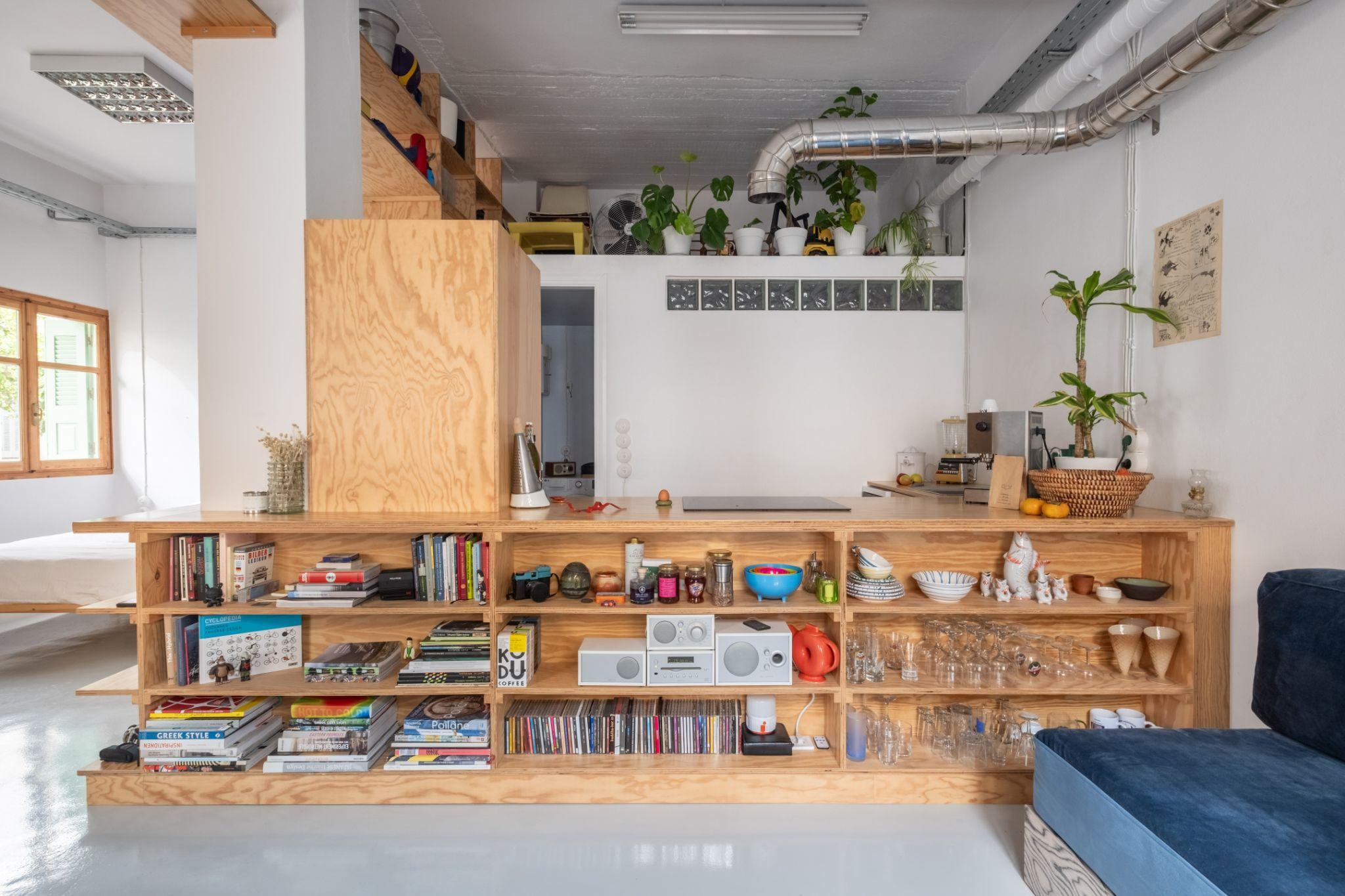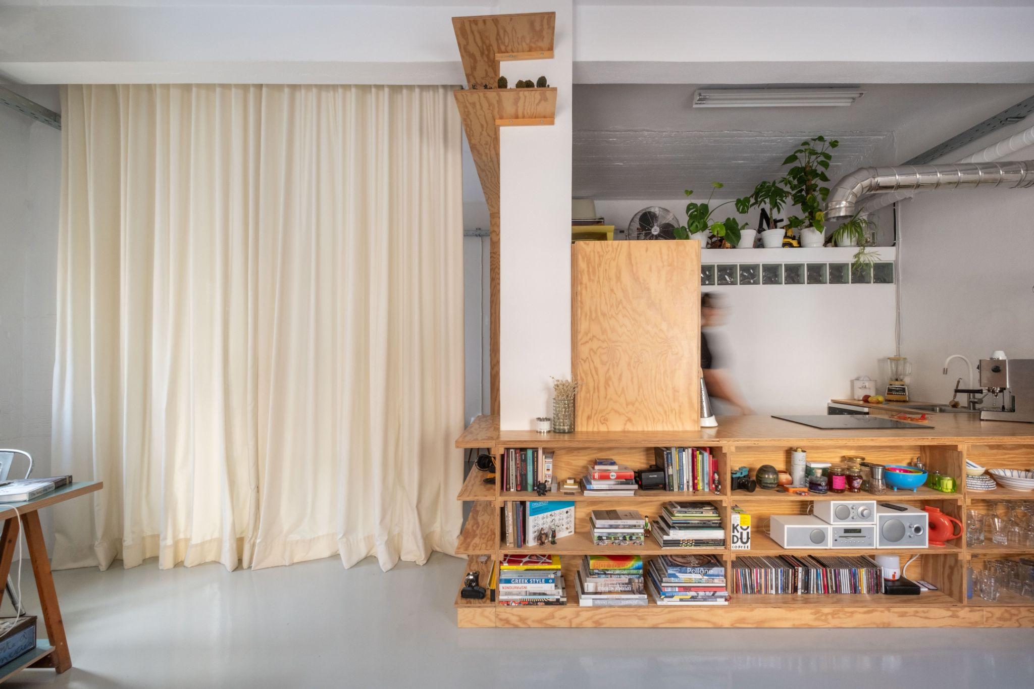 Vách ngăn trung tâm tích hợp thêm các kệ mở cho đồ dùng cá nhân và vật dụng bếp. Cách để lộ đồ đạc góp phần tạo nên “sự hỗn loạn có chủ đích” cho không gian