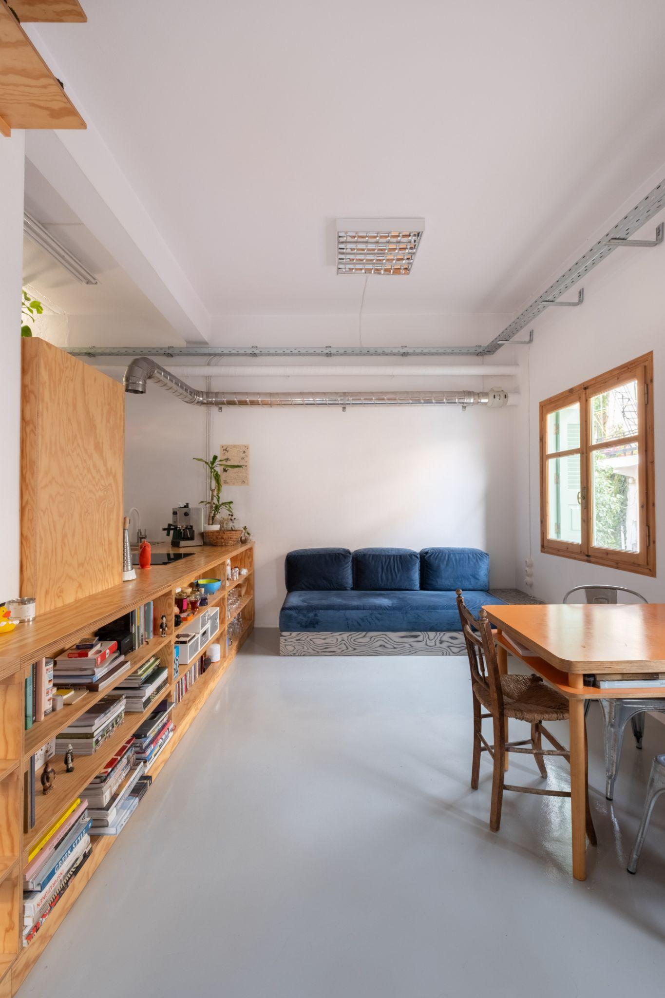 Các bức tường phòng ngủ cũ tháo bỏ hoàn toàn, trả lại cho căn hộ Apartment Studio in Chania mặt bằng mở liền mạch. Trên nền không gian ấy, một vách ngăn trung tâm bằng ván ép thông được đặt vào như trục tổ chức chính, vừa định hình bố cục, vừa dẫn dắt cách sử dụng không gian. Khối vách này tích hợp nhiều chức năng như bếp, kệ sách, tủ lưu trữ, đồng thời tạo ranh giới mềm giữa khu bếp - phòng tắm và phần còn lại của căn hộ.