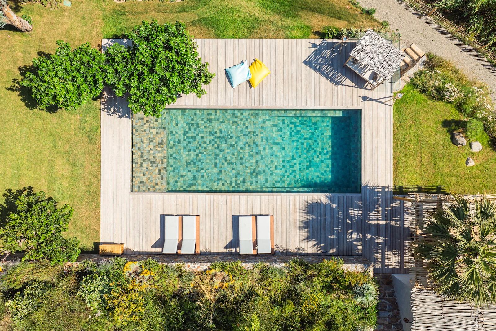 Hồ bơi được bố trí như một mặt phẳng nước nằm giữa thảm xanh và sườn đồi. Từ trên cao, cảnh quan và kiến trúc hòa làm một, không phân định ranh giới rõ ràng