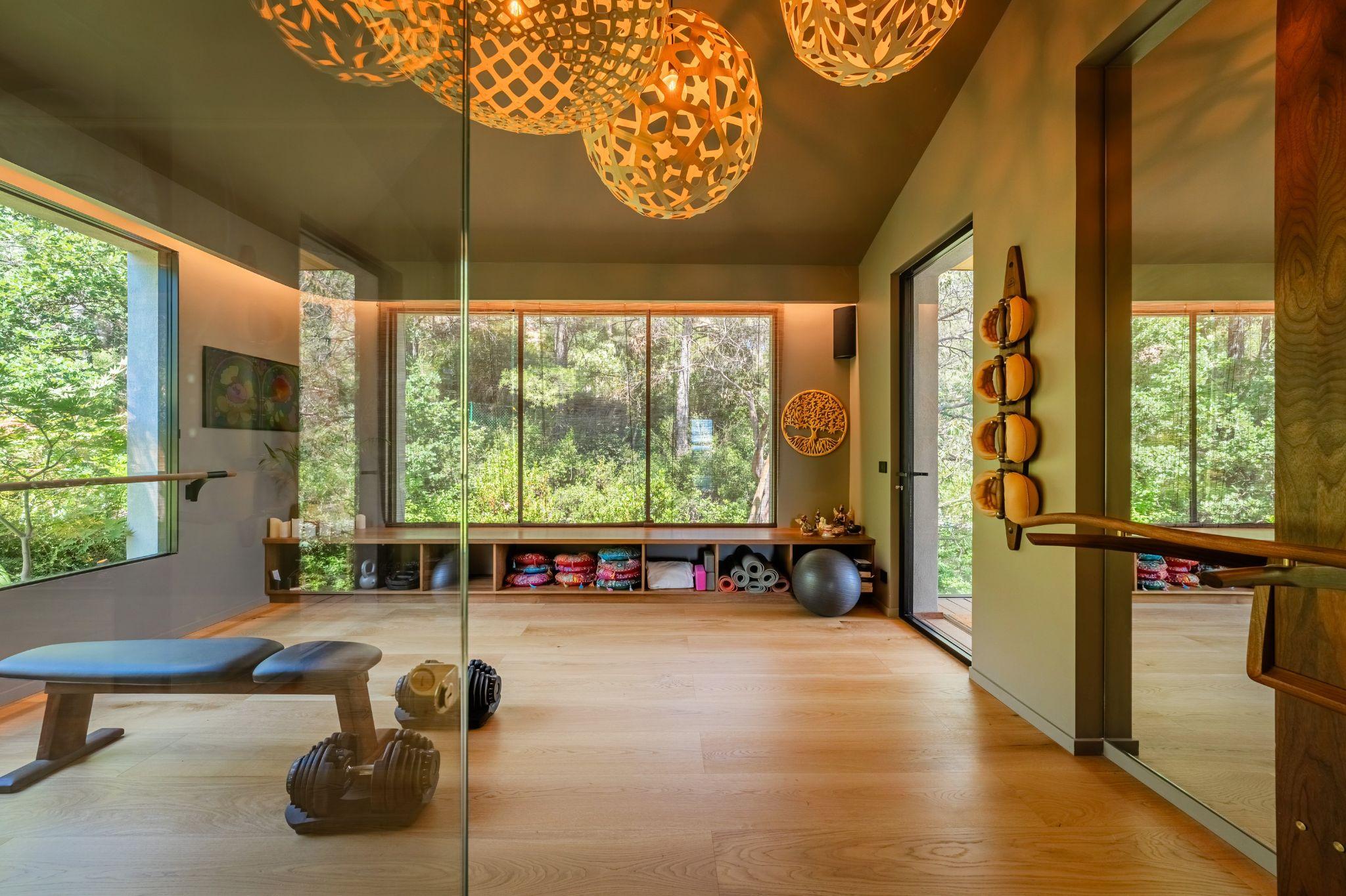 Phòng tập được tổ chức kín đáo nhưng vẫn mở ra thiên nhiên qua các khung kính lớn. Gỗ và ánh sáng tạo cảm giác thư giãn, cân bằng giữa vận động và nghỉ ngơi
