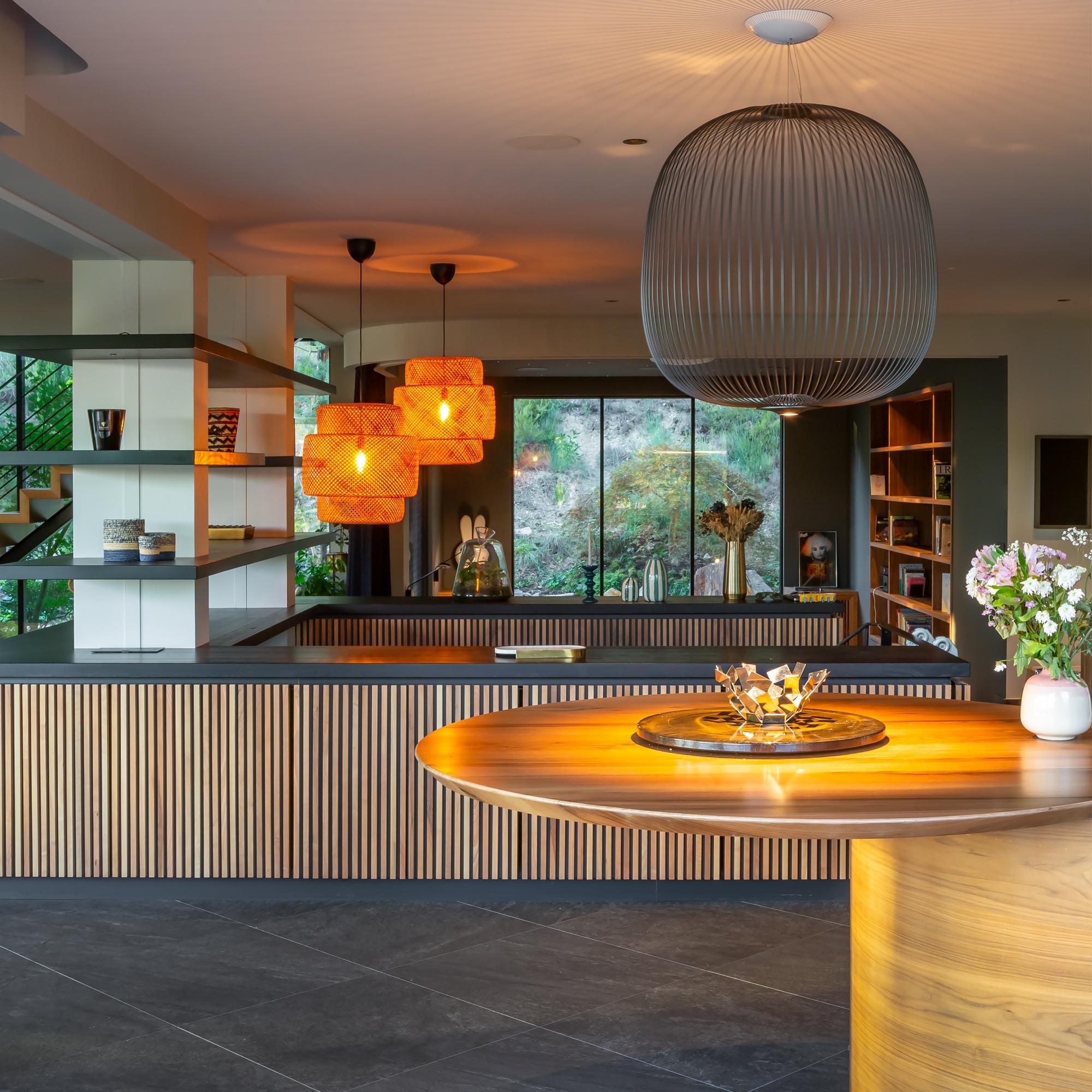 Bảng vật liệu gỗ và kim loại được tiết chế, tạo nền trung tính cho sinh hoạt hàng ngày. Ánh sáng ấm làm nổi bật kết cấu và chiều sâu của không gian