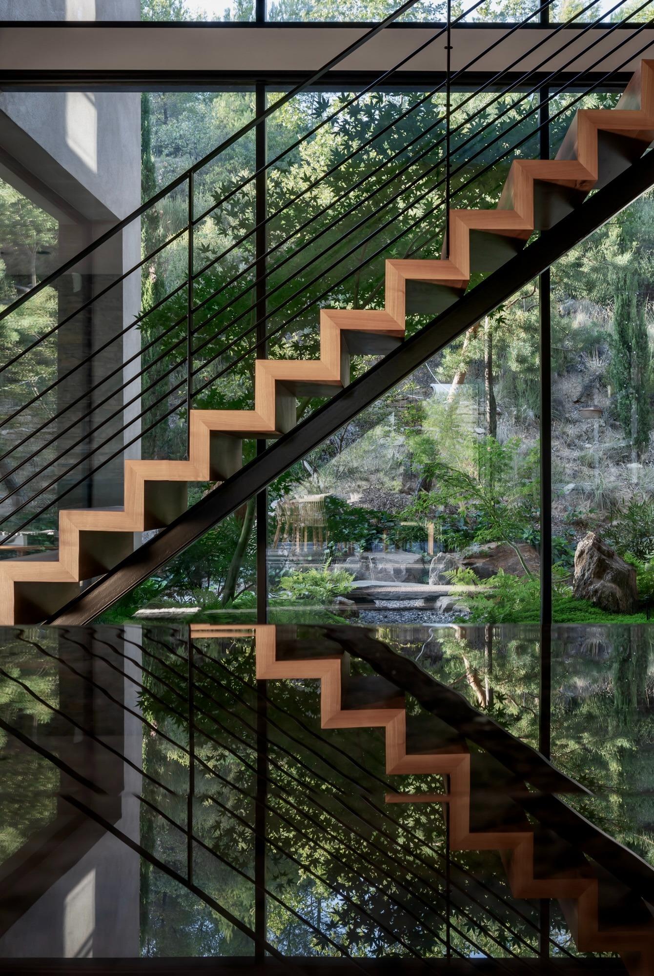 Cầu thang với những đường cắt hình học trở thành điểm nhấn thị giác trong không gian. Hình khối mạch lạc tạo nhịp chuyển động liên tục giữa các tầng và cảnh quan bên ngoài