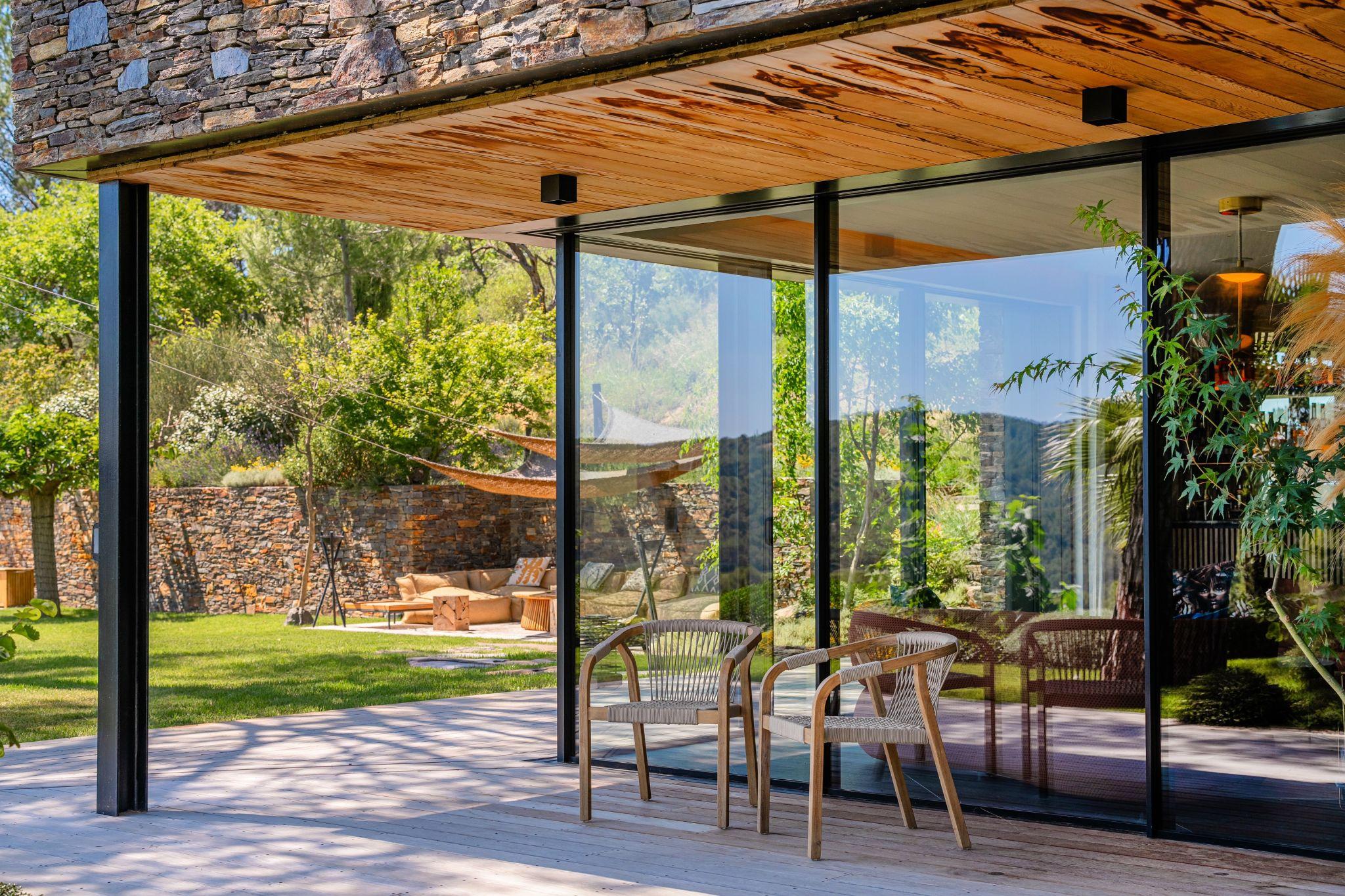 Hệ cửa trượt lớn mở không gian sinh hoạt ra khu vườn phía trước. Mái hiên kéo dài giúp nội thất thích ứng linh hoạt với khí hậu địa phương