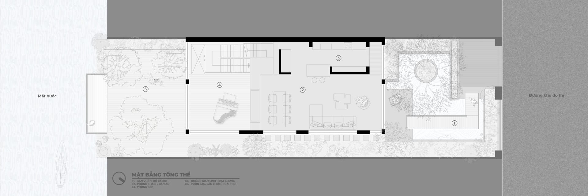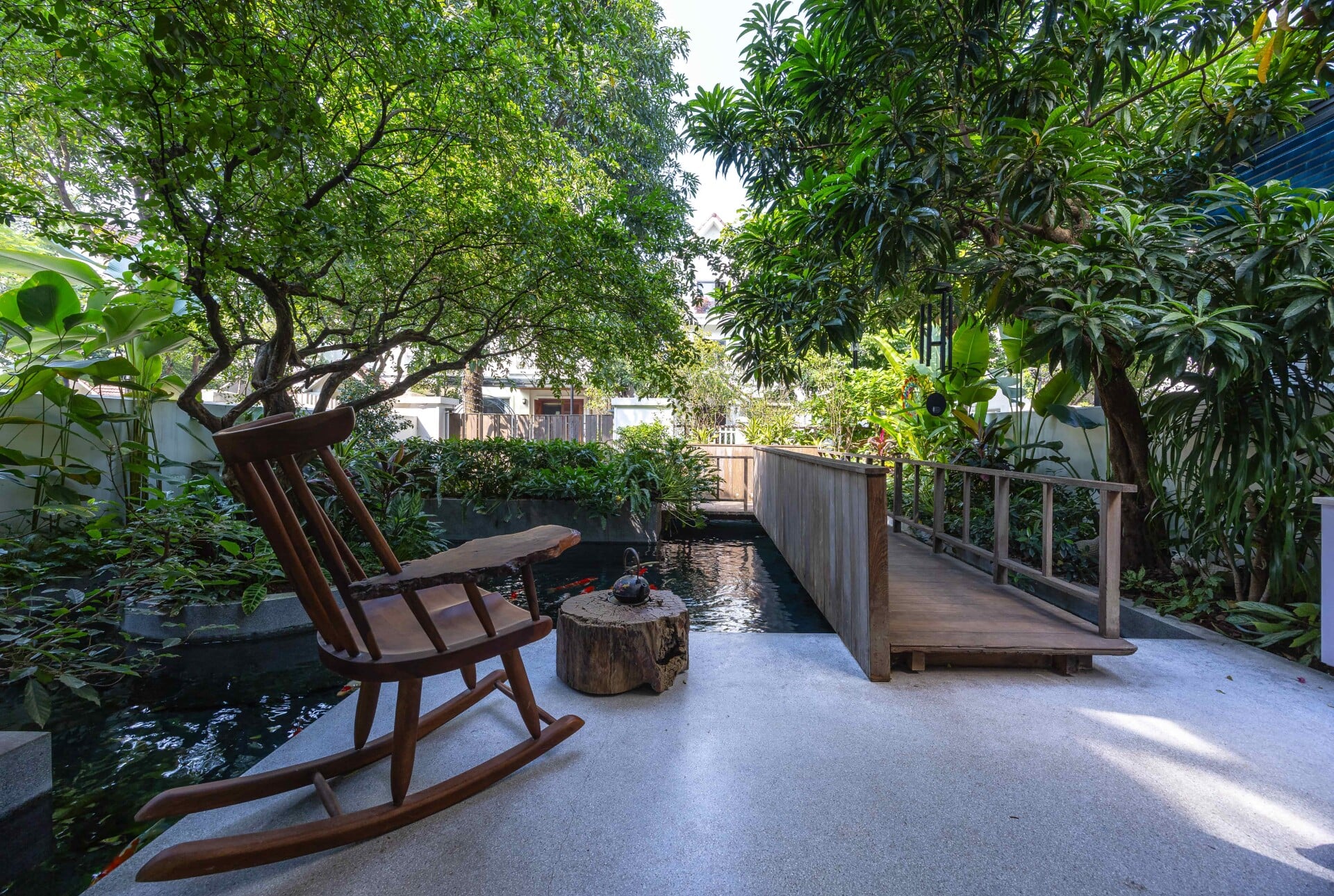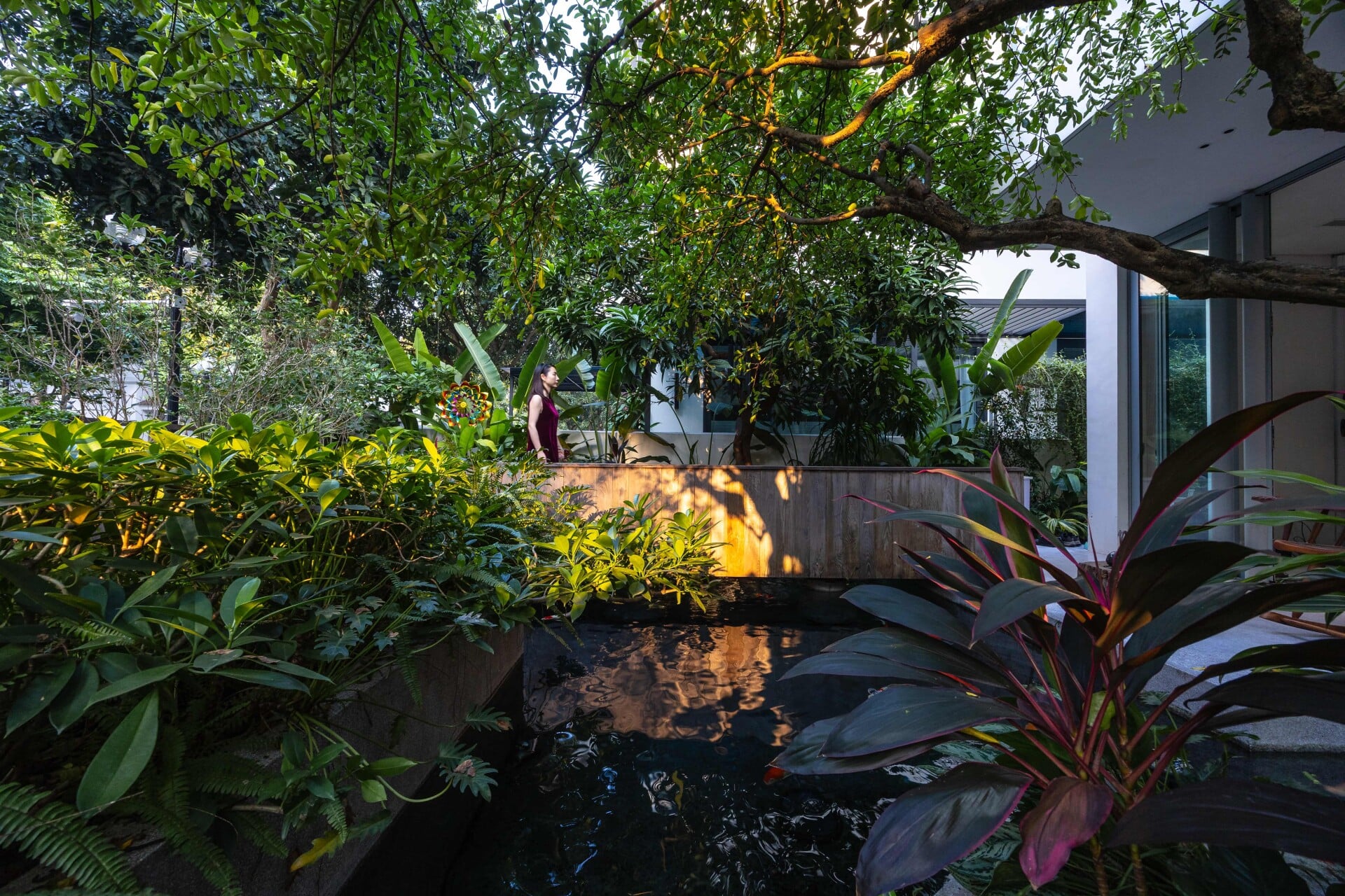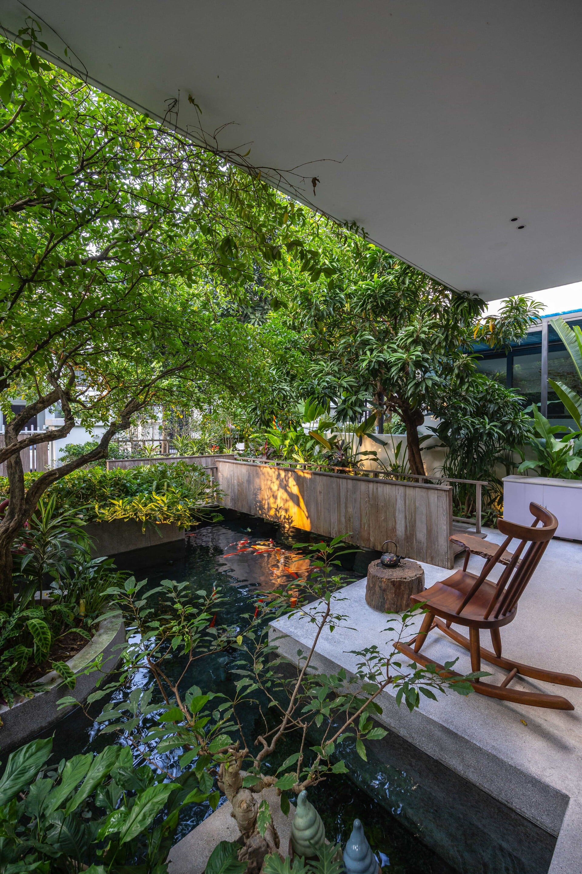 Khu vườn phía trước có vai trò là lớp đệm, giúp tiếp cận vào trong nhà bằng lối đi nhỏ trên chiếc cầu gỗ băng qua hồ cá koi, len lỏi dưới những tán cây chuyển dịch nhẹ nhàng đến với không gian sảnh chính. Tại đây, con người có thể tận hưởng trọn vẹn không gian mặt nước để tạm gác lại dòng chảy hối hả của phố thị trước khi trở về giữa sự bình yên của ngôi nhà.