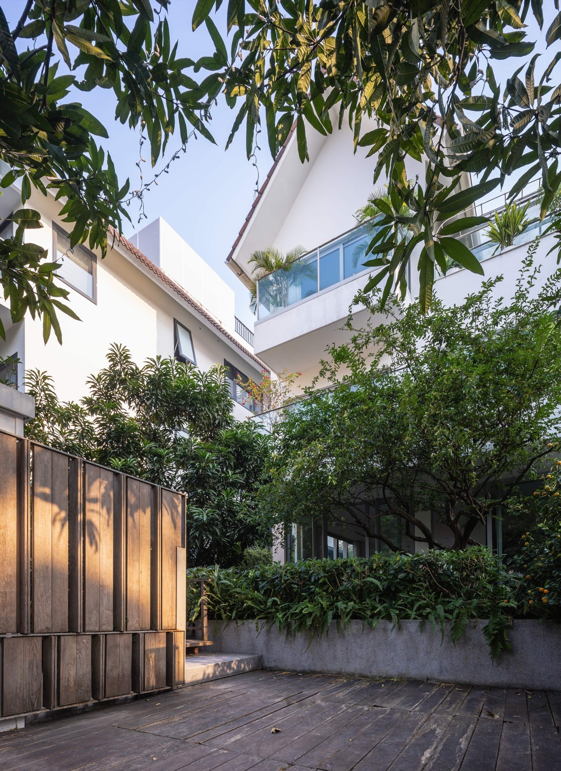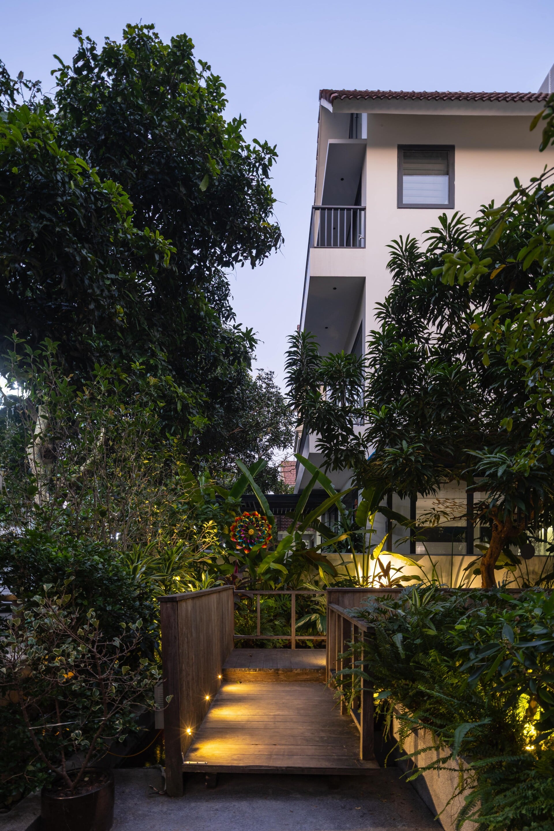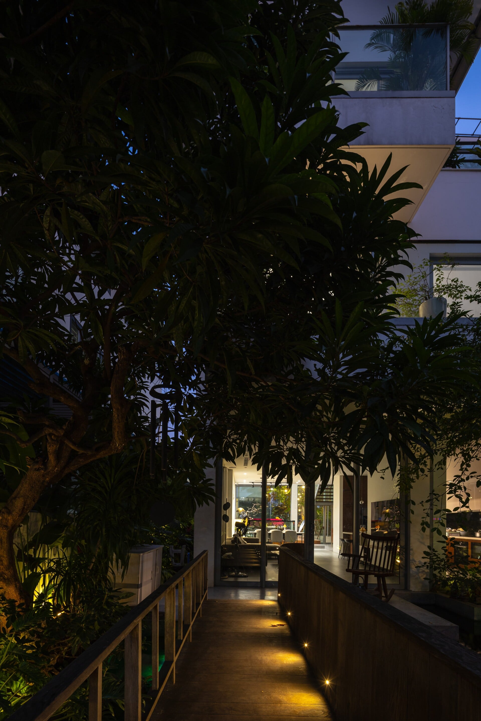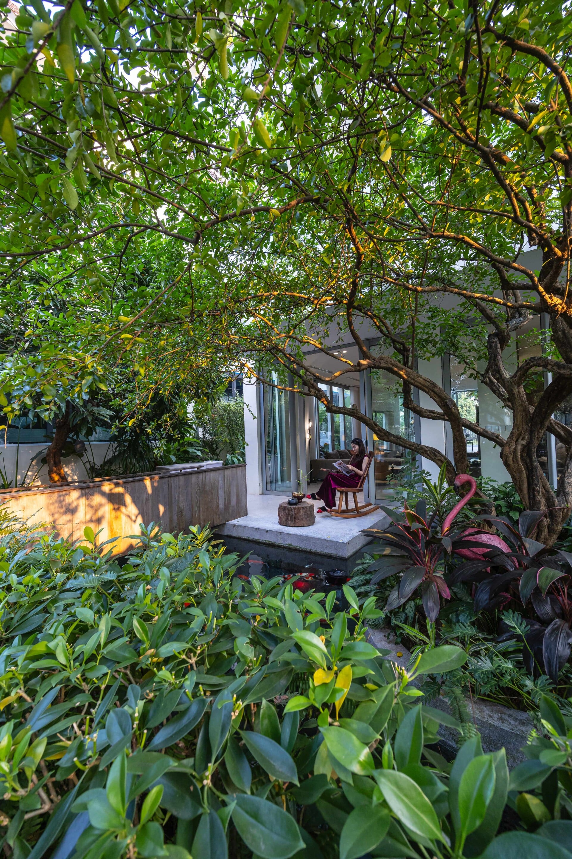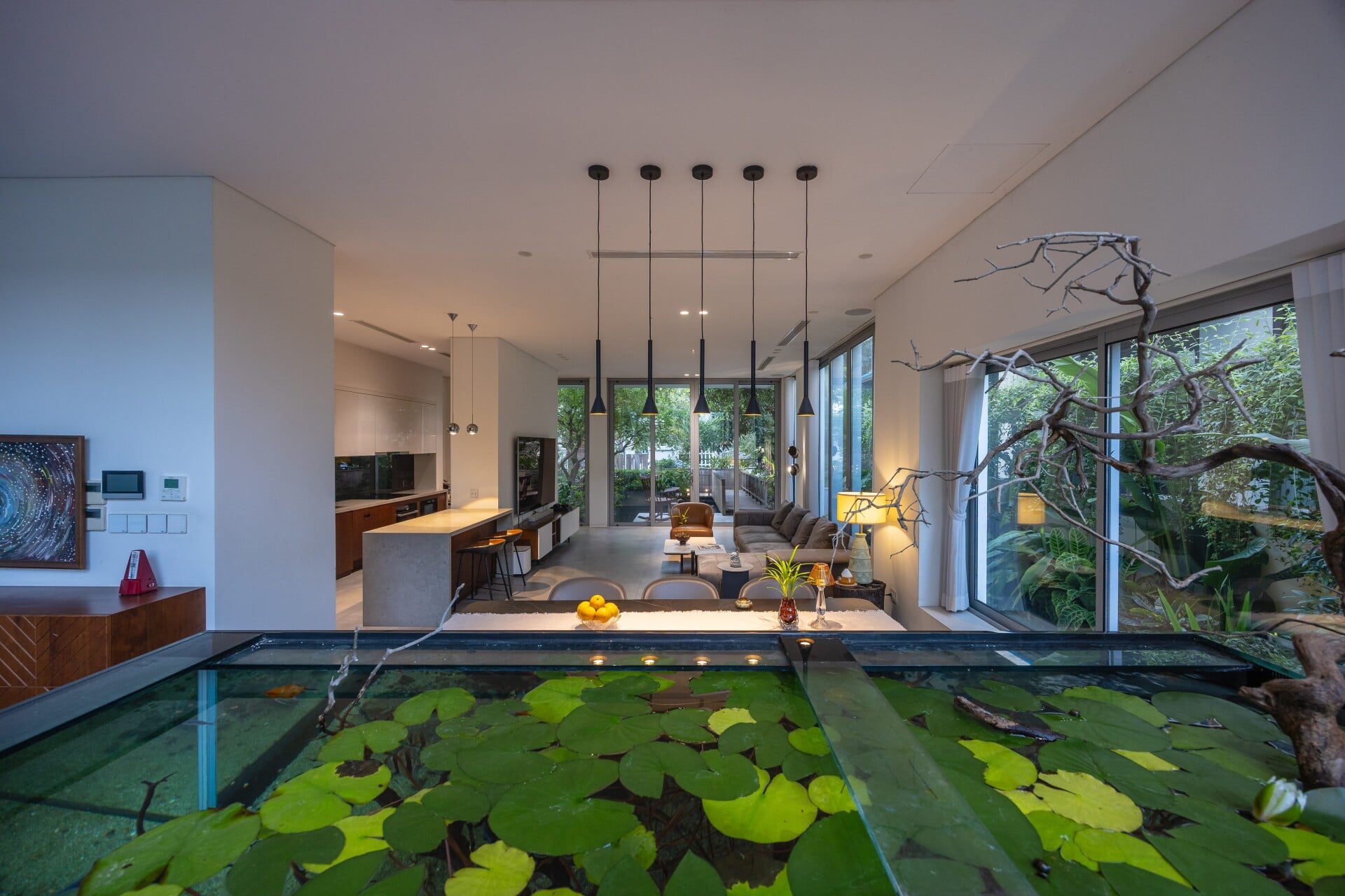 Khu vườn phía trước có vai trò là lớp đệm, giúp tiếp cận vào trong nhà bằng lối đi nhỏ trên chiếc cầu gỗ băng qua hồ cá koi, len lỏi dưới những tán cây chuyển dịch nhẹ nhàng đến với không gian sảnh chính. Tại đây, con người có thể tận hưởng trọn vẹn không gian mặt nước để tạm gác lại dòng chảy hối hả của phố thị trước khi trở về giữa sự bình yên của ngôi nhà.