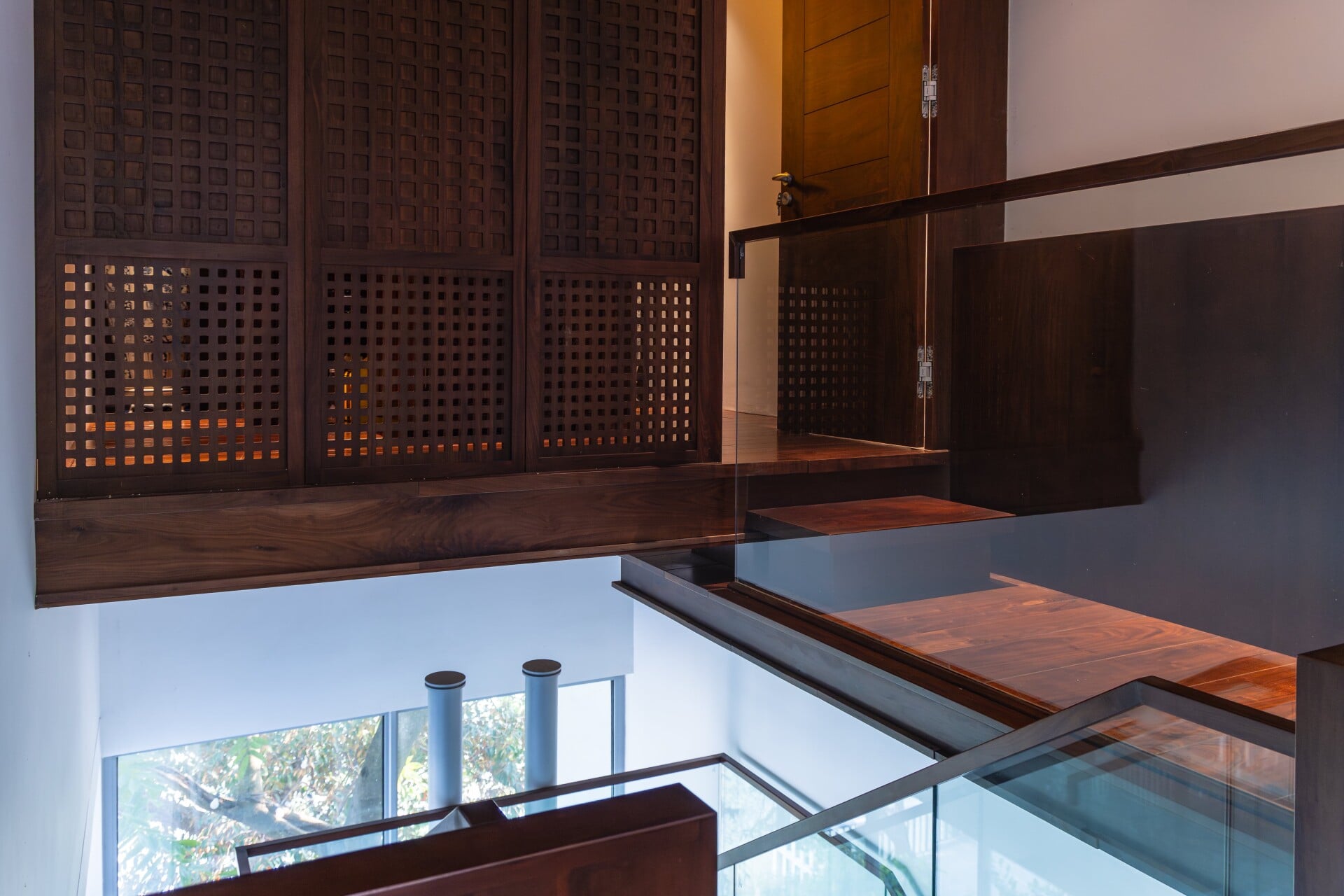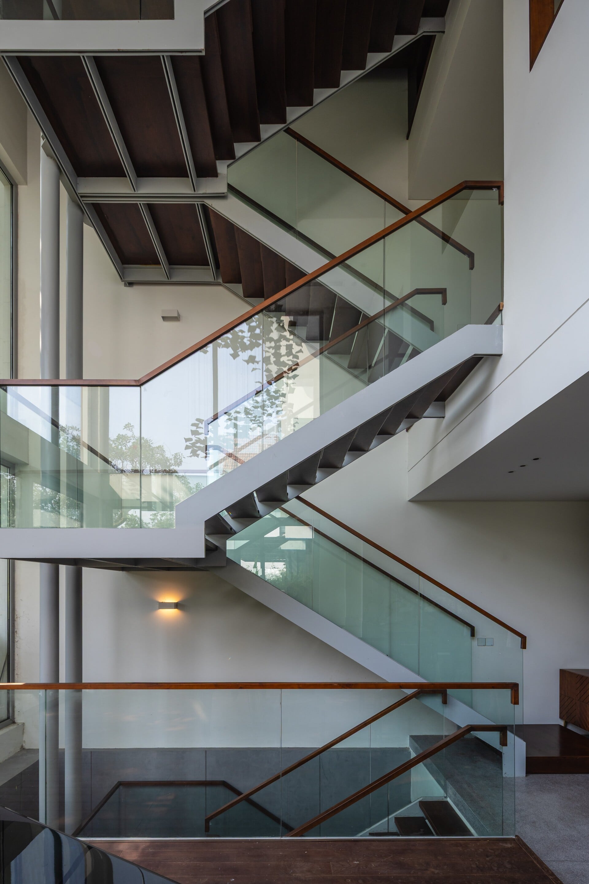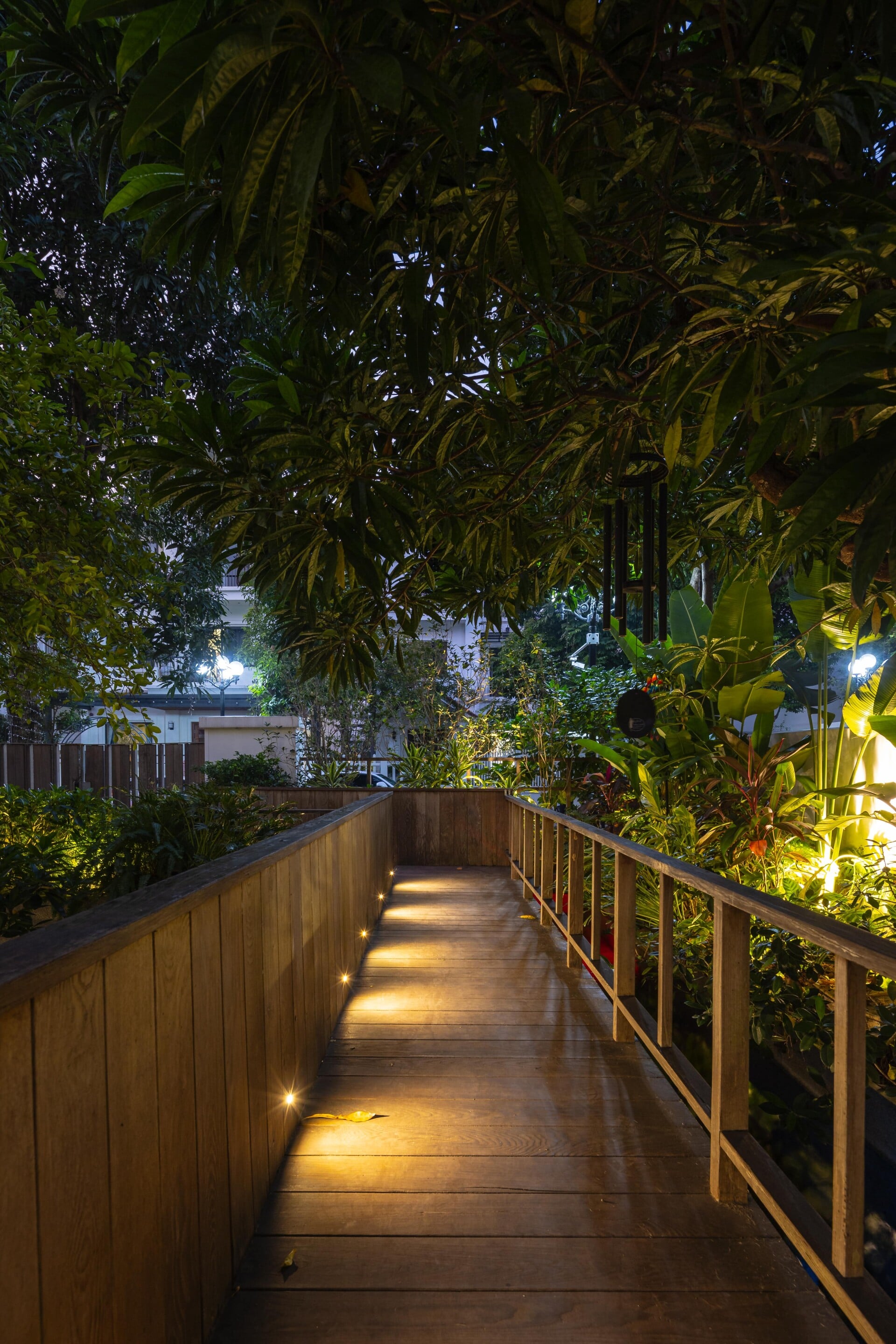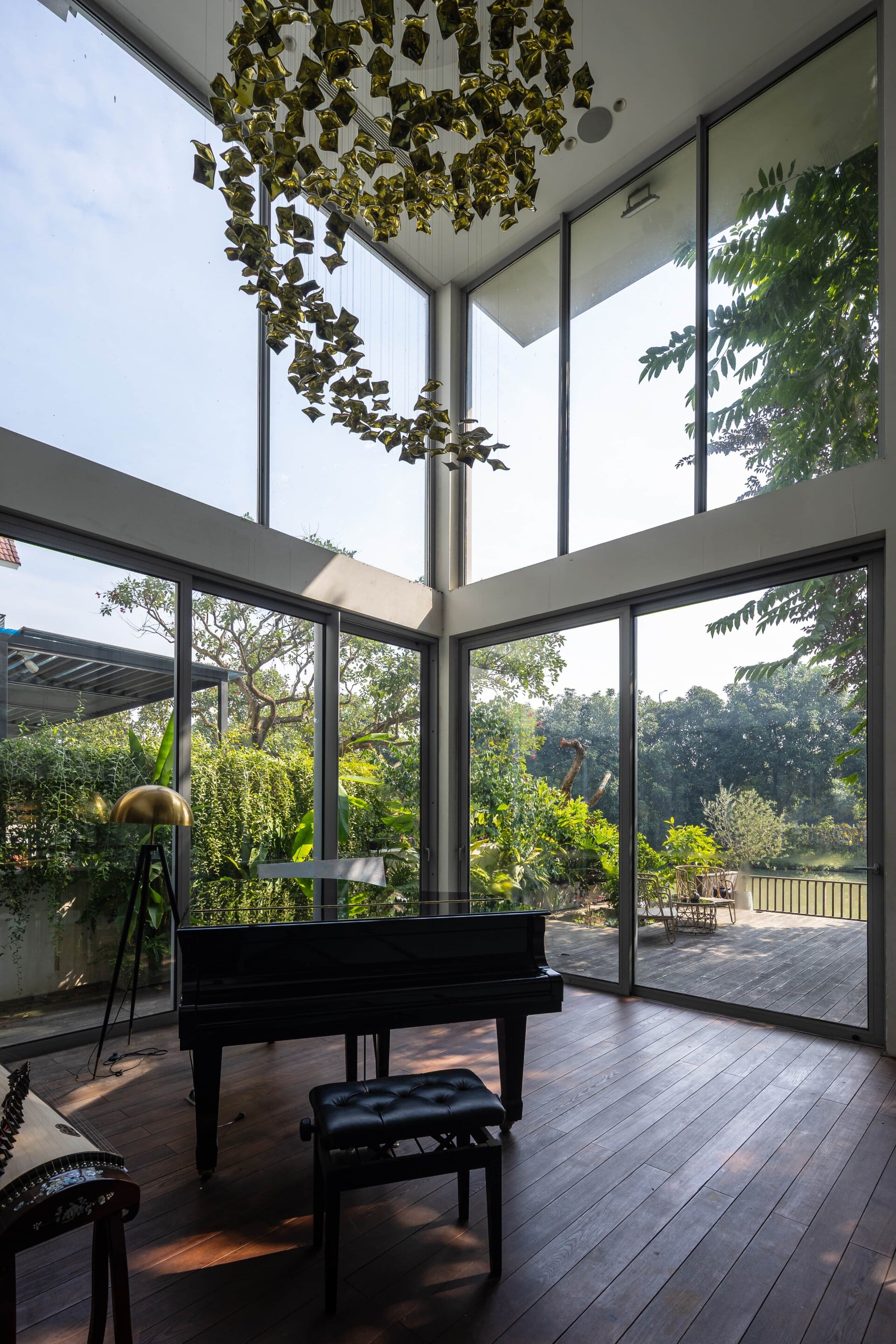 Khu vườn phía trước có vai trò là lớp đệm, giúp tiếp cận vào trong nhà bằng lối đi nhỏ trên chiếc cầu gỗ băng qua hồ cá koi, len lỏi dưới những tán cây chuyển dịch nhẹ nhàng đến với không gian sảnh chính. Tại đây, con người có thể tận hưởng trọn vẹn không gian mặt nước để tạm gác lại dòng chảy hối hả của phố thị trước khi trở về giữa sự bình yên của ngôi nhà.