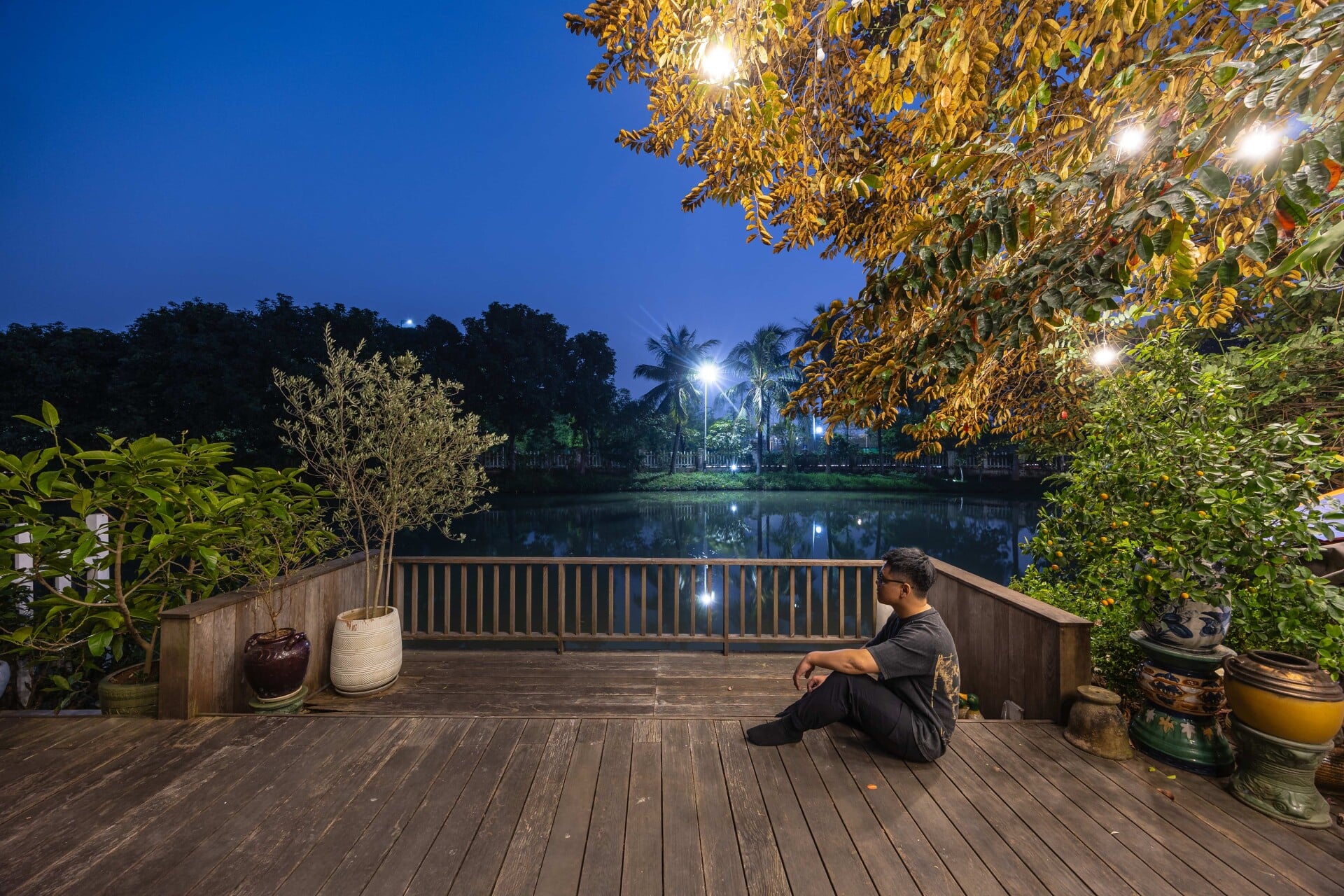 Từ đây, không gian tiếp tục mở rộng ra khoảng sân sau - nơi diễn ra các hoạt động vui chơi và sinh hoạt ngoài trời - trước khi chạm tới mặt nước êm đềm của con sông, mang lại cảm giác thư thái và an yên cho các thành viên trong gia đình.