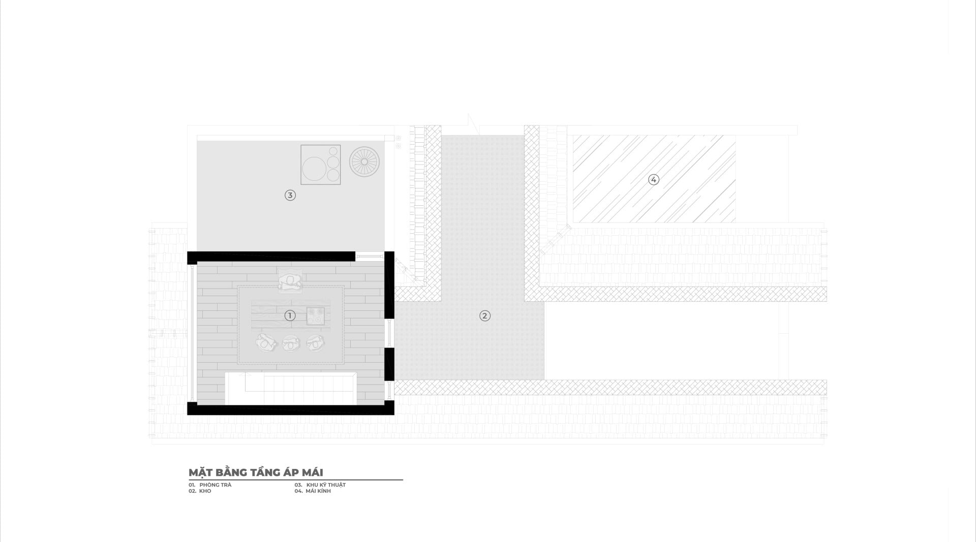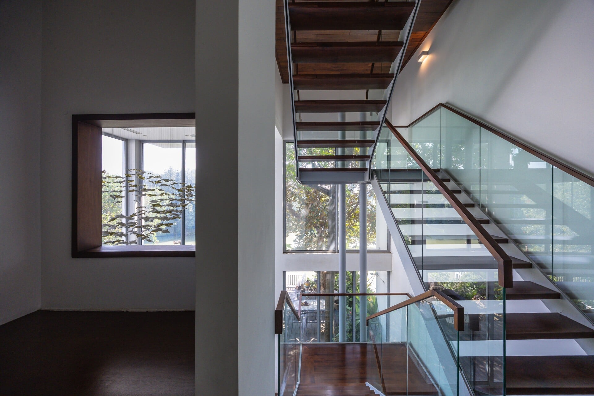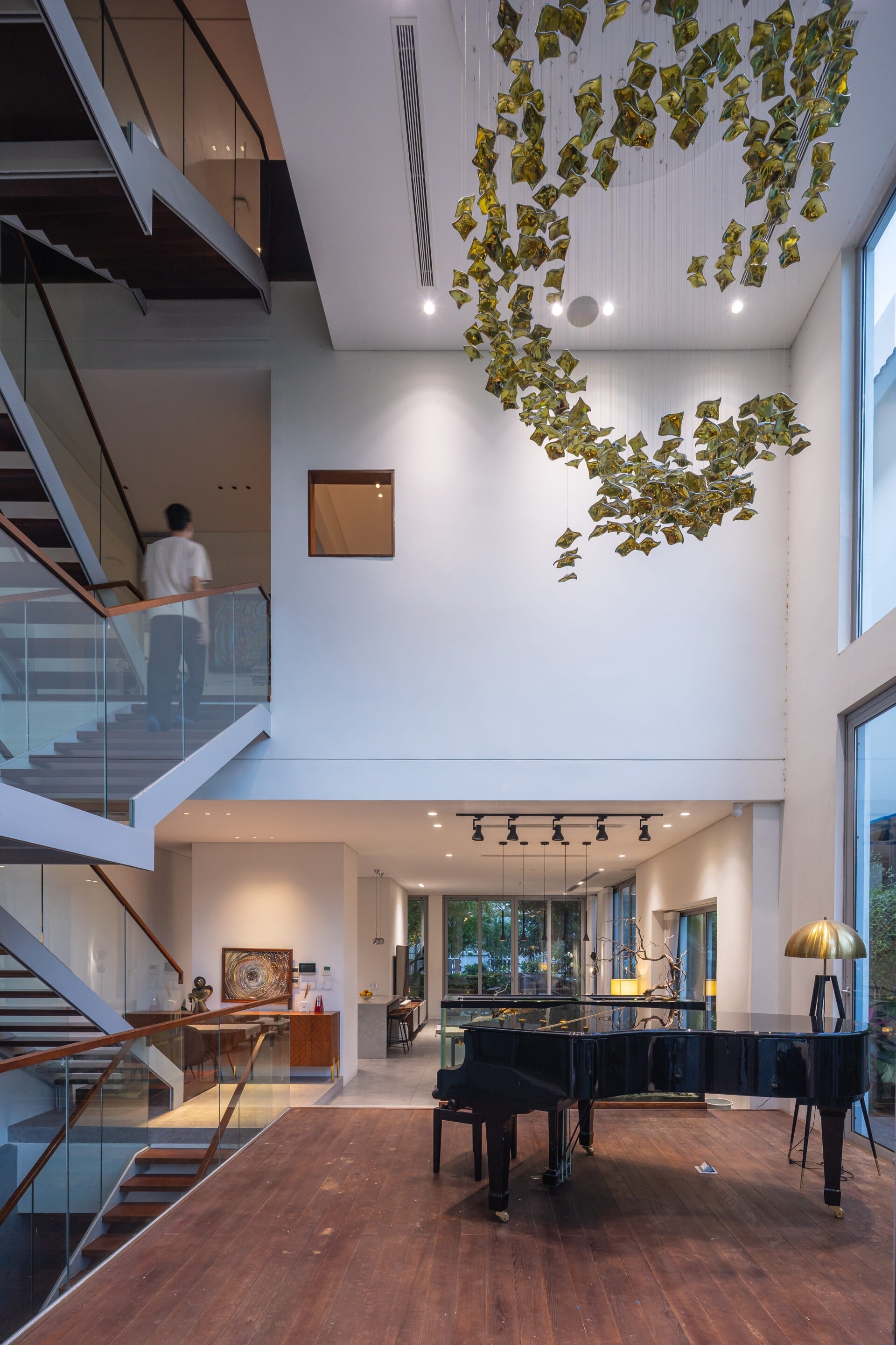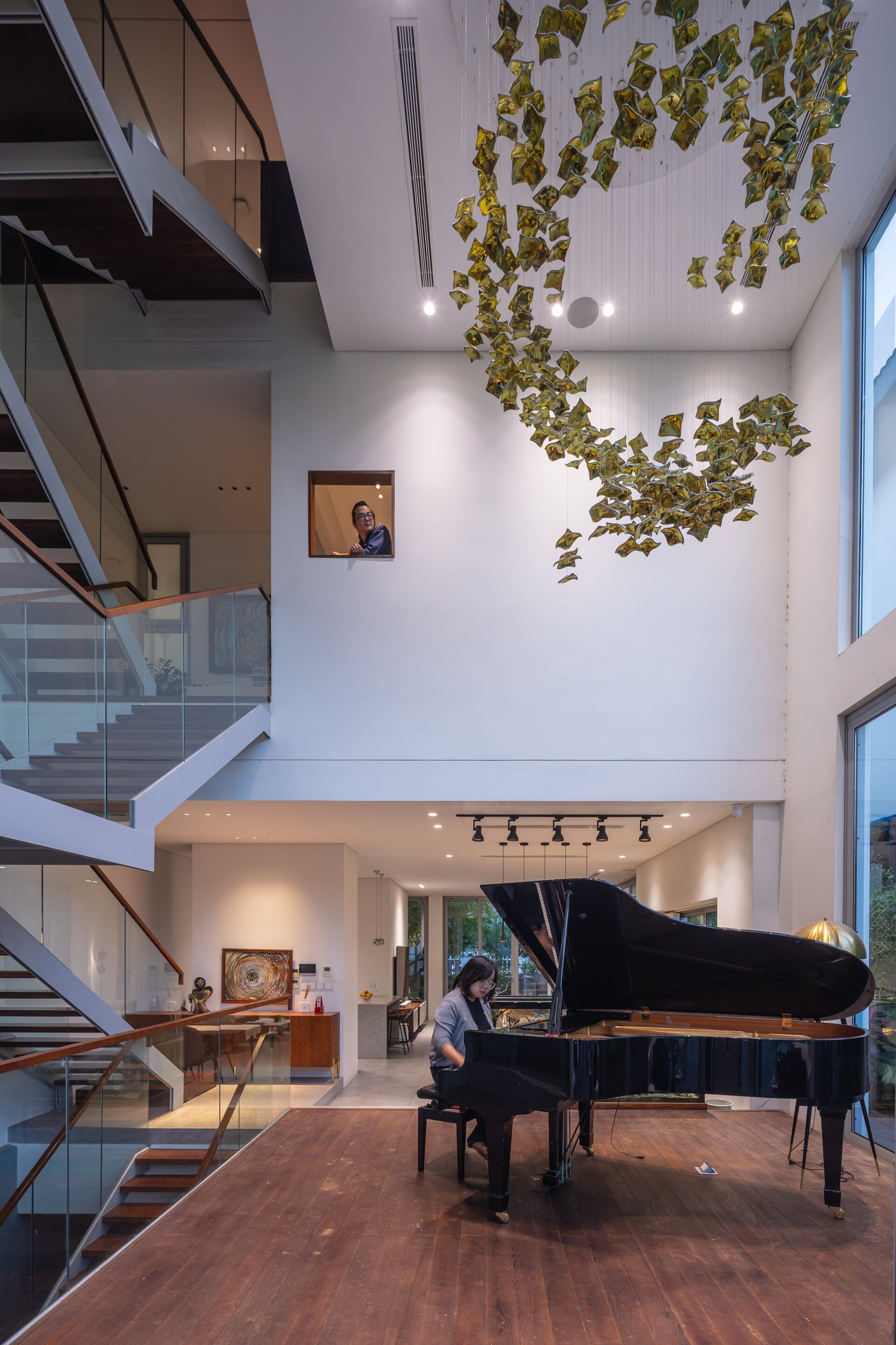 Tiếp đến, khu vực sinh hoạt chung kết hợp với khoảng thông tầng được bố trí bên cạnh lõi thang, trở thành điểm giao thoa cho toàn bộ công trình giữa trong - ngoài, trên - dưới, duy trì sự kết nối theo cả phương ngang và phương đứng.