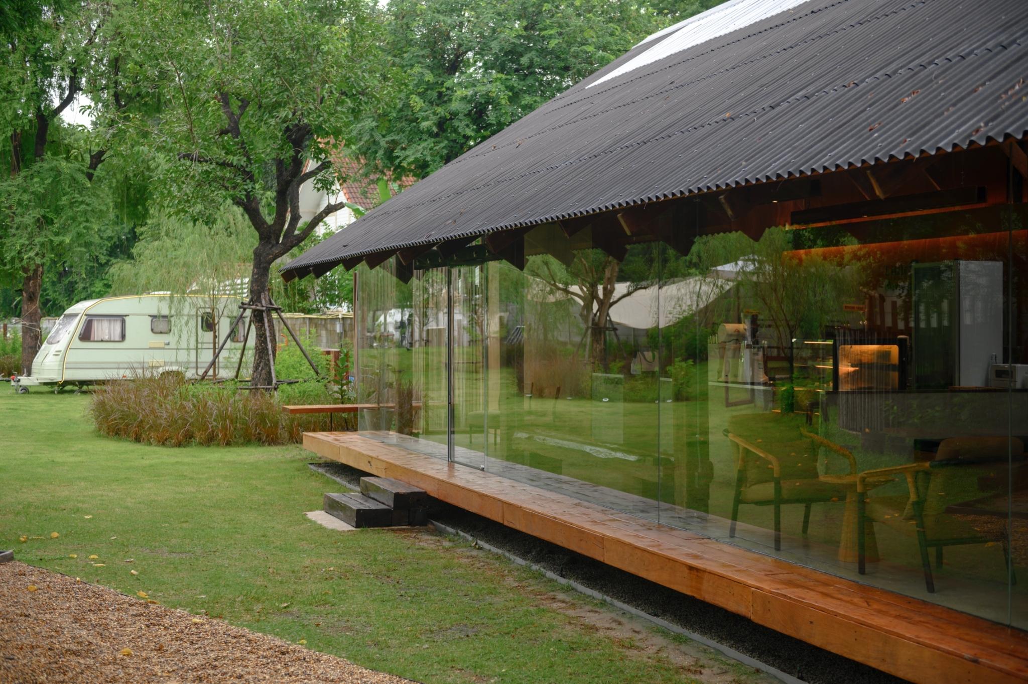 Mặt bên công trình với vách kính dài chạy suốt, phản chiếu cảnh quan sân vườn xung quanh. Sàn gỗ nâng nhẹ so với mặt đất giúp không gian khô ráo và thoát nước tốt