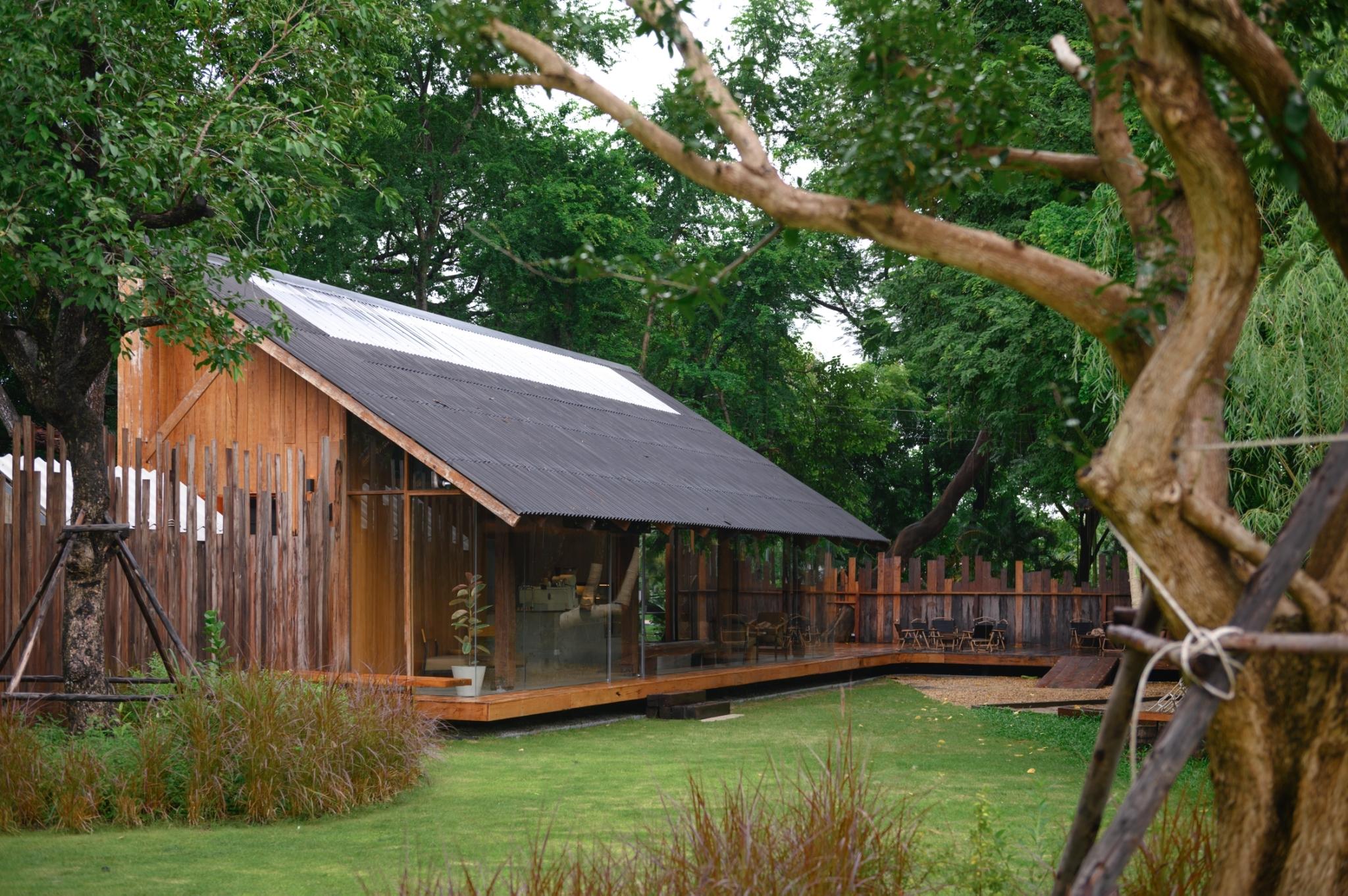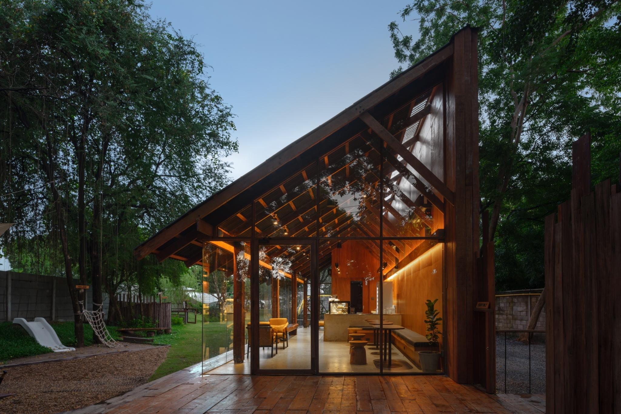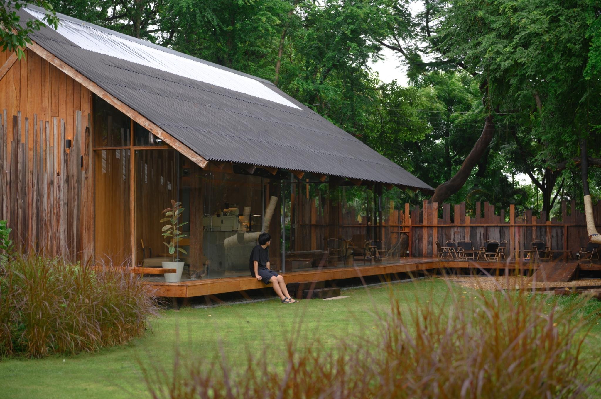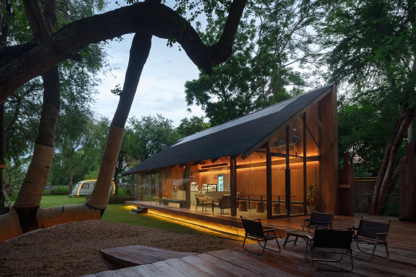 Không gian quán cà phê nằm gọn dưới tán cây lớn, kiến trúc lùi sâu để nhường chỗ cho thiên nhiên. Ánh sáng buổi chiều hắt qua mái và sàn gỗ tạo cảm giác ấm áp, yên tĩnh