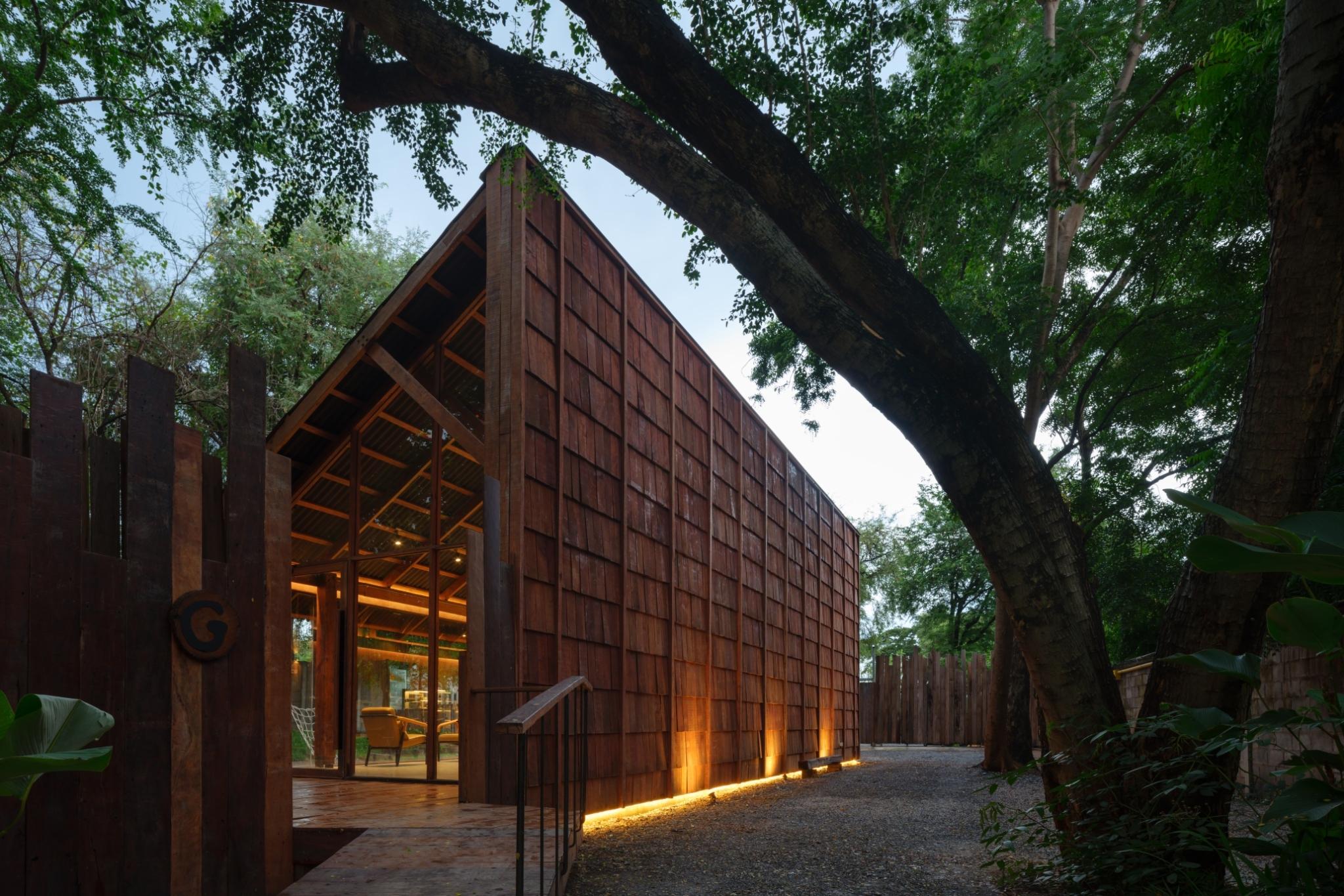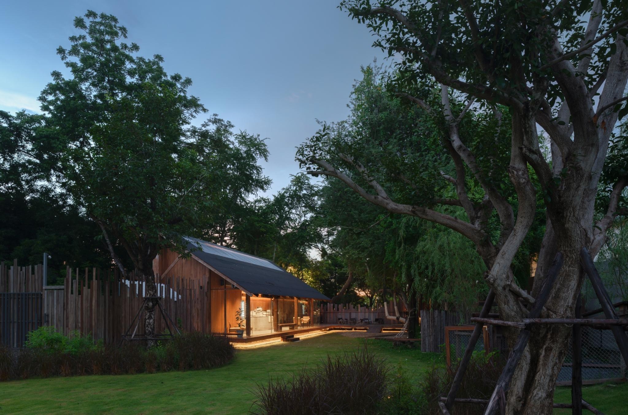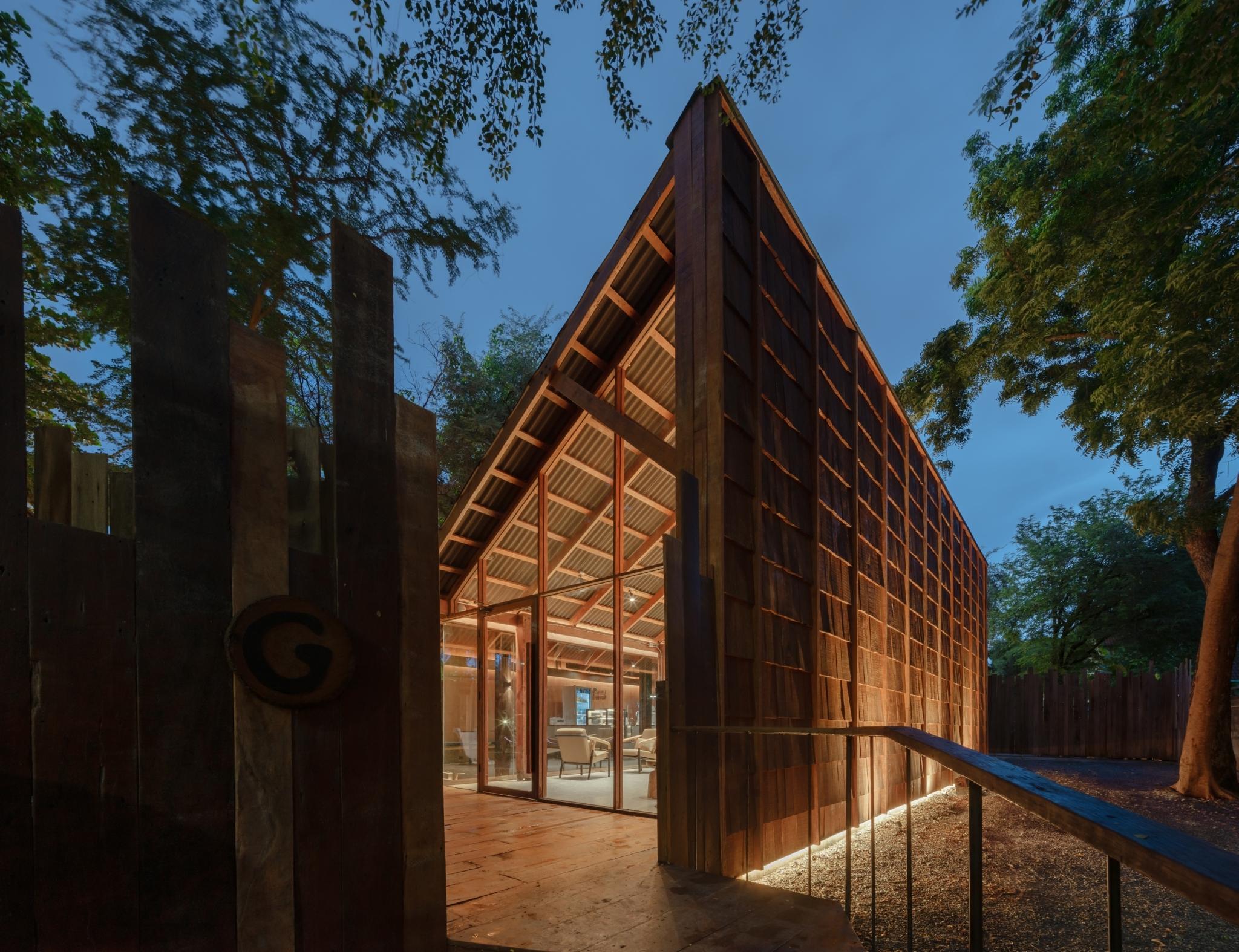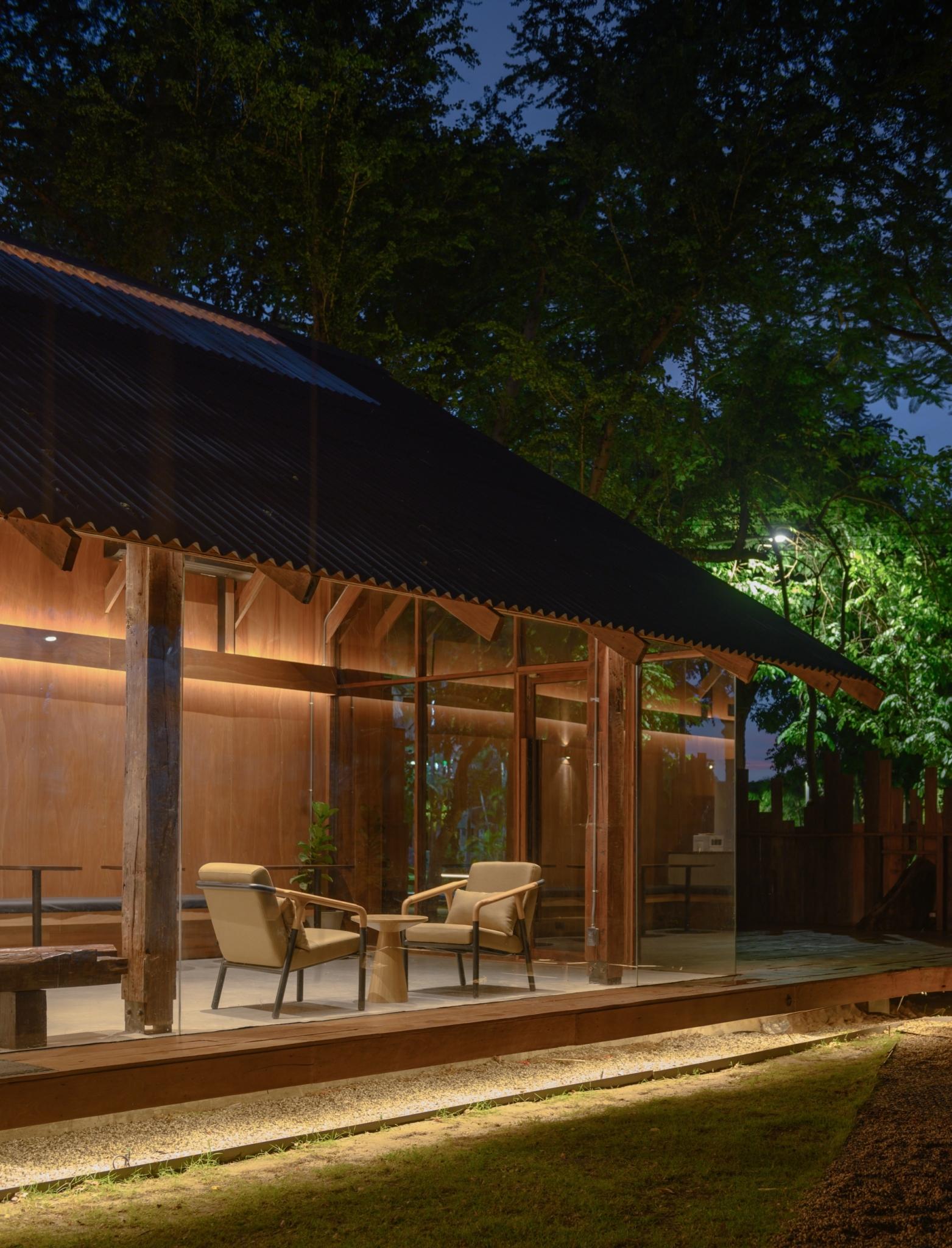 Lối vào công trình được dẫn dắt qua mảng gỗ và cây xanh, tạo cảm giác chậm rãi khi tiếp cận. Ánh sáng buổi tối làm nổi bật cấu trúc mái và vật liệu gỗ tự nhiên