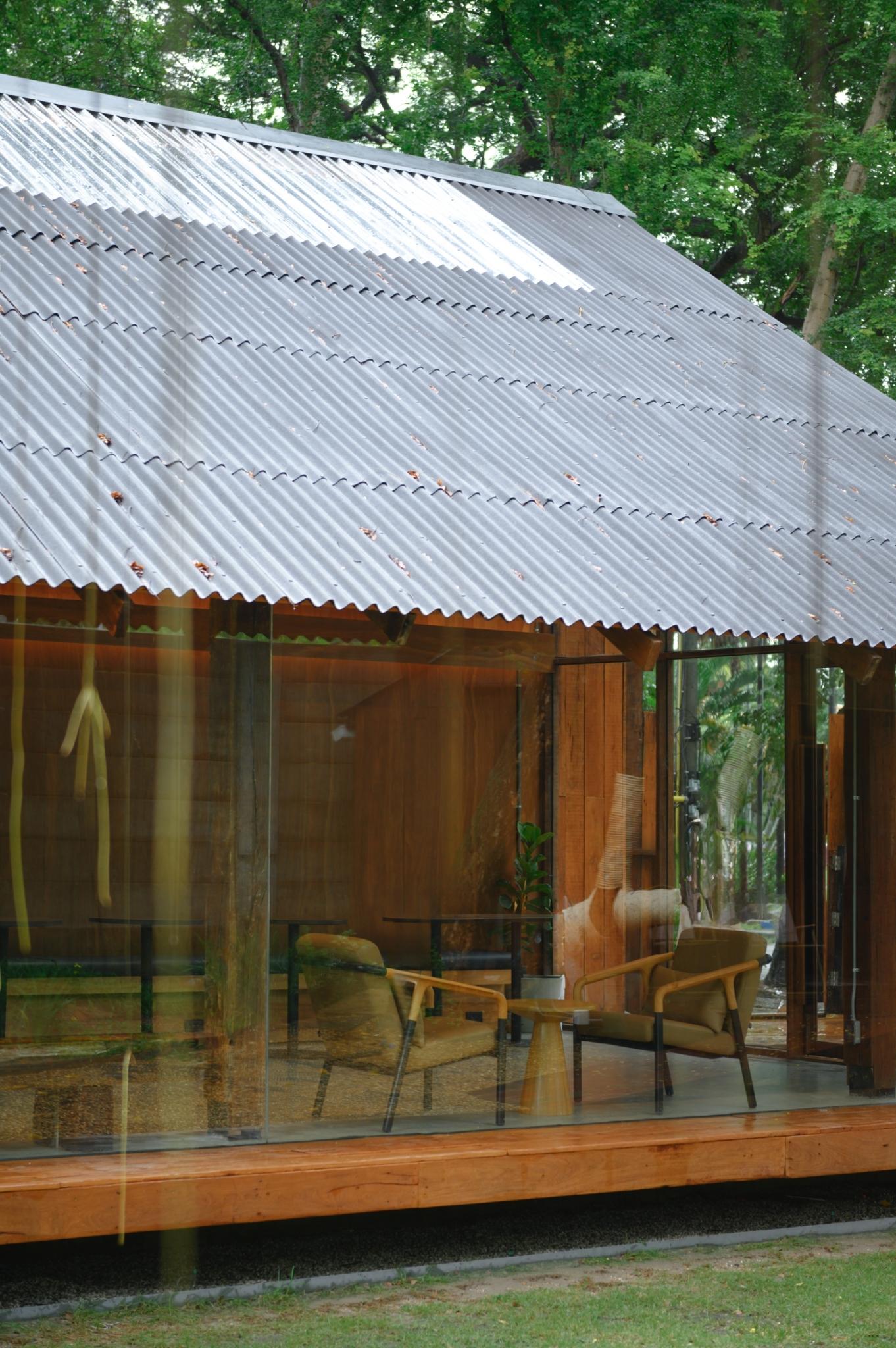 Góc nhìn chéo mái cho thấy tấm mái tôn bán trong suốt, cho phép ánh sáng dịu đi vào không gian bên trong. Hệ mái đơn giản nhưng hiệu quả trong điều kiện khí hậu nhiệt đới