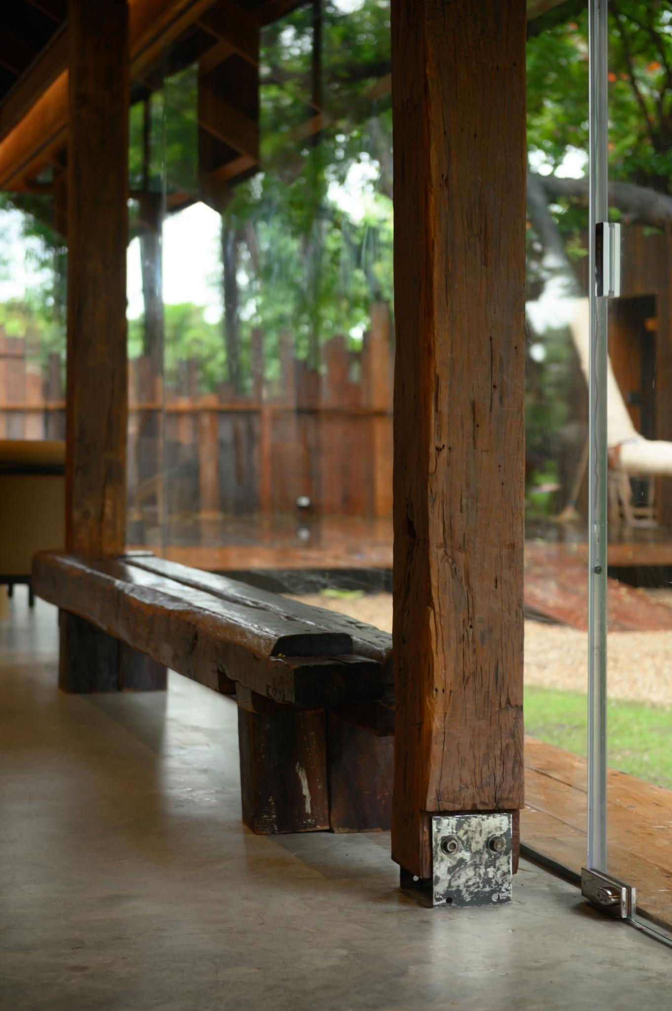 Cột gỗ cũ và ghế dài được giữ nguyên vết tích thời gian, tạo cảm giác mộc mạc và chân thật. Không gian ngồi sát kính cho phép người dùng vừa nghỉ ngơi vừa quan sát khu vườn