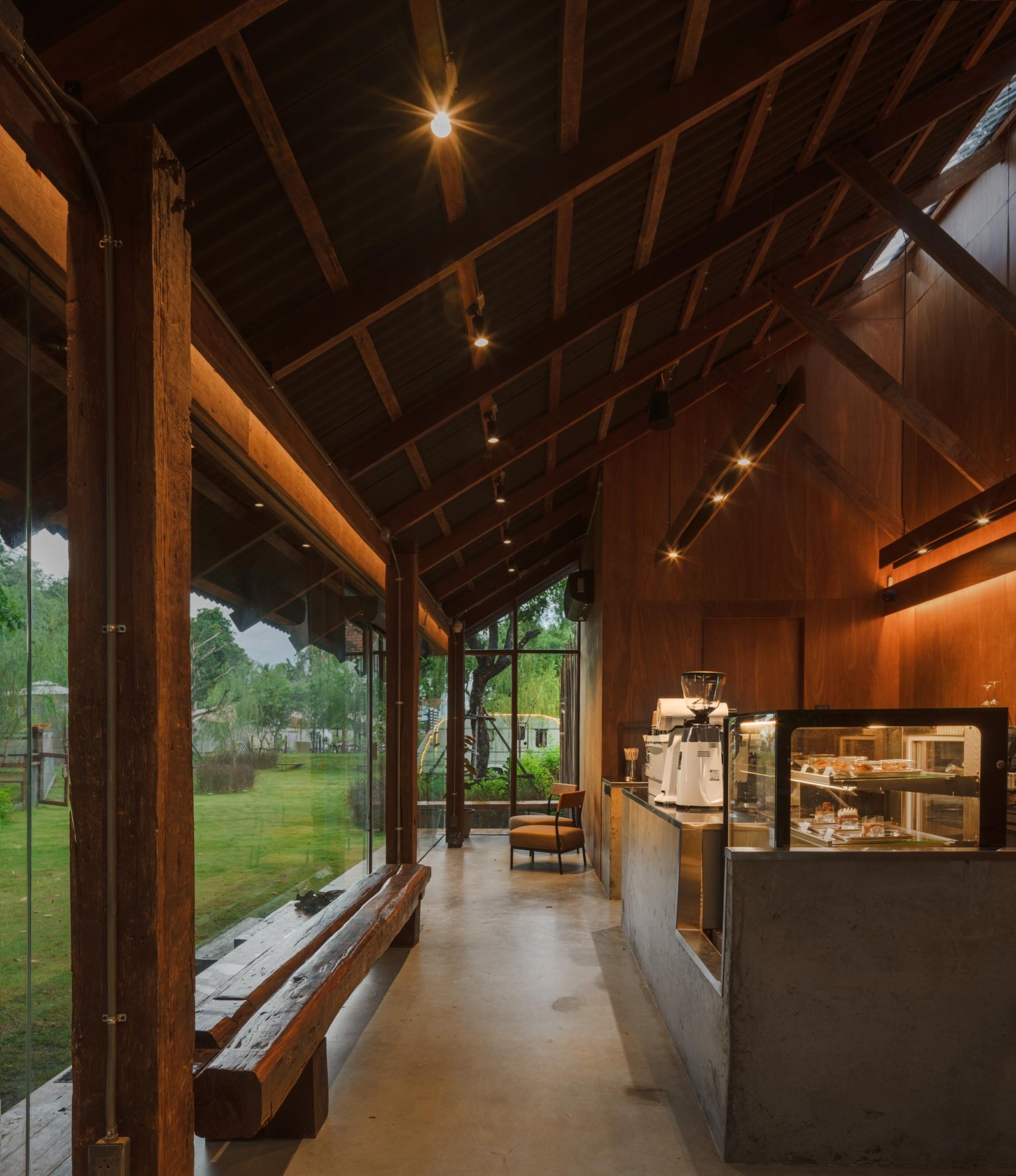 Bên trong quán, kính lớn được sử dụng ở mặt Bắc, kết hợp với skylight (giếng trời - ô lấy sáng trên mái) để đưa ánh sáng tự nhiên vào sâu trong không gian. Nhờ đó, ban ngày gần như không cần dùng đến đèn điện, mà vẫn đủ sáng và dễ chịu.