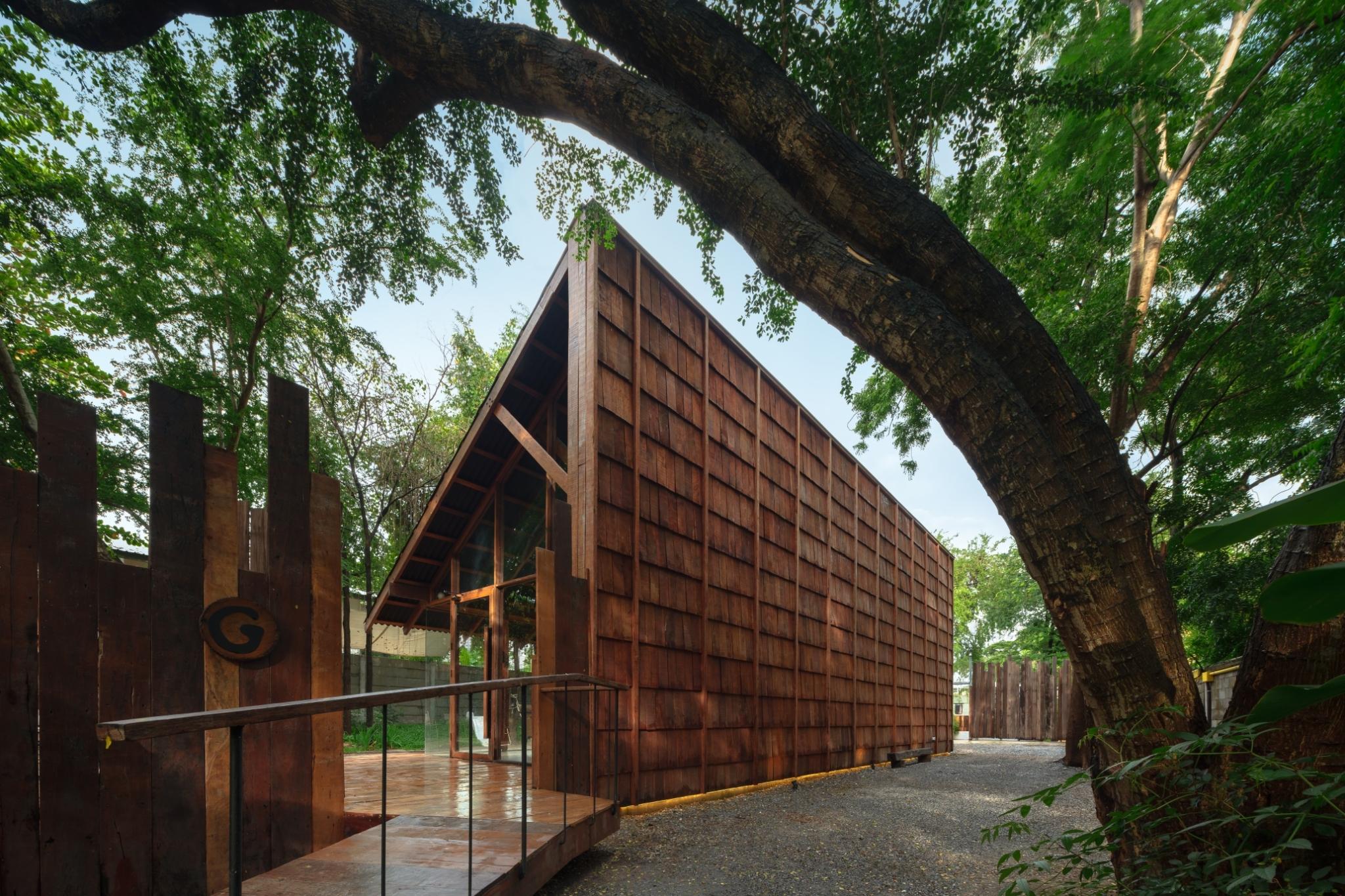 Mặt bên công trình với mảng tường gỗ lớn đóng vai trò như phông nền cho sinh hoạt ngoài trời