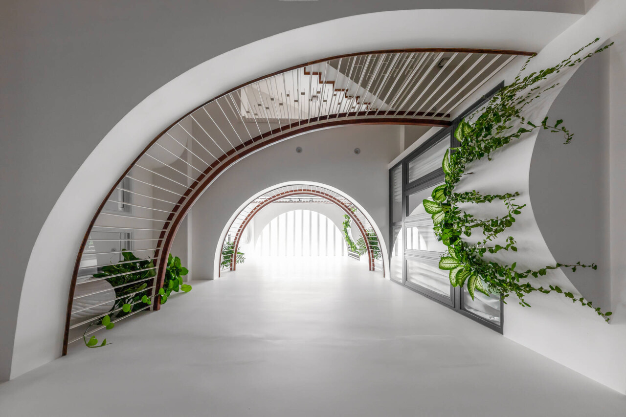 Vì kinh phí đầu tư xây dựng không nhiều nên các KTS lựa chọn sơn toàn bộ ngôi nhà cũng như lan can bằng màu trắng để đơn giản về thi công và giảm giá thành vật liệu. Để ngôi nhà bớt phần đơn điệu, KTS đã sử dụng giải pháp khoét lỗ thông tầng với các đường cong khác nhau cho từng tầng để mang đến sự sinh động và mềm mại hơn.