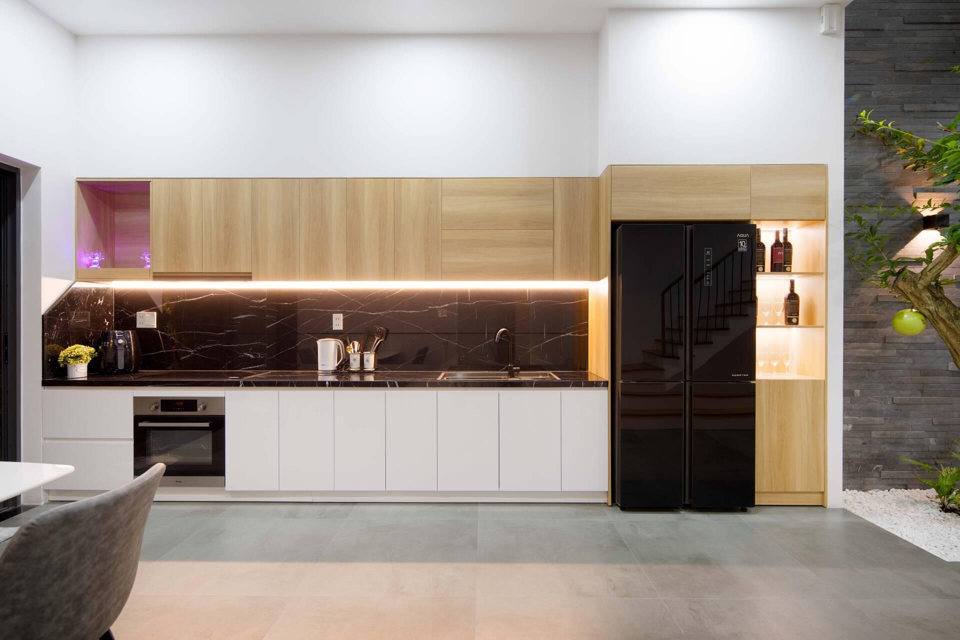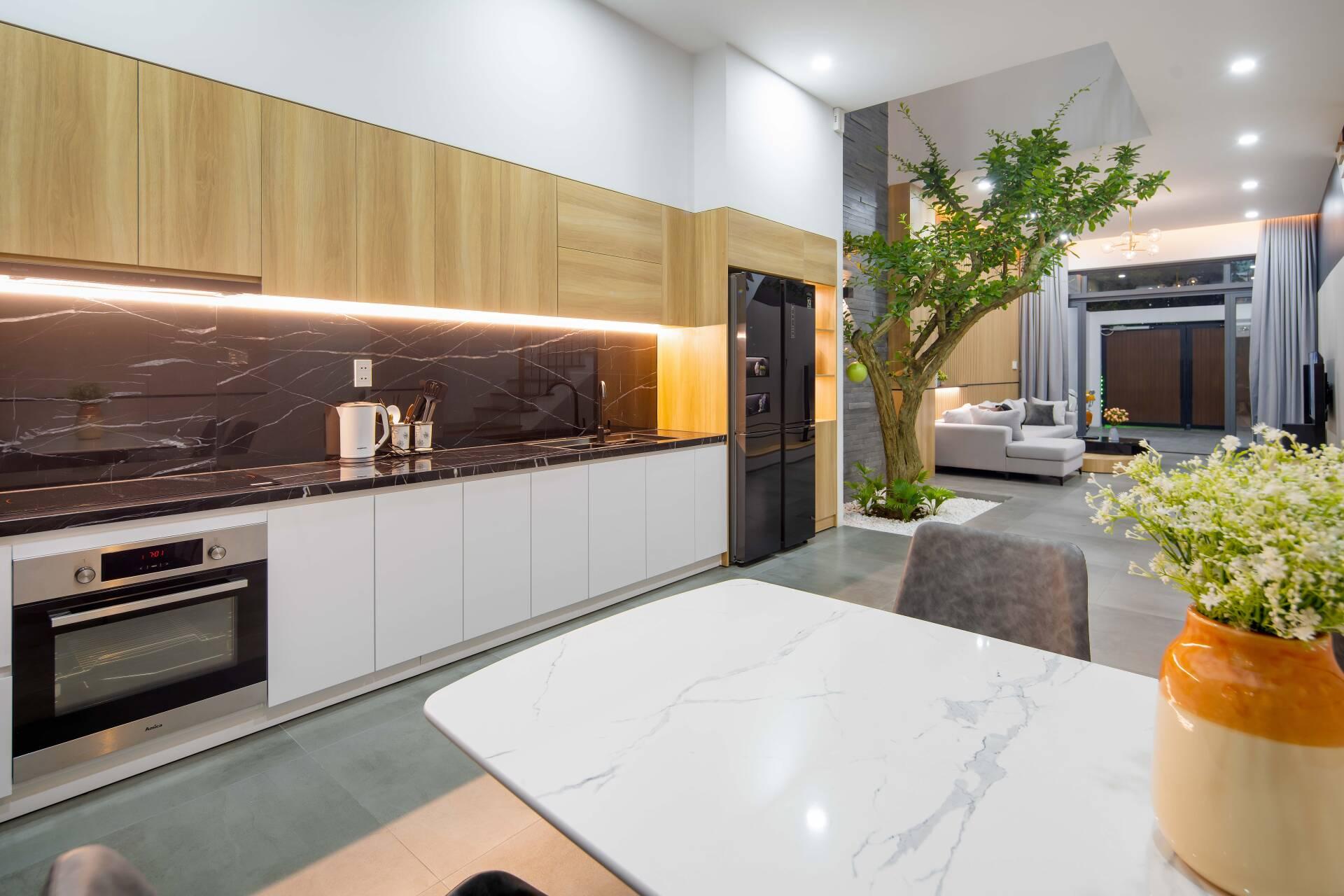 Hệ tủ bếp bằng gỗ MDF, phối cùng bàn bếp được ốp đá marble sang trọng