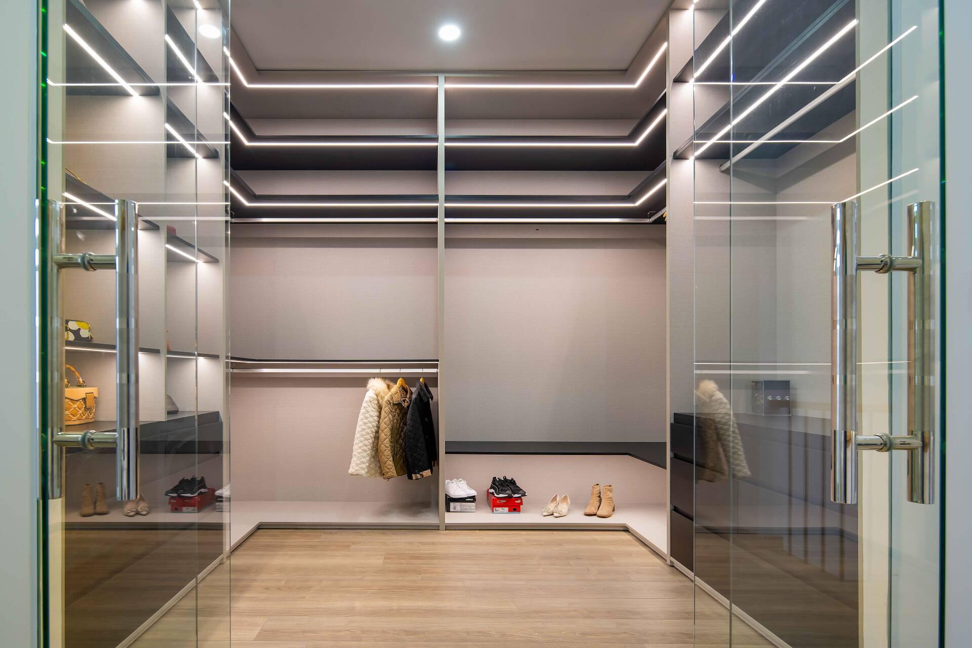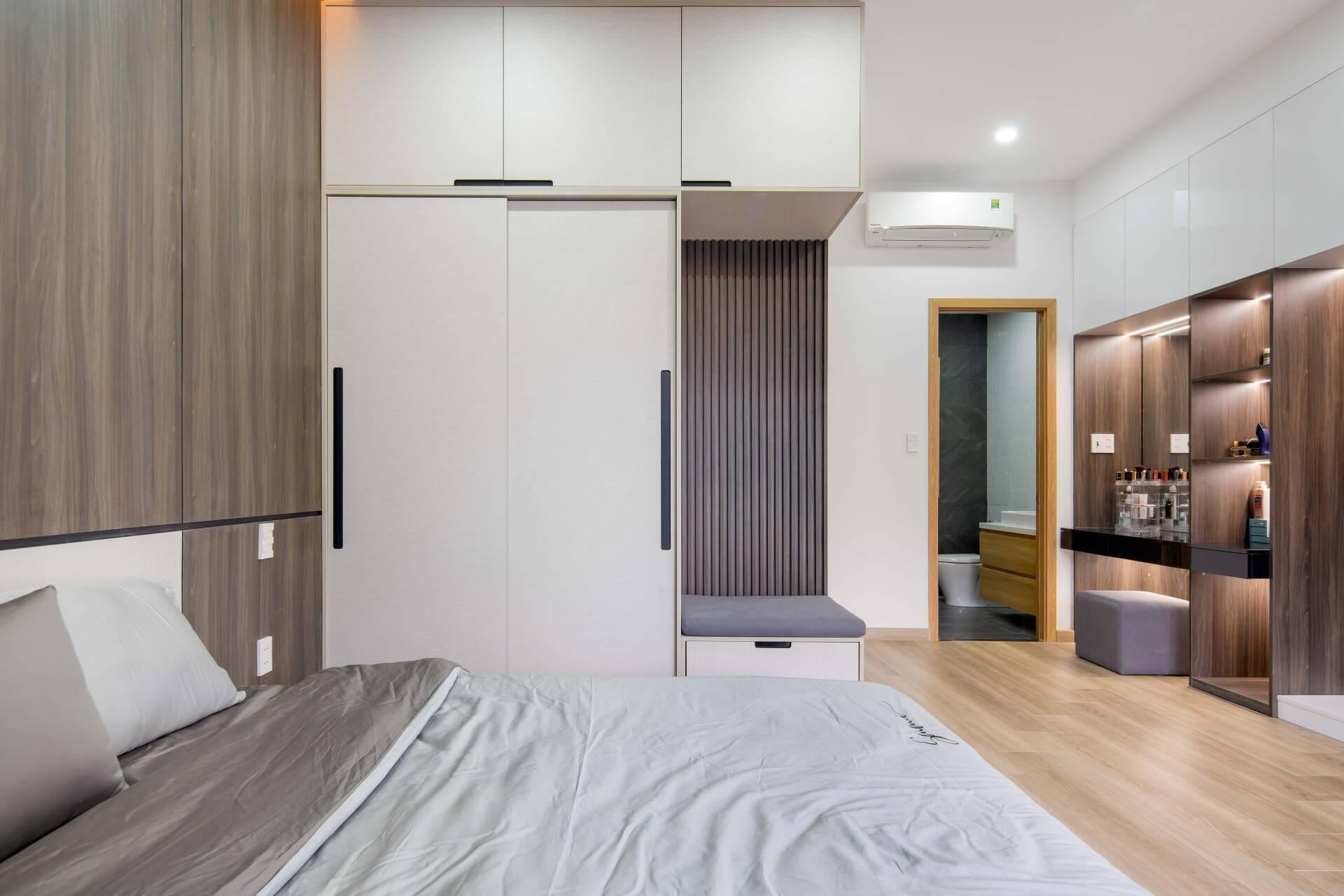 Để tiết kiệm không gian, hệ tủ quần áo được đóng chạm trần. Bên cạnh đó, có một ghế ngồi nhỏ ở cạnh tủ quần áo rất tiện nghi