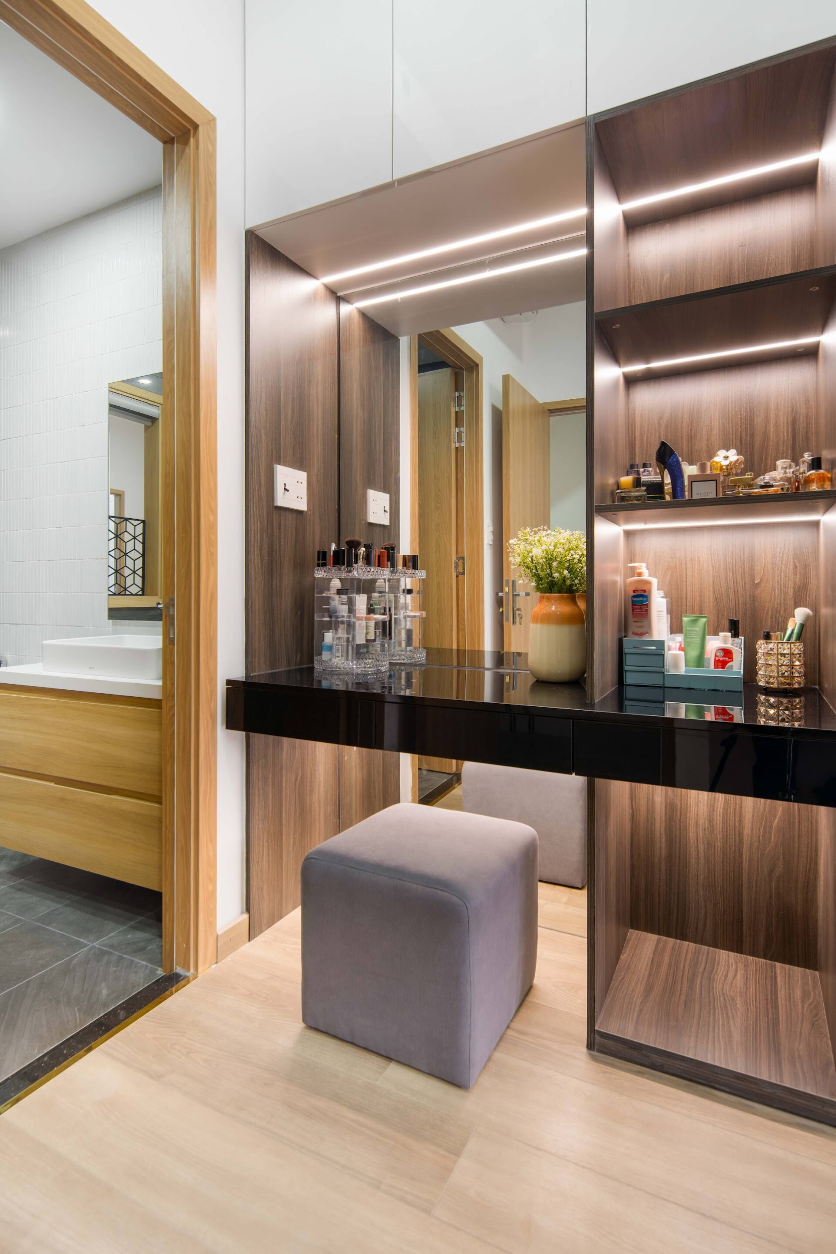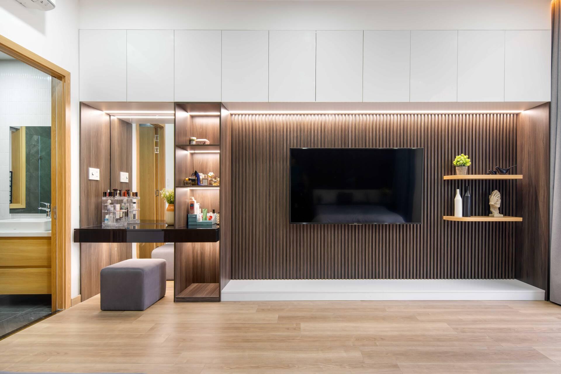 Tạo điểm nhấn cho không gian là bàn trang điểm và kệ tủ trang trí ở đối diện giường, KTS sử dụng gam màu gỗ nâu tối, thay vì là nâu sáng như tổng thể của phòng