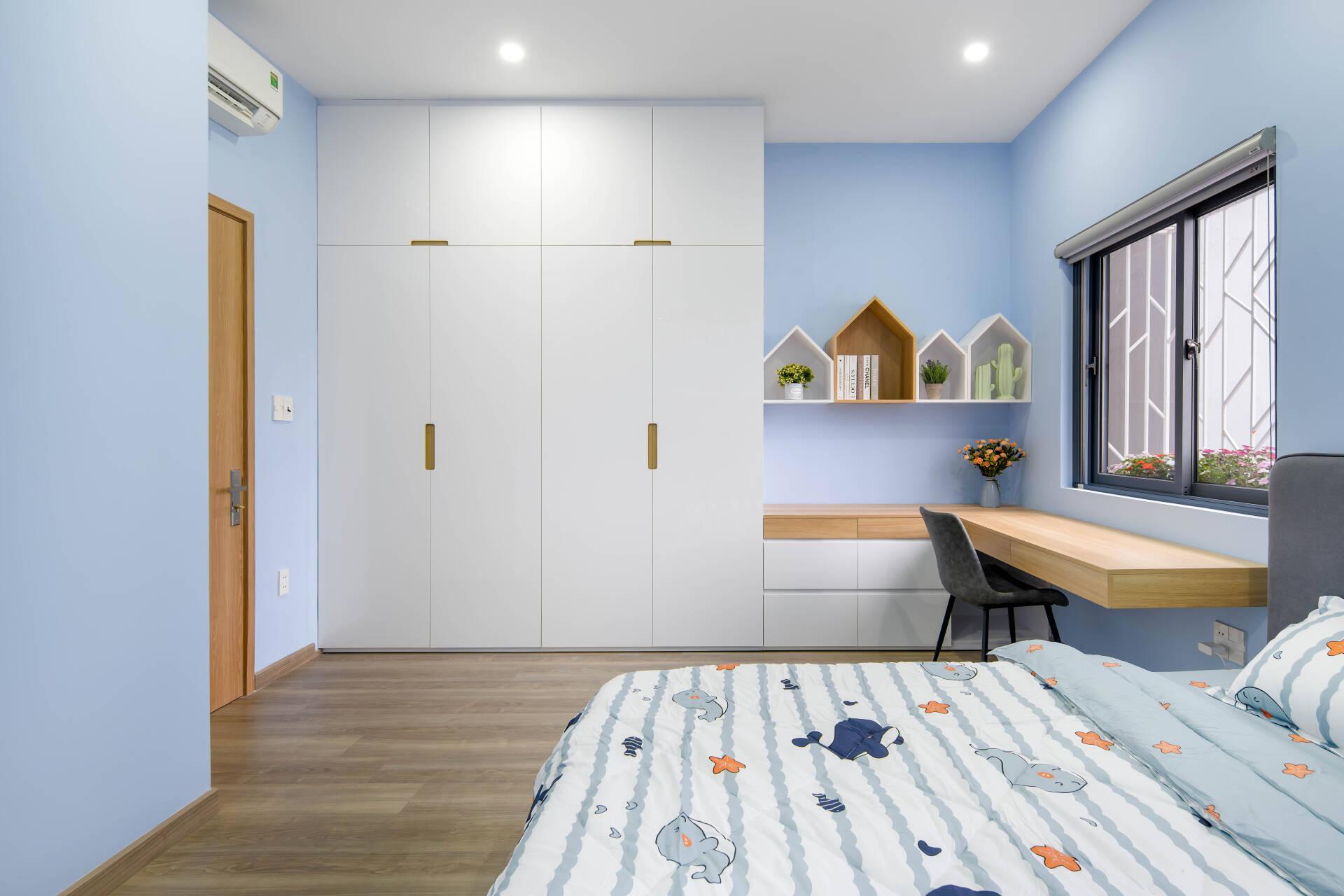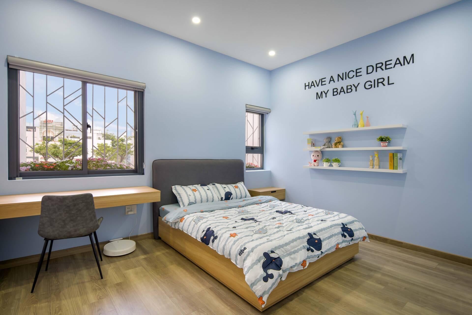 Phòng ngủ dành cho con gái của gia chủ mang gam màu xanh pastel dễ thương và cũng bổ trợ tốt cho năng lượng của nhà mệnh Thủy
