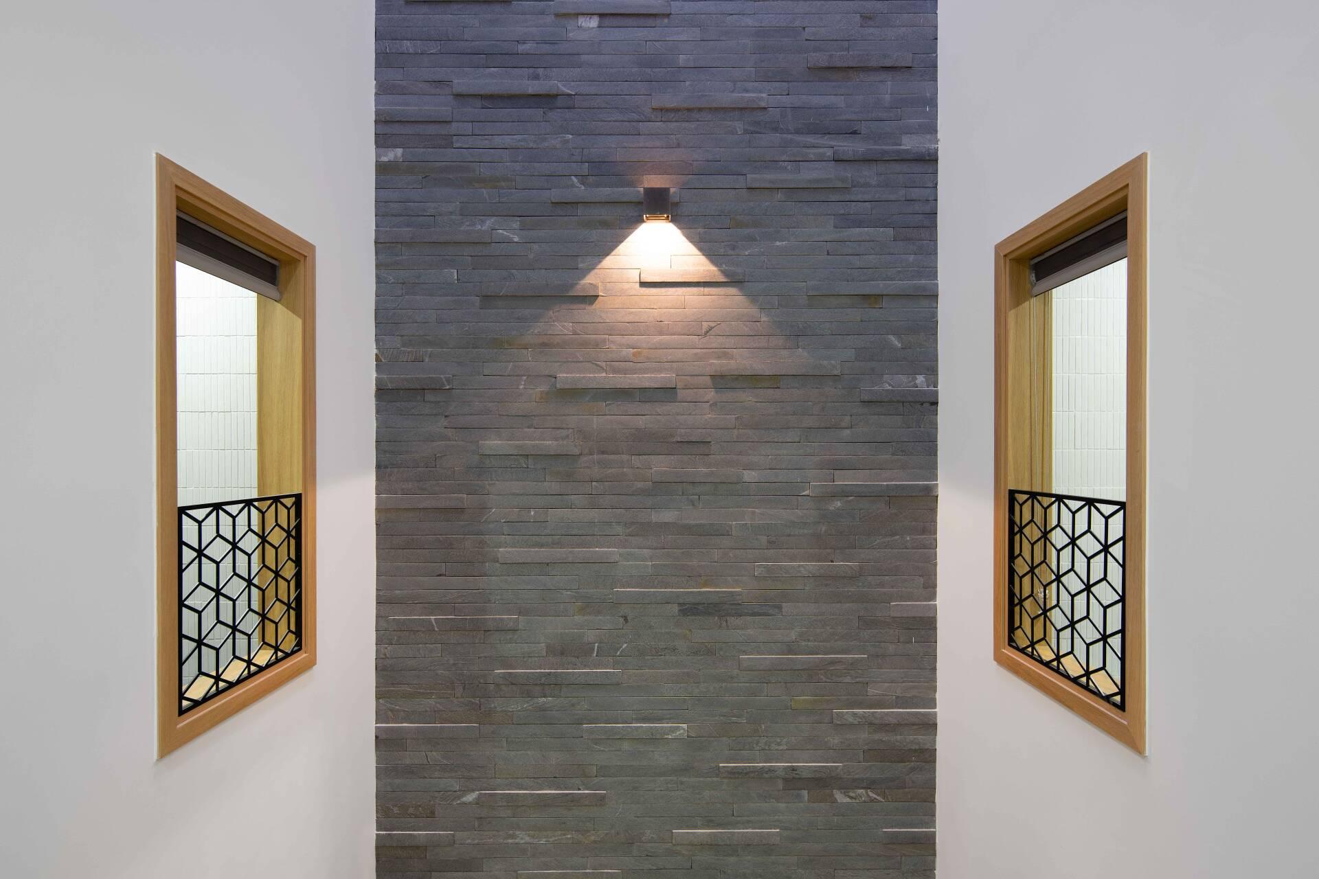 Khoảng thông tầng được ốp đá ong xám. Phòng vệ sinh ở 2 phòng ngủ tầng 2 đều kết nối ra khu vực thông tầng này