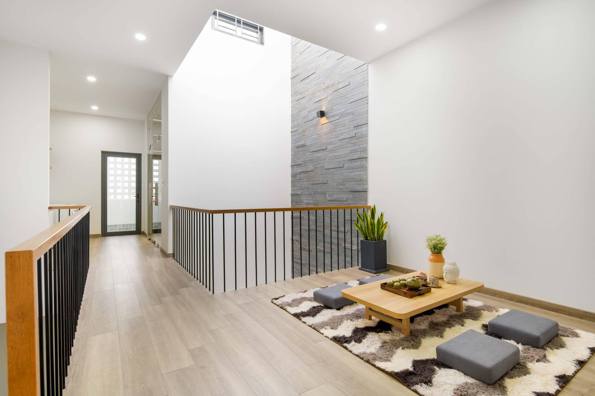 Để giải quyết vấn đề thiếu sáng và bí khí, KTS đã thiết kế một khoảng thông tầng ở giữa nhà