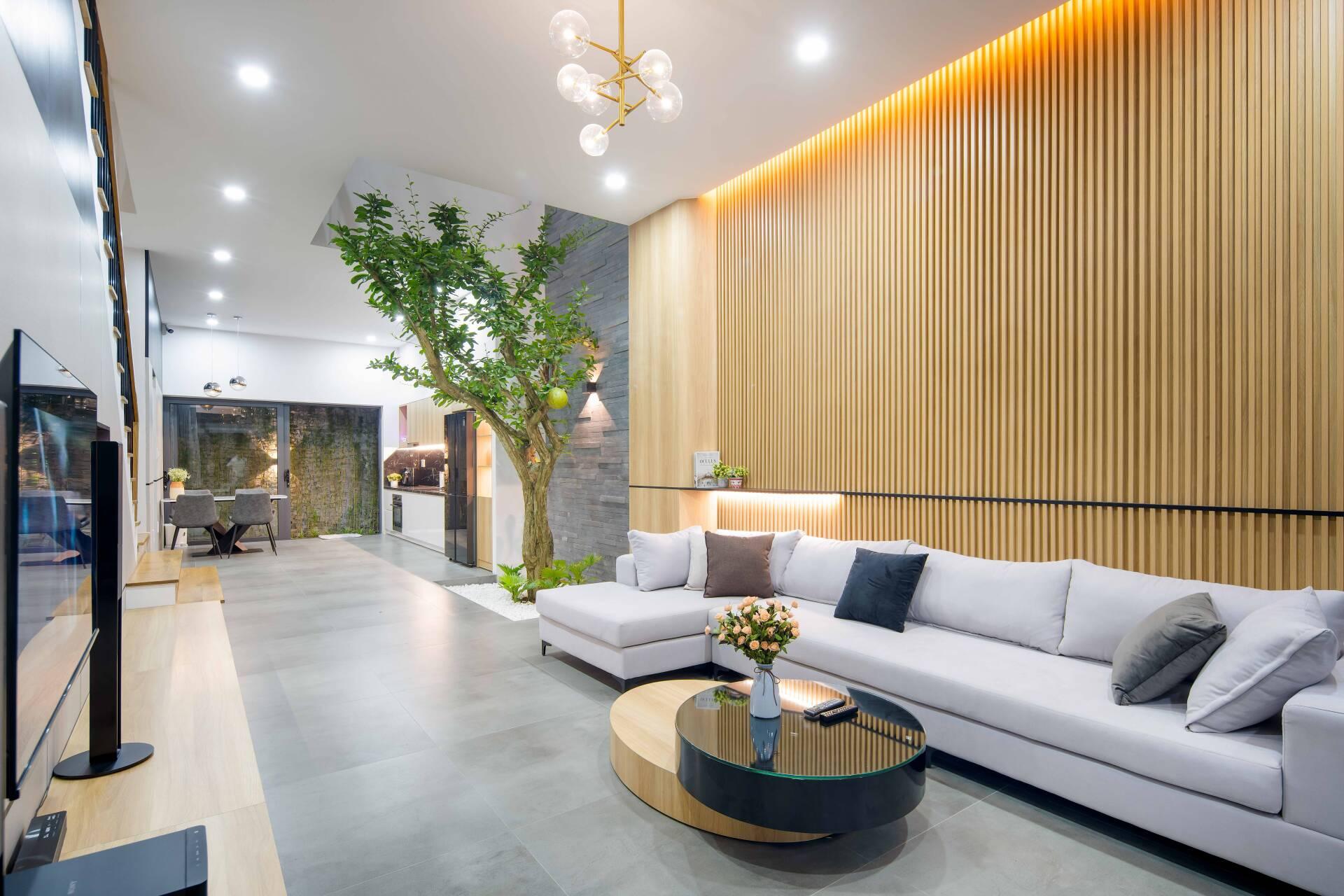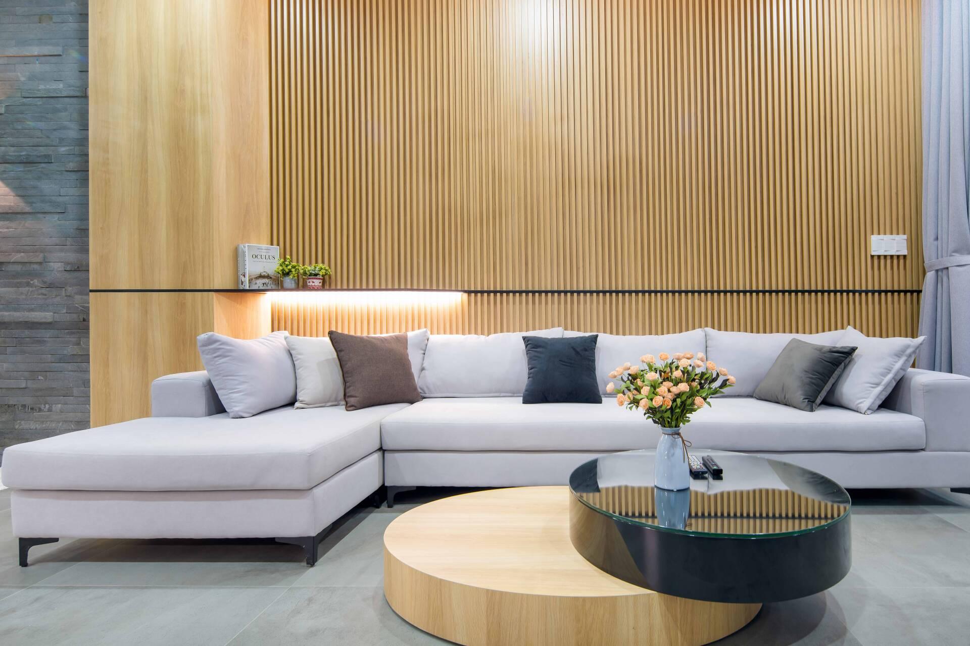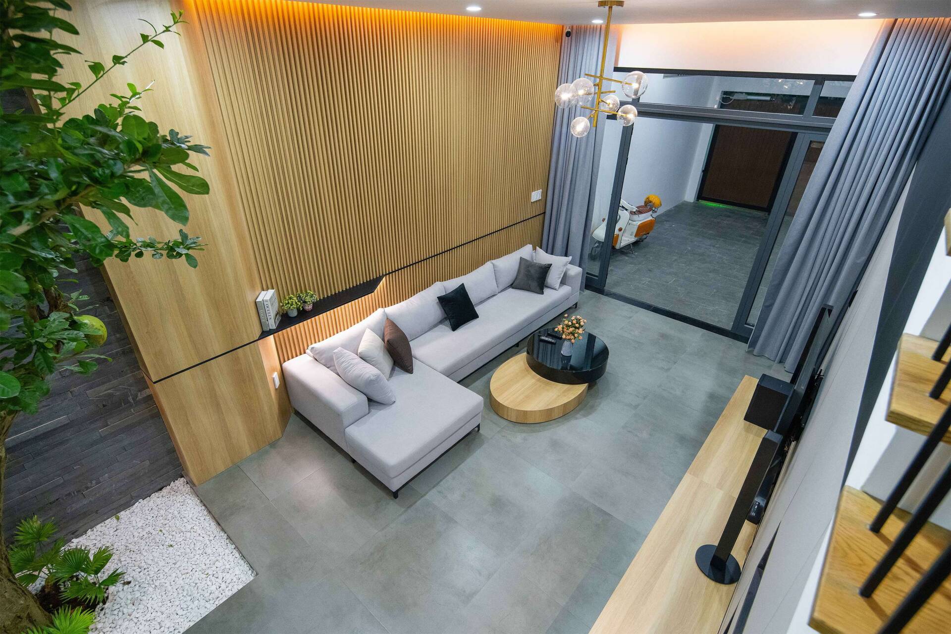 Để không gian có điểm nhấn, tường phía sau ghế sofa được ốp lam gỗ sáng màu