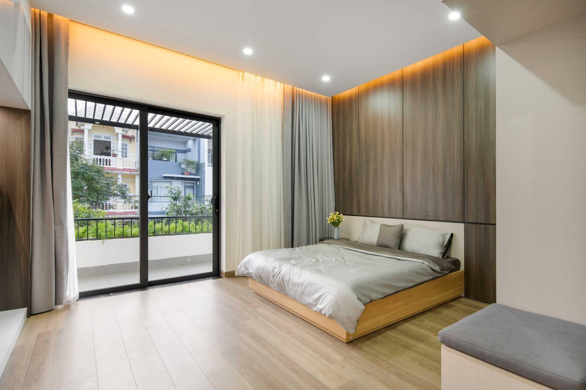 Phòng ngủ master có không gian rộng rãi, ban công nhìn ra khu phố
