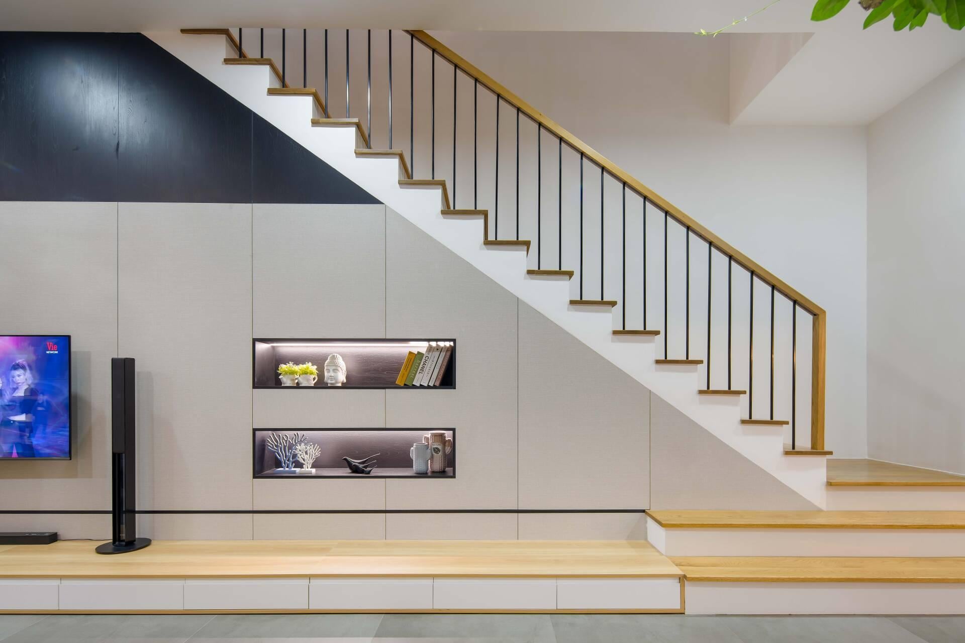 Gầm cầu thang được tận dụng làm kệ để đồ rất sáng tạo
