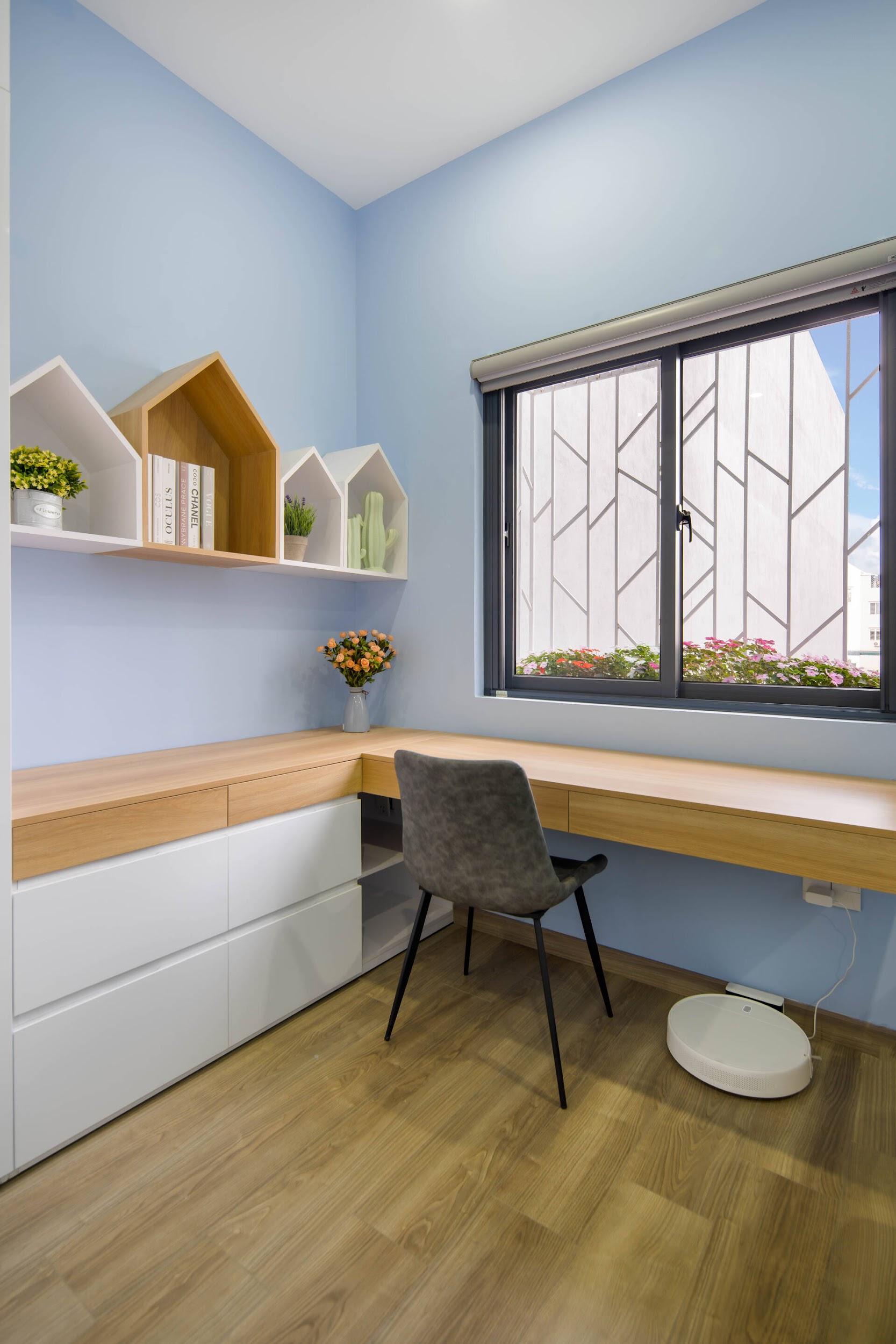 Bàn học của bé có cửa sổ hướng ra phía sau nhà, tối ưu ánh sáng tự nhiên cho khu vực này