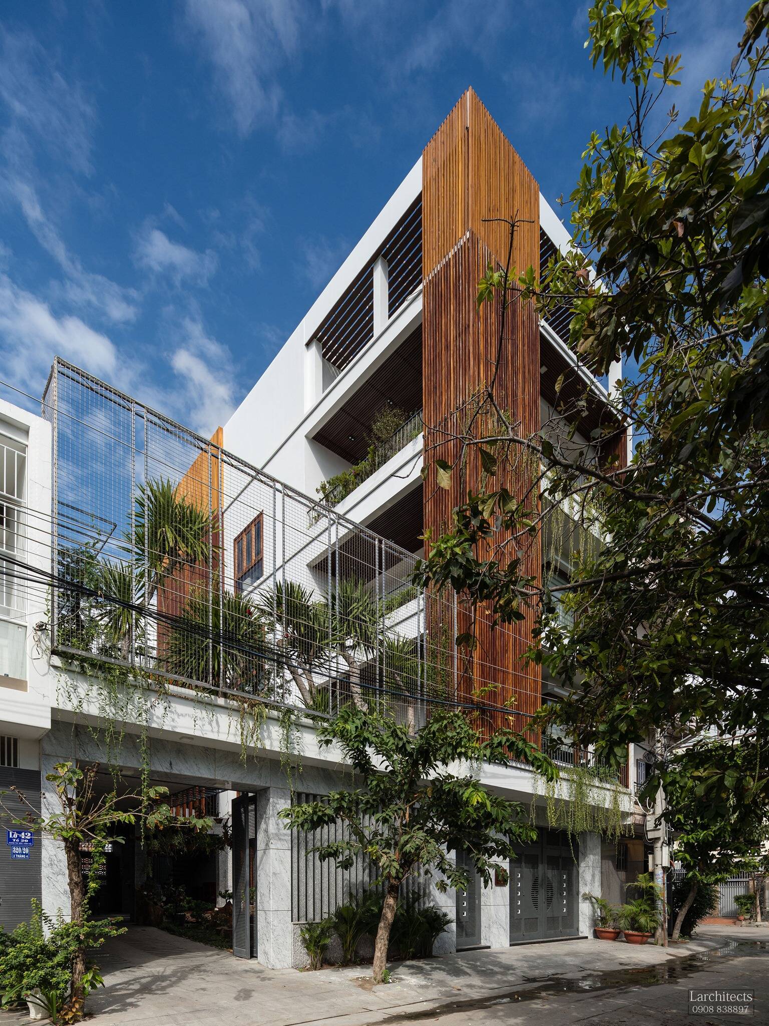 Mặt tiền lam gỗ và cây xanh giúp giảm nhiệt, tăng tính riêng tư.