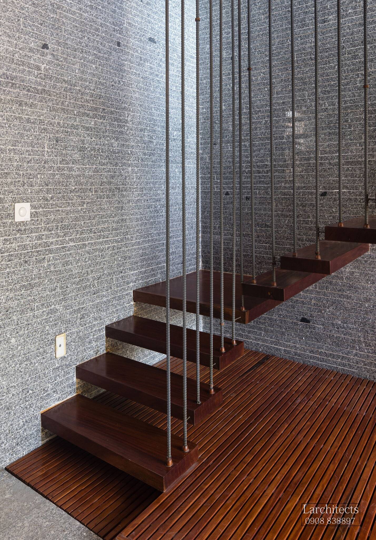Cầu thang lên tầng 2 dạng bậc gỗ treo độc đáo, hài hòa với bức tường xám tạo cảm giác tự nhiên, gần gũi nhưng sang trọng