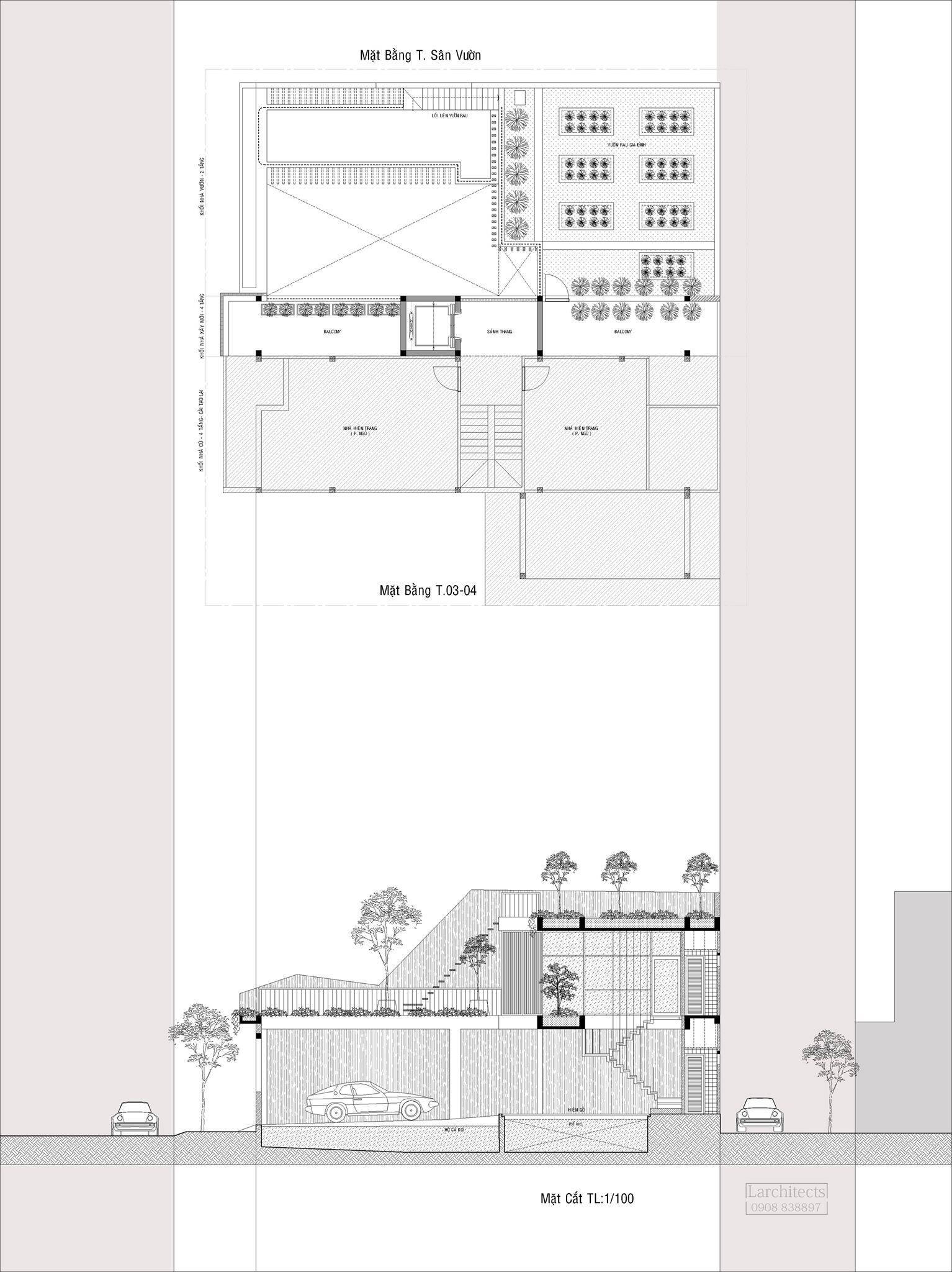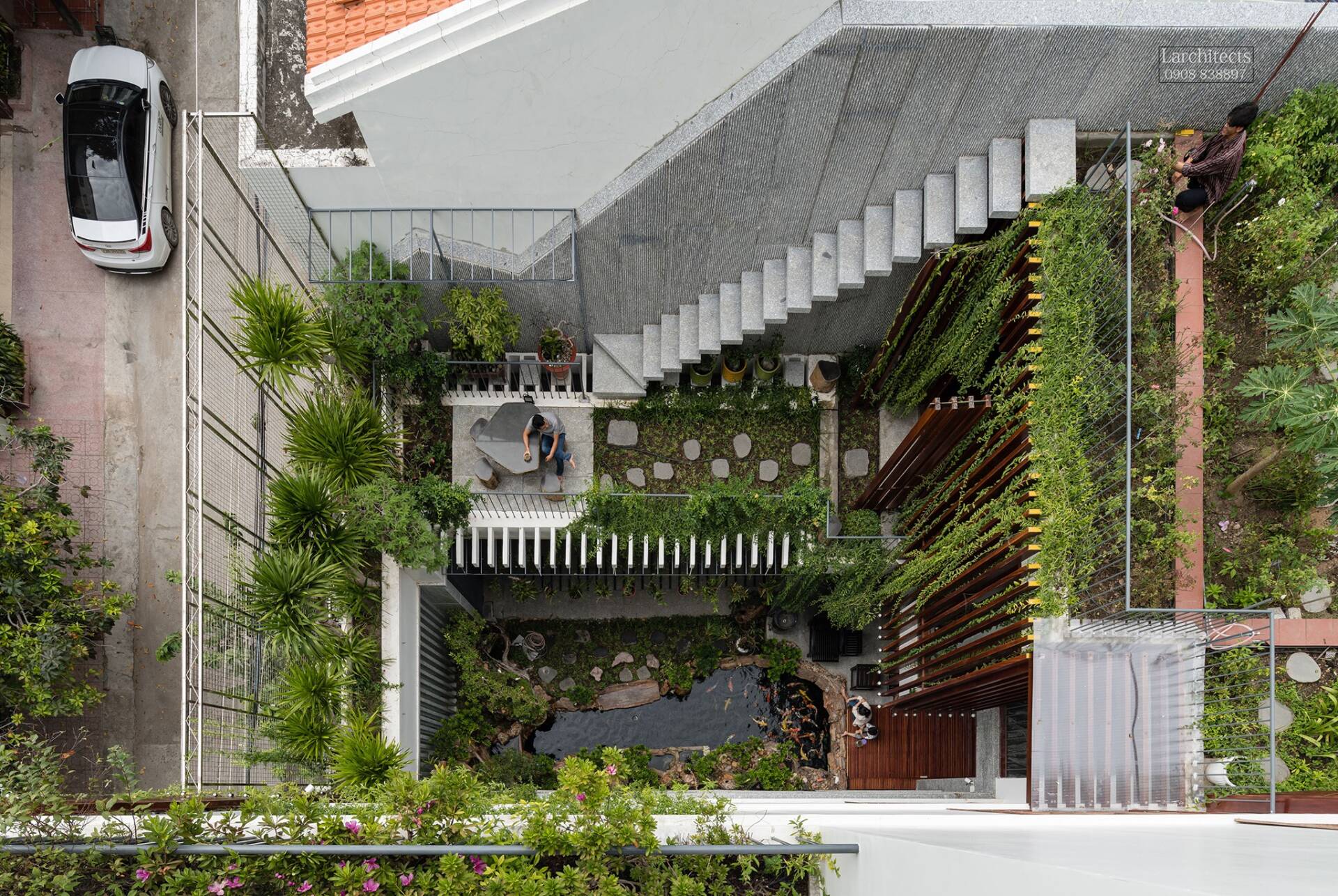 Khu vườn chính là yếu tố quan trọng nhất trong Roof Gardens. KTS chia sẻ: “Thay vì có một khoảng sân lớn như đa số hiện nay, chúng tôi tạo ra rất đa dạng khoảng sân vườn ở các cao độ khác nhau, phù hợp với cấu trúc nhà phát triển theo chiều cao và cả chiều ngang. Ở tầng 2, một khoảng sân vườn ngoài trời được tạo ra để kết nối với không gian trong nhà cũng như là không gian trung chuyển đến vườn rau trên mái qua vế thang tạo hình tự nhiên, không để lộ kết cấu, tự nhiên như chính bản thân nó.”