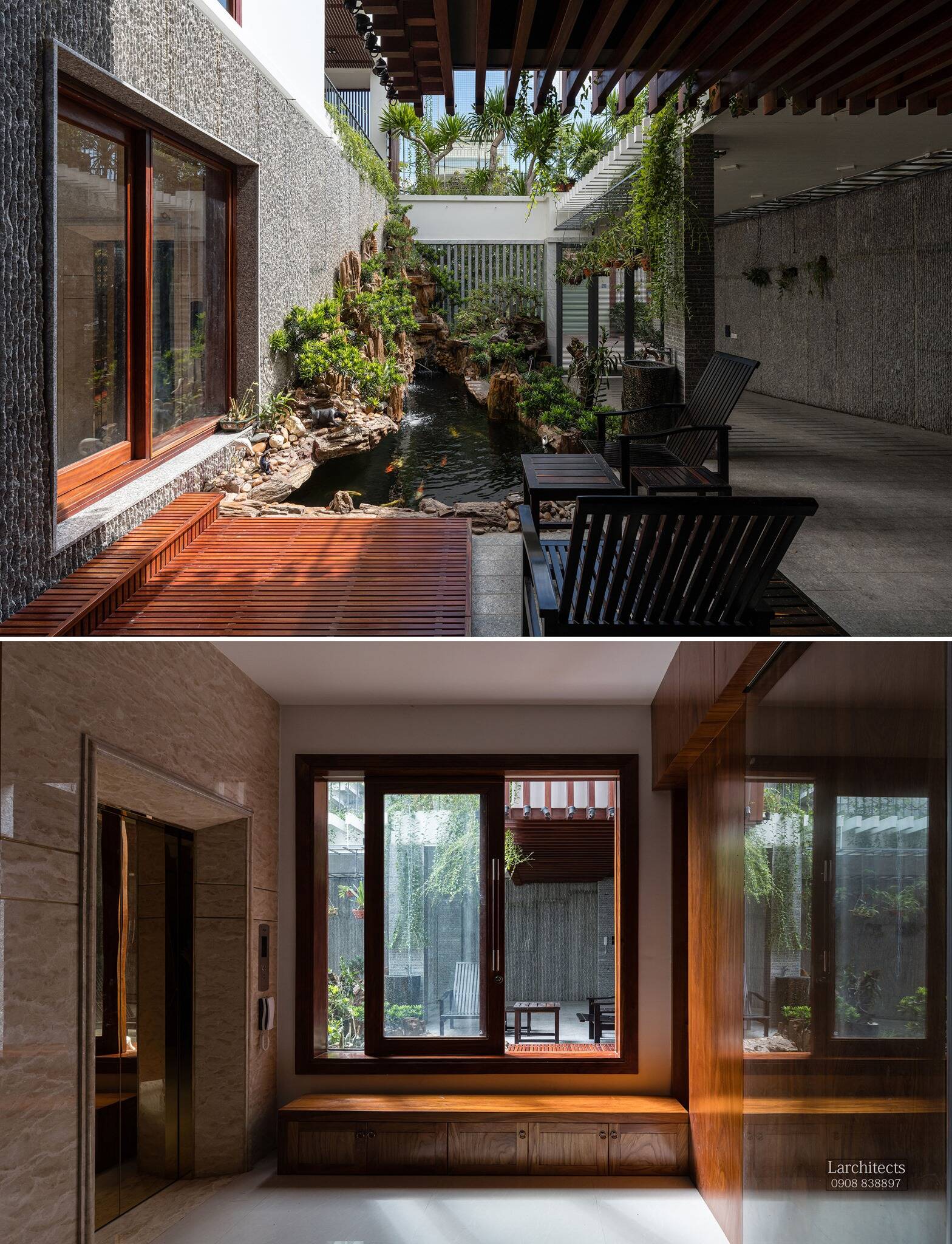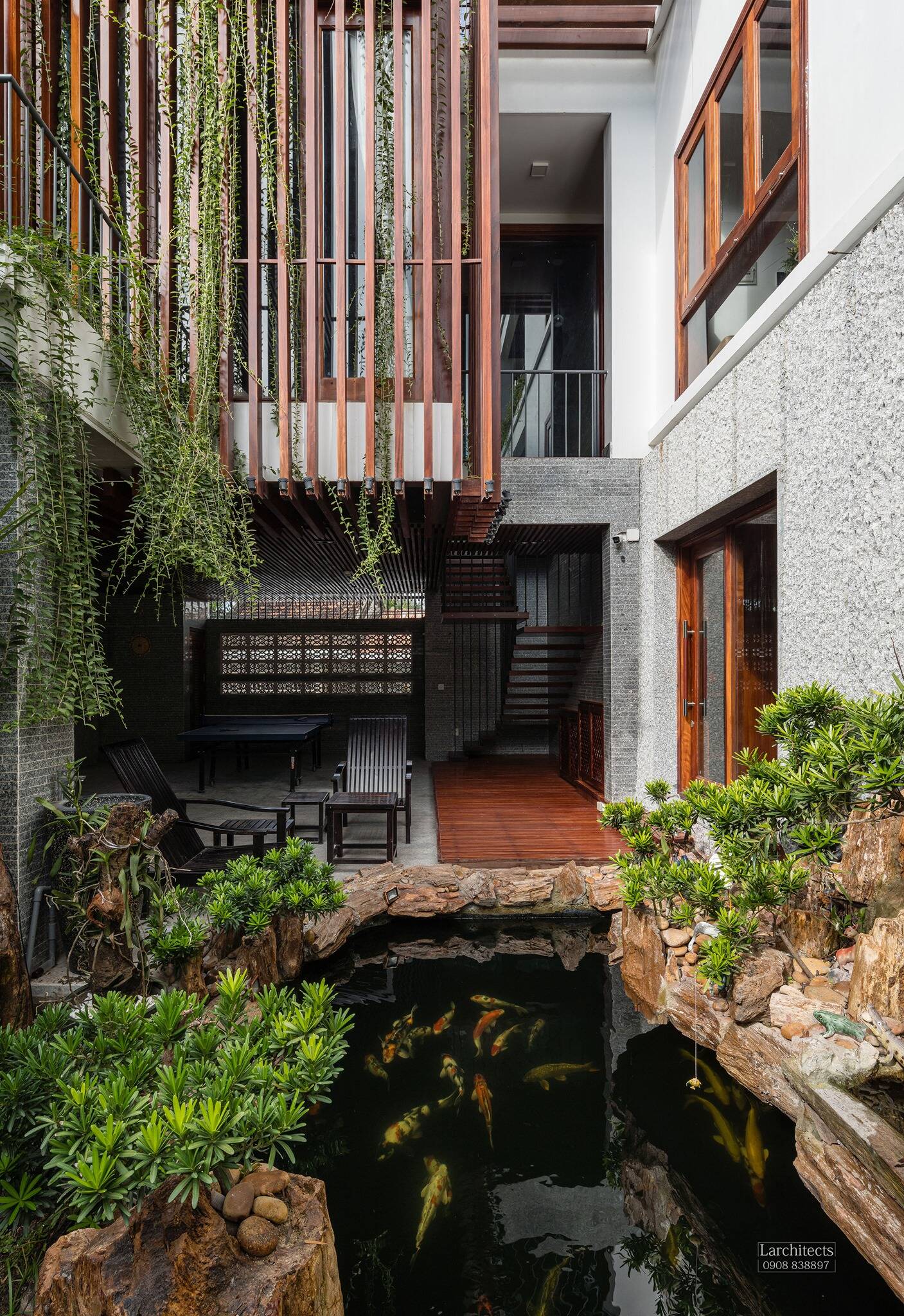 Hồ cá Koi lớn được đặt ở dưới tầng trệt, bên cạnh có bộ bàn ghế gỗ thư giãn