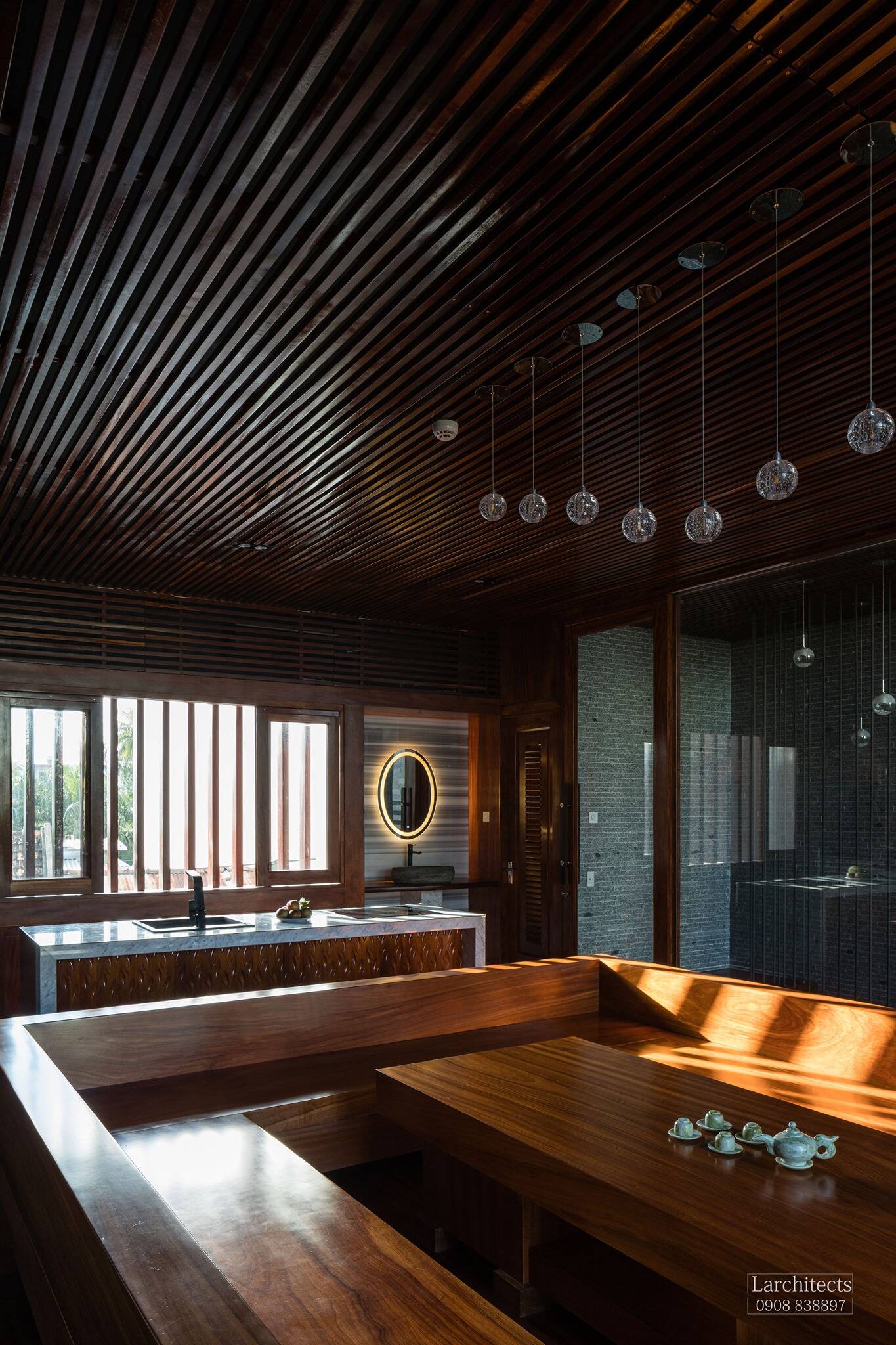 Quầy bar bếp trên tầng 2 dạng mở với không gian đón khách, phù hợp với những dịp hội họp, tụ tập người thân, bạn bè hay đối tác