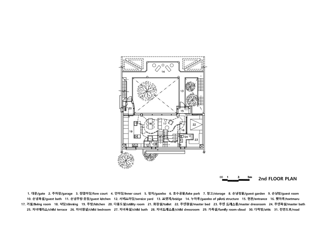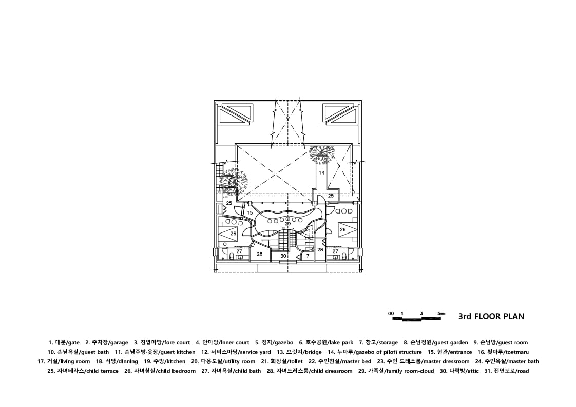Lựa chọn xây dựng tại một khu dân cư mới ven hồ ở Jeonju, công trình may mắn sở hữu một vị trí mang tính giao thoa giữa sự năng động của đô thị mới và nét tĩnh lặng cùng bề dày văn hóa của thành phố lịch sử. Với gia chủ, đây không chỉ là nơi để ở, mà là một trạm dừng chân để họ luân chuyển giữa những đối cực của cuộc sống, từ sự ồn ã của công việc kinh doanh đến sự thanh tịnh của tâm hồn.