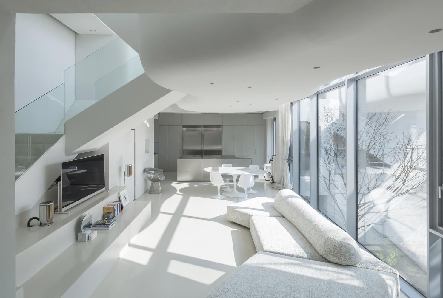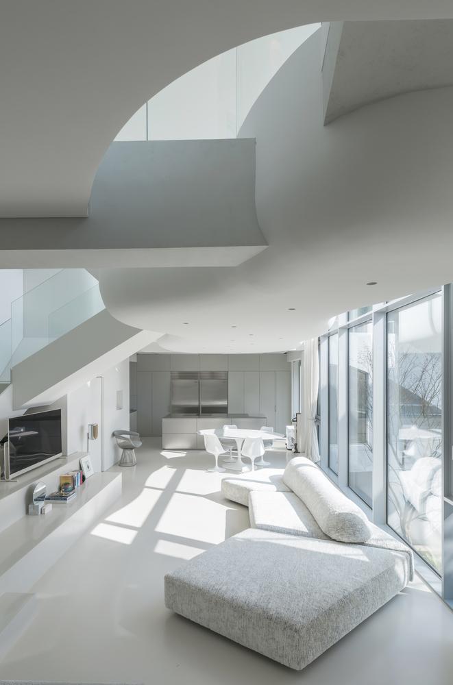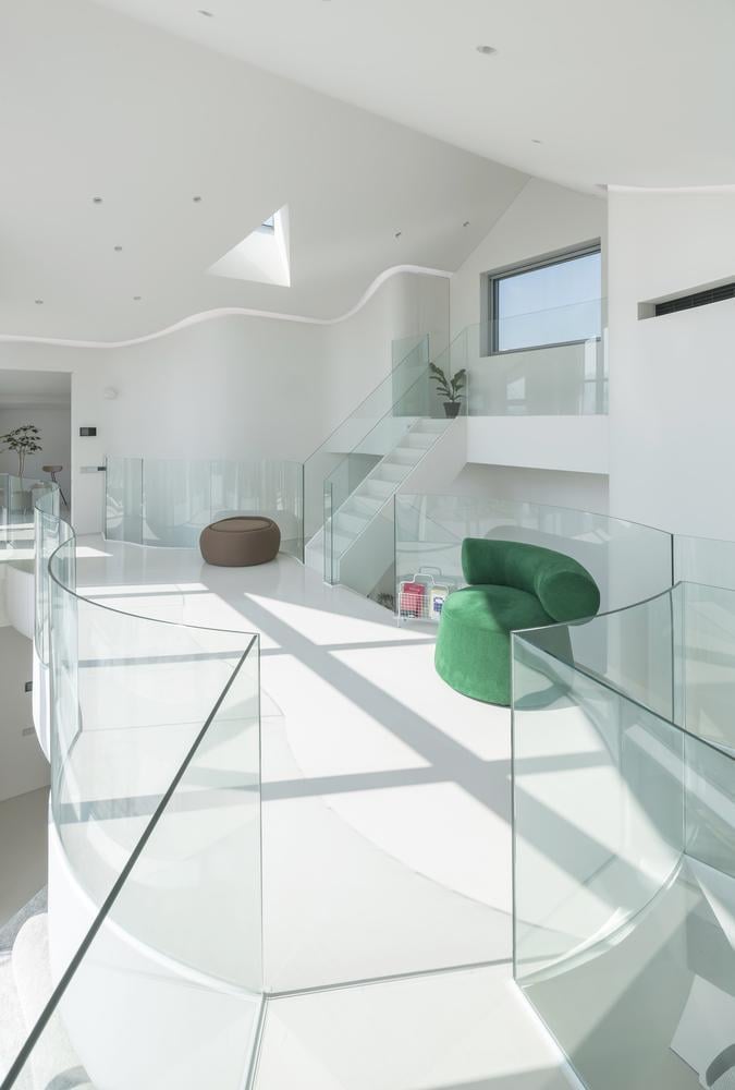 Đặc biệt, cái tên Ho-un nghĩa là đám mây trên hồ cũng chính là linh hồn của không gian nội thất. Điểm nhấn thú vị nằm ở phòng sinh hoạt gia đình được thiết kế như một khối mây lơ lửng phía trên phòng khách. Đây là một ẩn dụ kiến trúc đầy ý nghĩa, đại diện cho những ước vọng và niềm hy vọng về một tương lai hạnh phúc, gắn kết của cả gia đình.