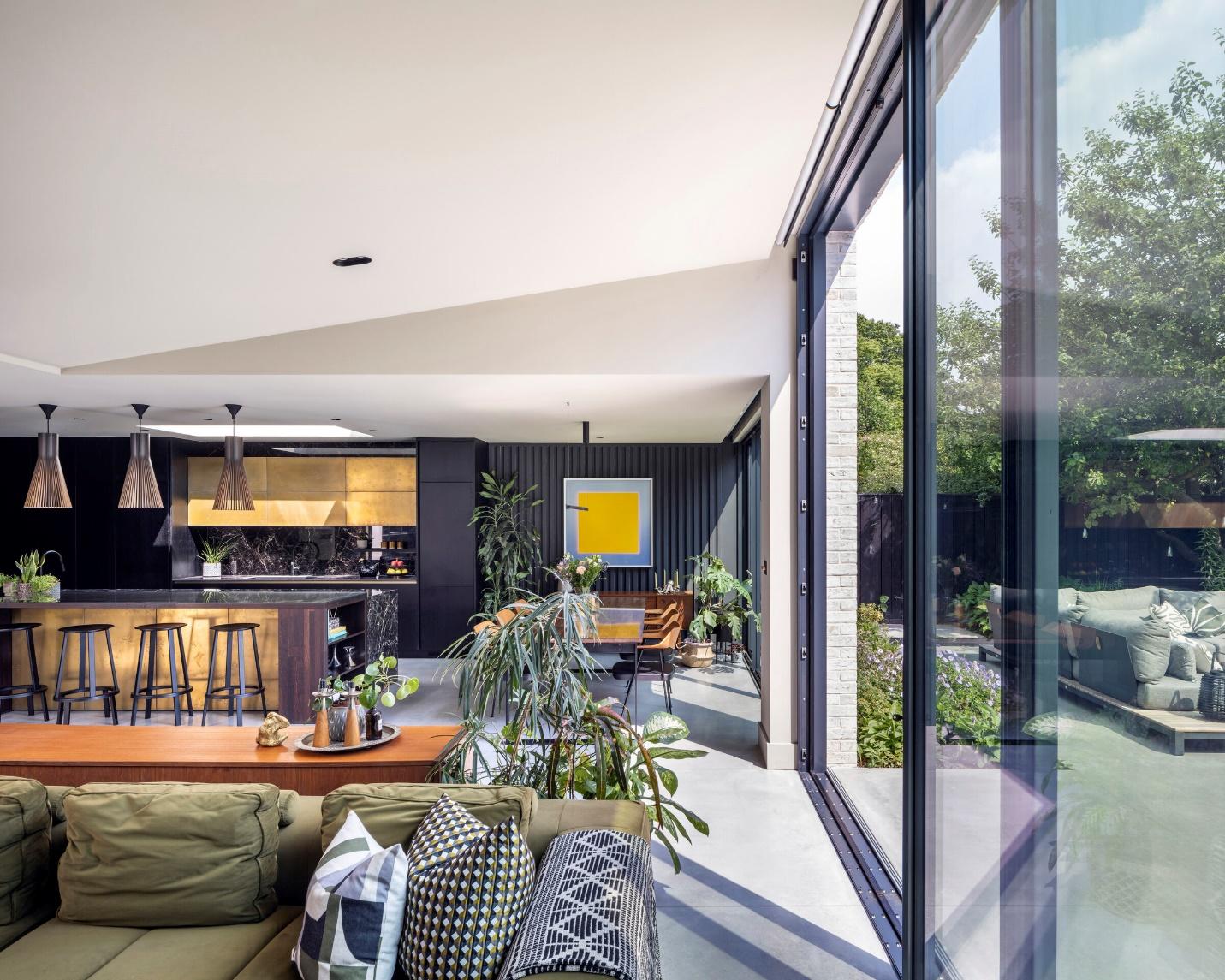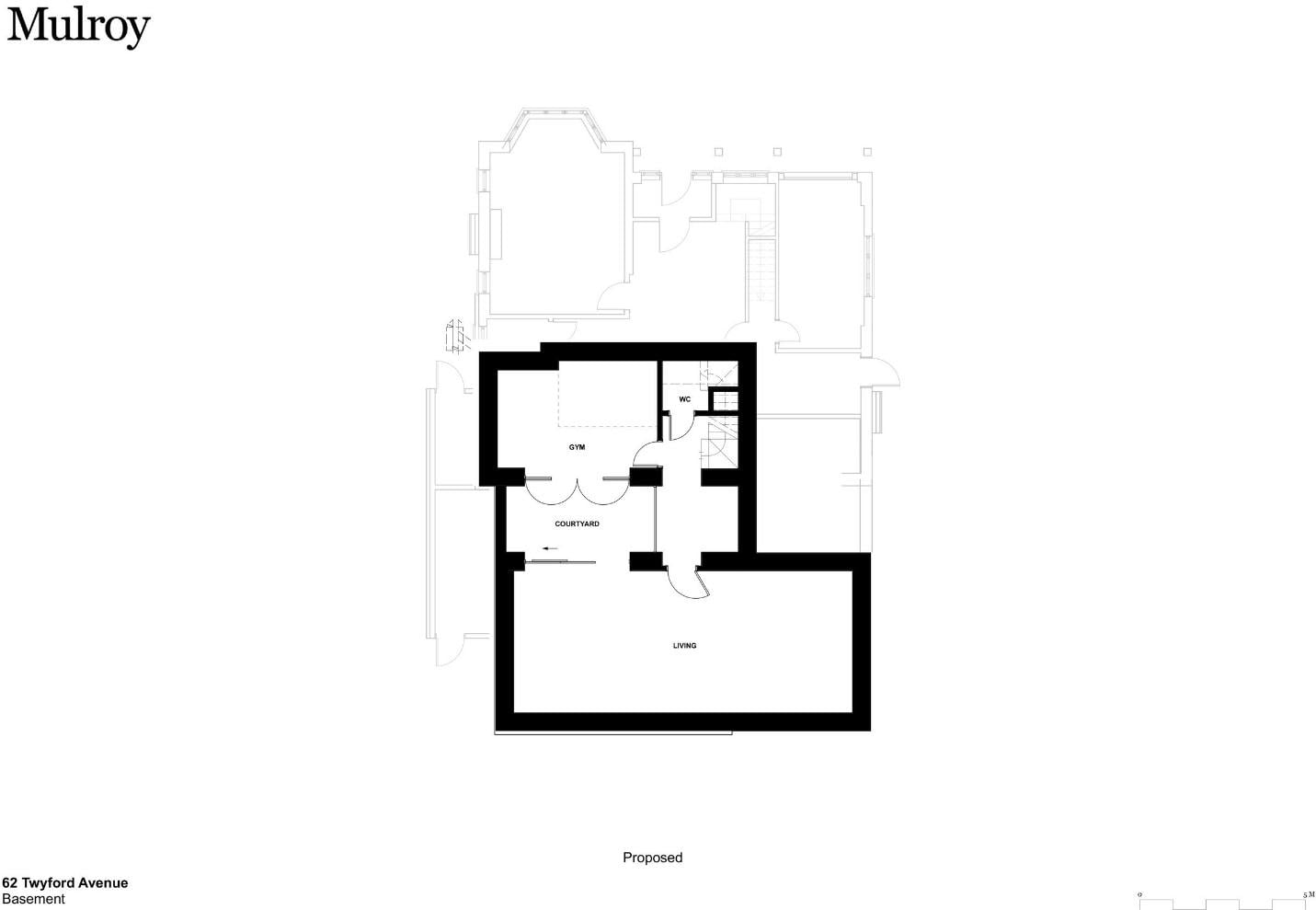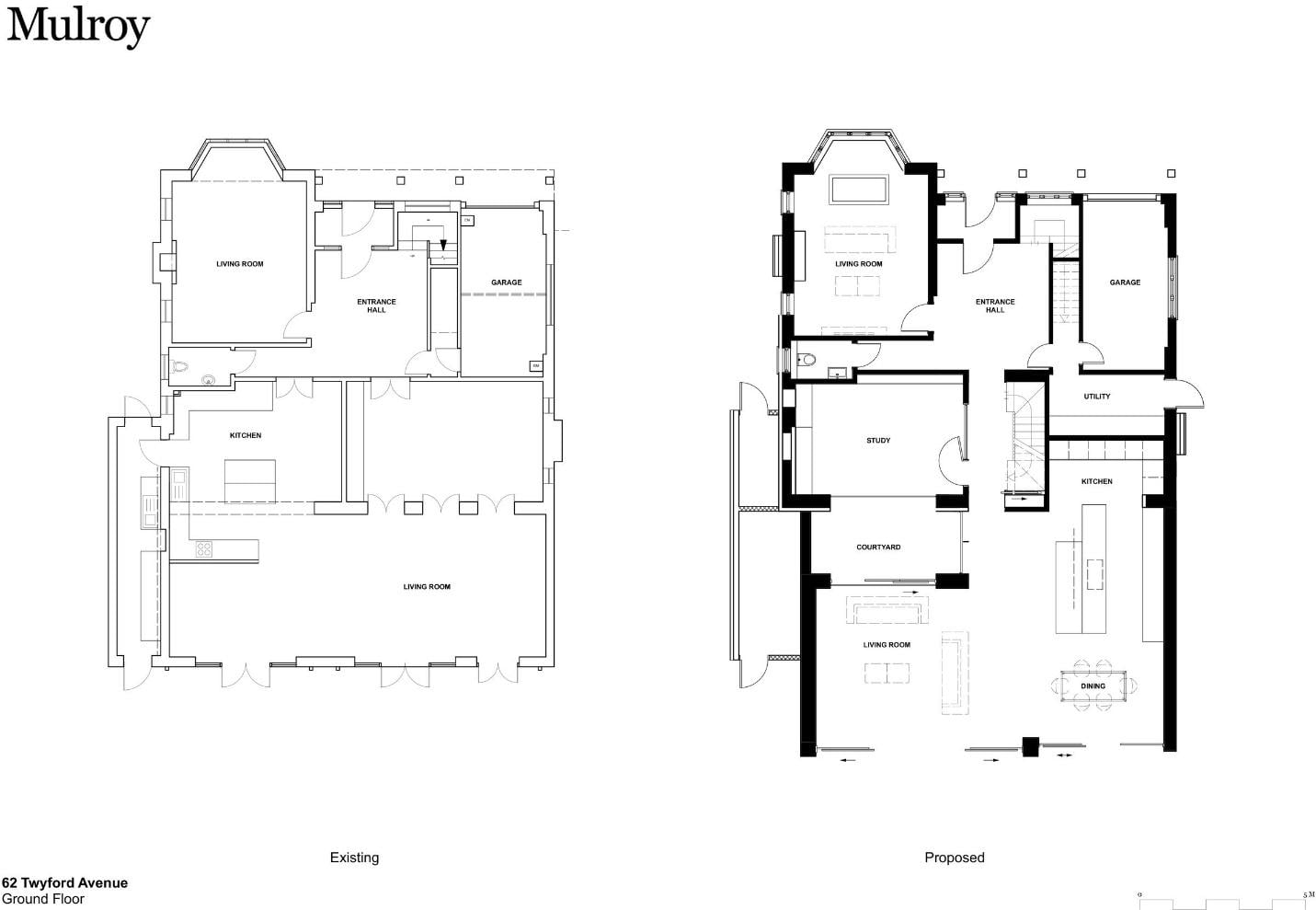 Hiện trạng công trình ban đầu là một ngôi nhà cổ đã trải qua nhiều lần cải tạo, thiếu vắng sự hài hòa về mặt kiến trúc và không gian sống với nguồn sáng tự nhiên khá hạn chế. Mulroy Architects đã khôi phục lại tỷ lệ rộng thoáng vốn có bằng cách mở rộng tầng trệt và tạo ra hai trục nhìn xuyên suốt: một trục từ cửa chính thẳng ra cuối khu vườn, và trục còn lại dẫn ánh sáng từ cầu thang lên trần cao.