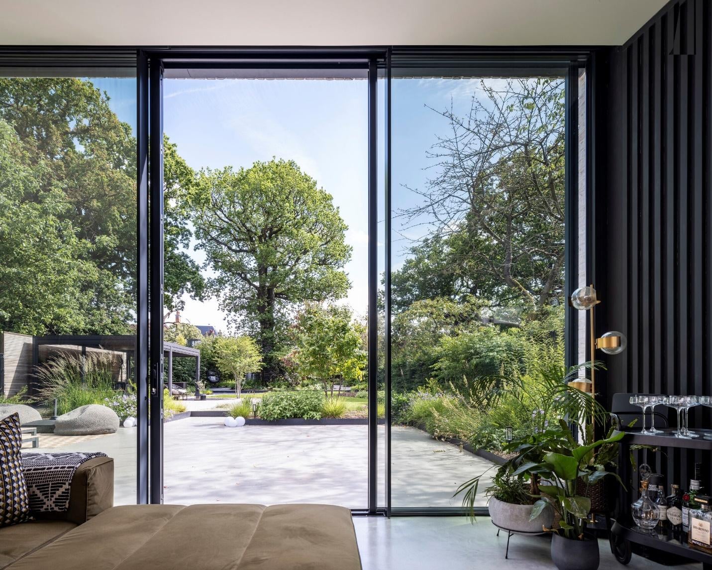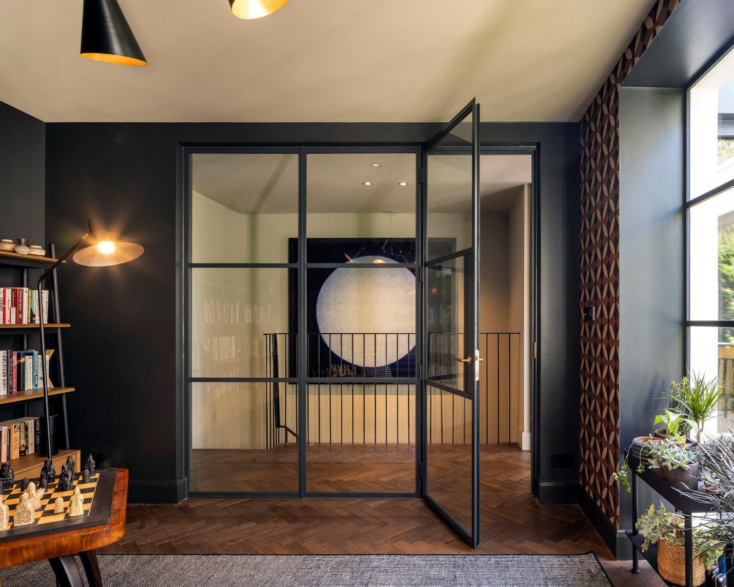 Cửa kính giúp tối ưu hóa ánh sáng tự nhiên. Thiết kế khung mỏng tạo cảm giác không gian mở nhưng vẫn phân chia khu vực rõ ràng