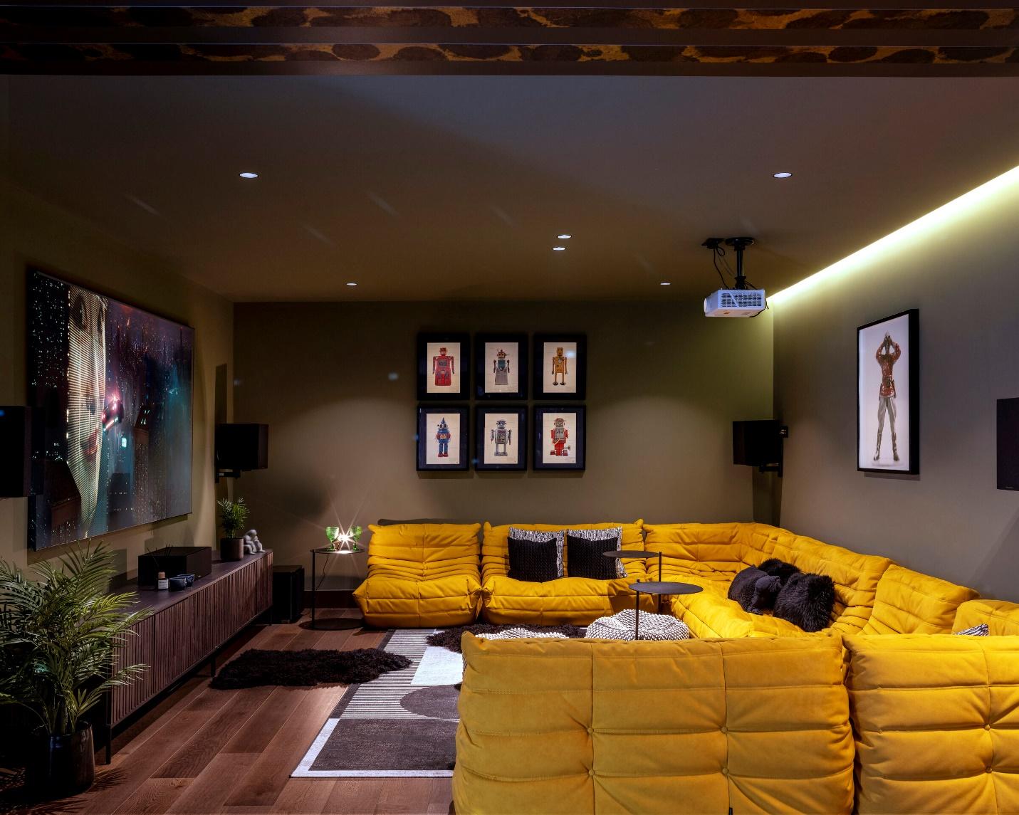 Phòng chiếu phim là nơi cả gia đình tận hưởng những phút giây thư giãn trọn vẹn bên nhau. Bộ sofa màu vàng mù tạt hiện diện như một điểm nhấn ấn tượng