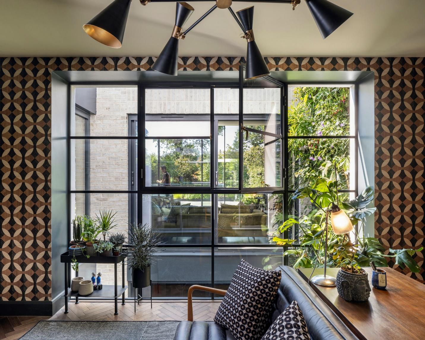 Các chậu cây nhỏ xinh được bố trí khắp phòng, tạo cảm giác tươi mát và gần gũi với thiên nhiên. Cửa sổ kính lớn giúp xóa nhòa ranh giới trong - ngoài