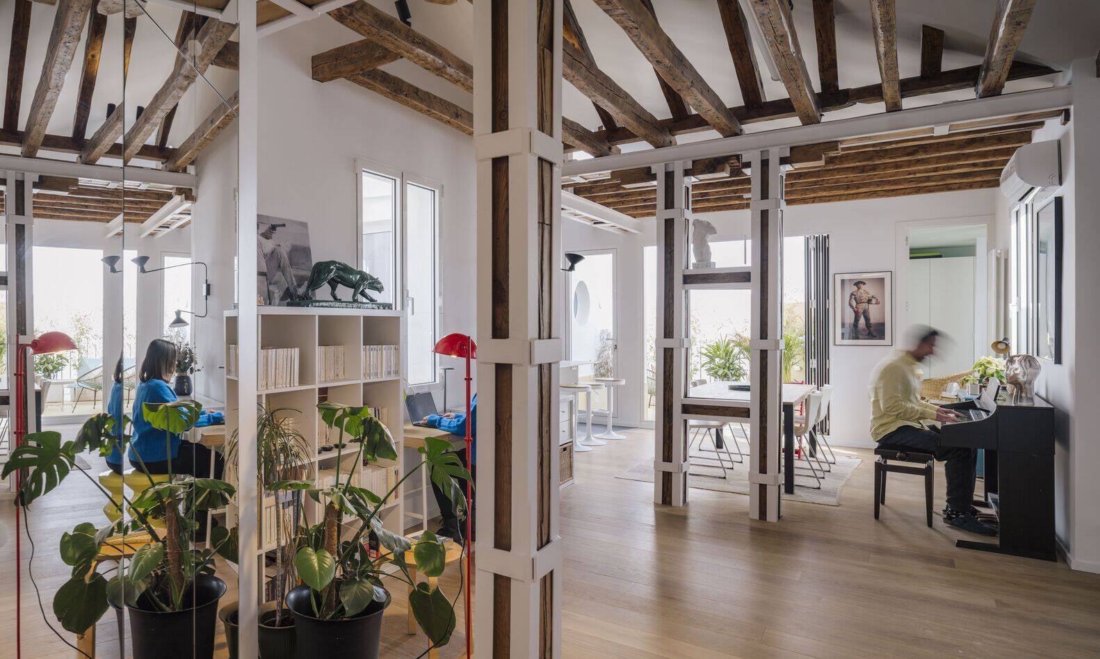 Mặt bằng công trình Tropical Chalet được phân chia thành hai khu vực: không gian mở với hiên nhà lớn và không gian chức năng bên trong. Tại không gian mở, gia chủ bố trí nhiều bàn ghế để các thành viên trong nhà có thể tận hưởng nắng và không khí trong lành chạm đến từng cảm nhận của mình. Bên cạnh đó, một phòng ăn mở cũng được đặt tại khu vực này và kết nối với phòng bếp phía trong.
