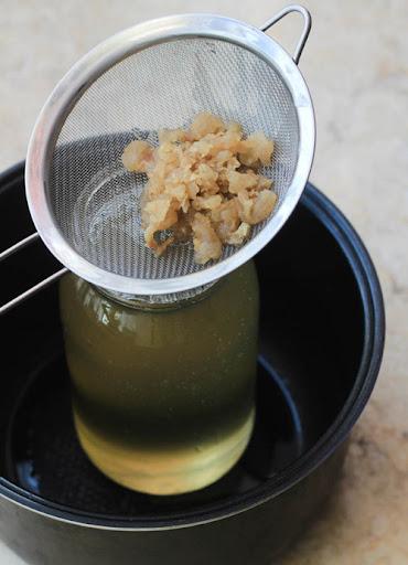 • Đổ mỡ nước qua rây vào bát hoặc tô sạch.